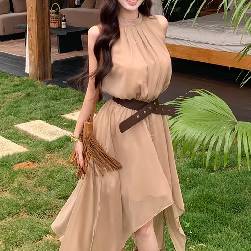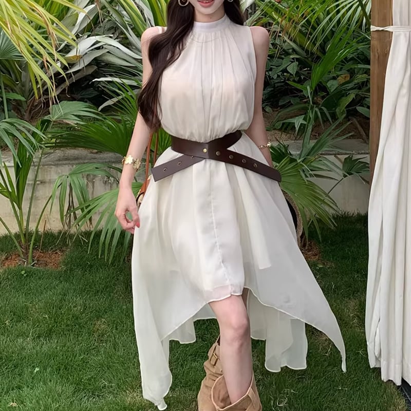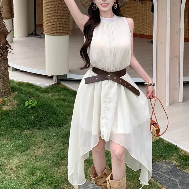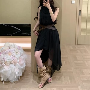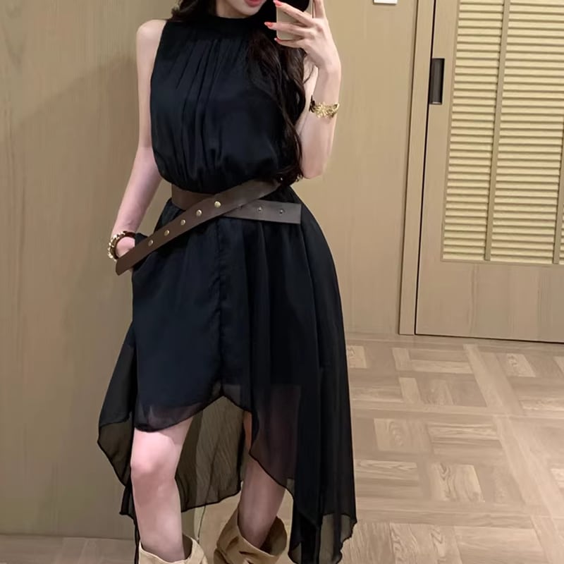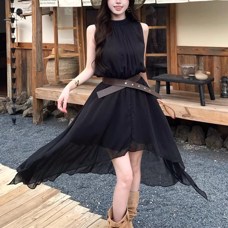 【dress】ベルト付きノースリーブシフォンイレヘムワンピース Q8263