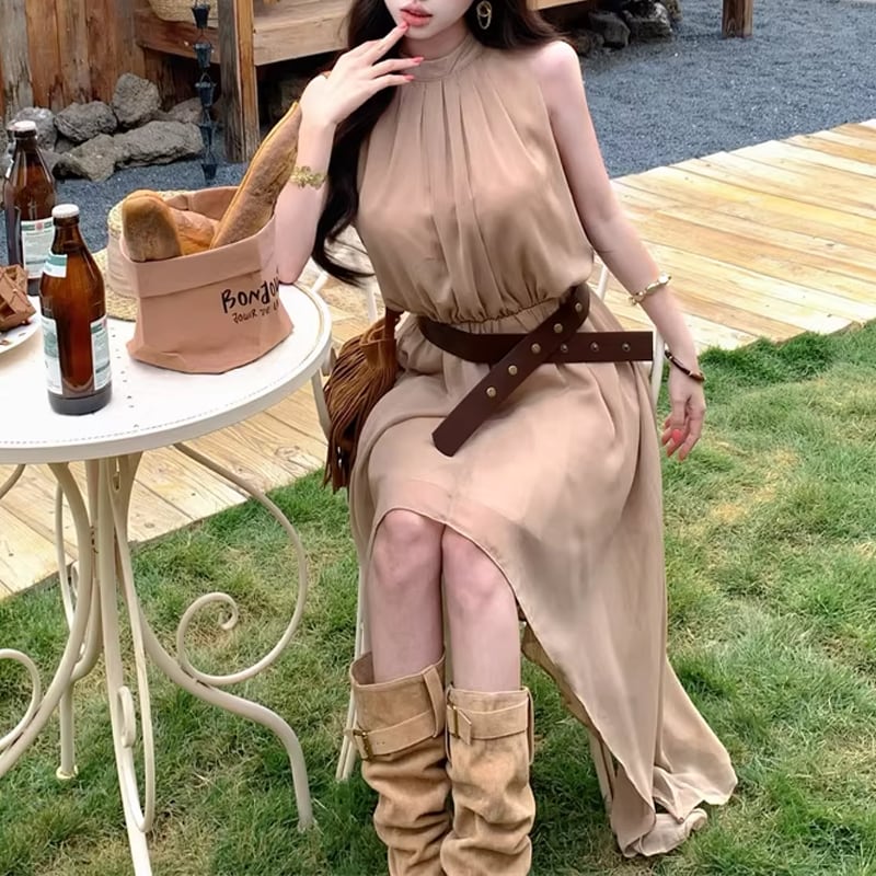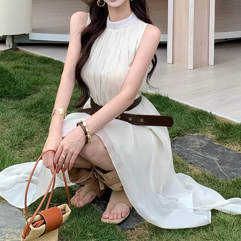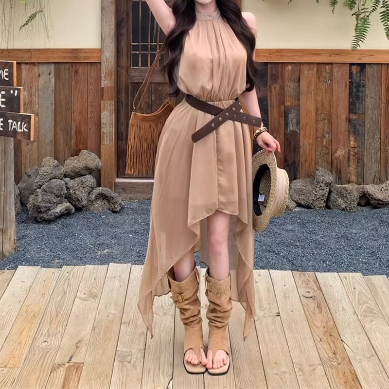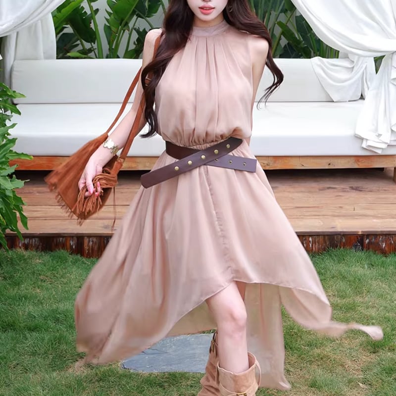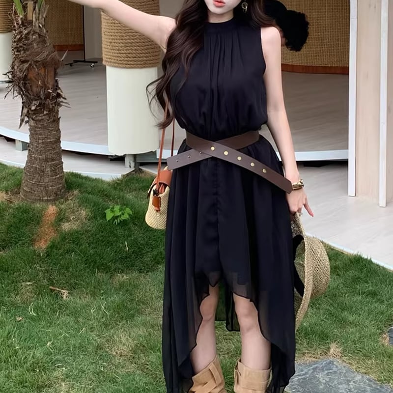【dress】ベルト付きノースリーブシフォンイレヘムワンピース Q8263