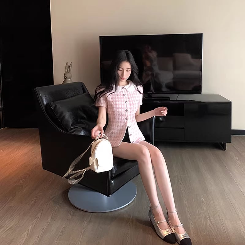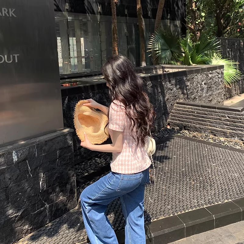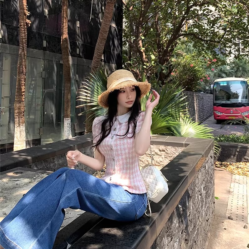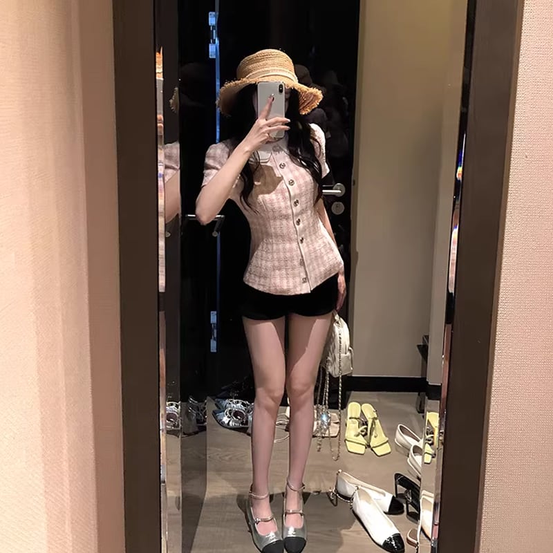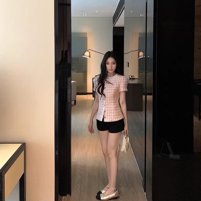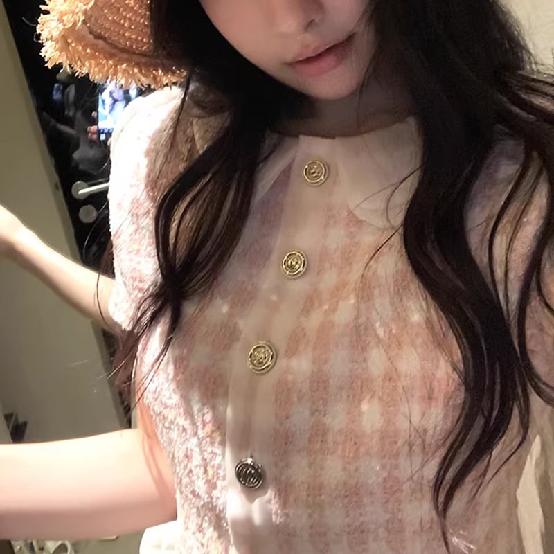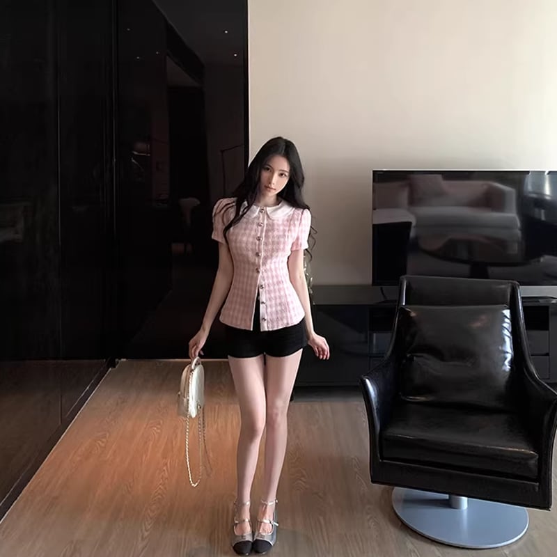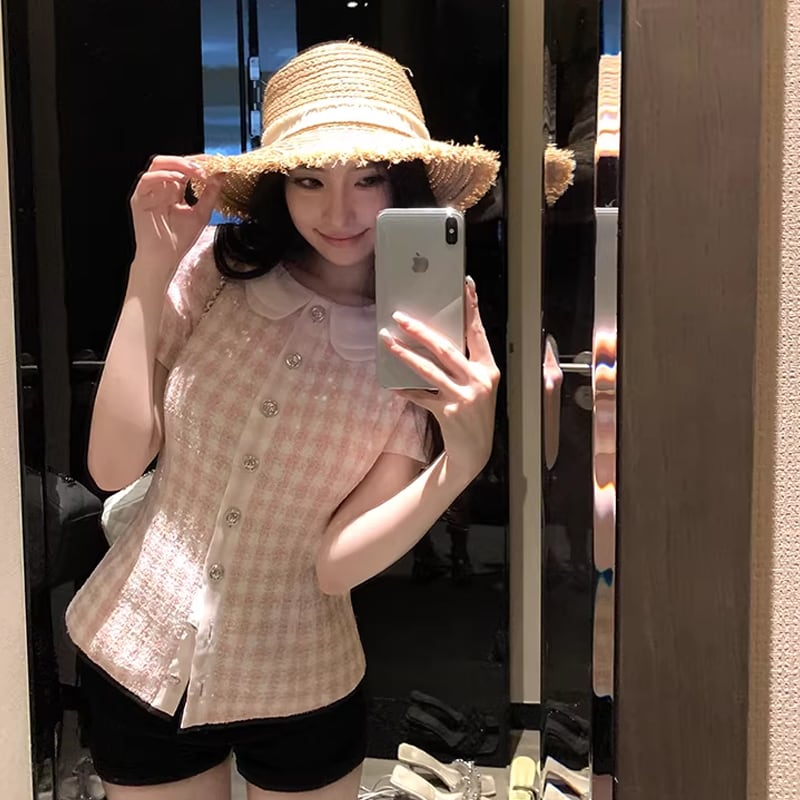 【tops】半袖チェック柄ピーターパンカラートップス Q8274