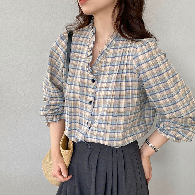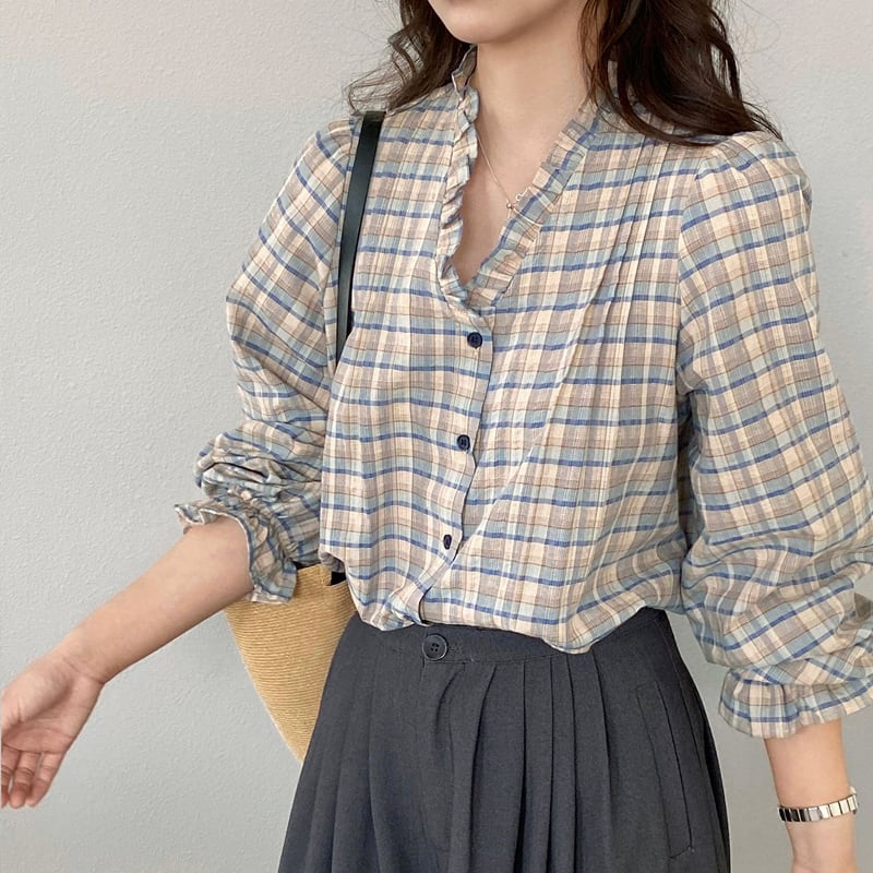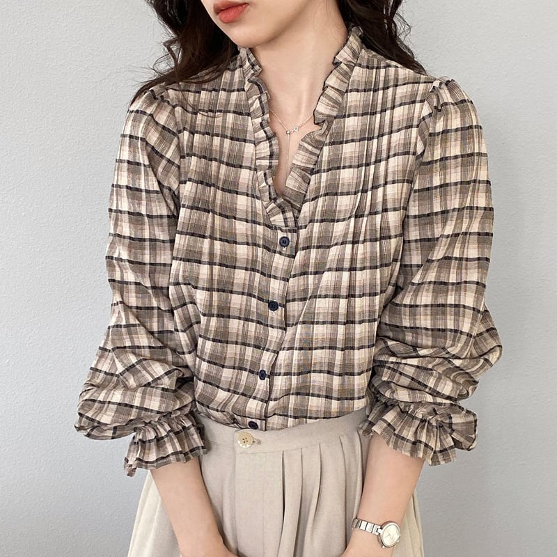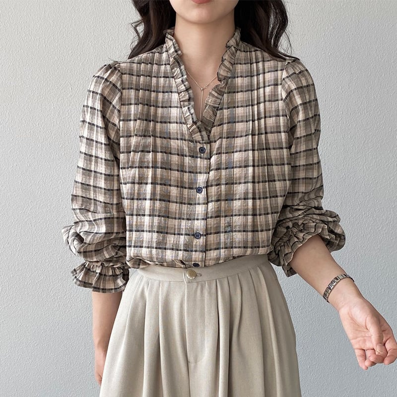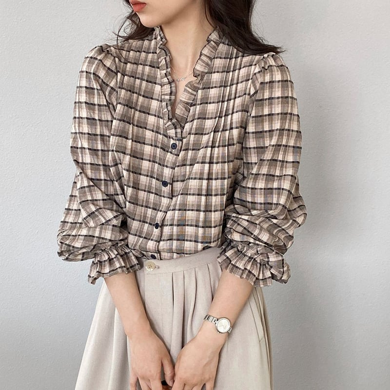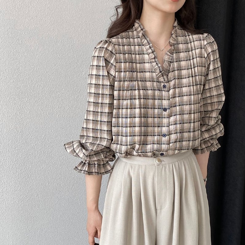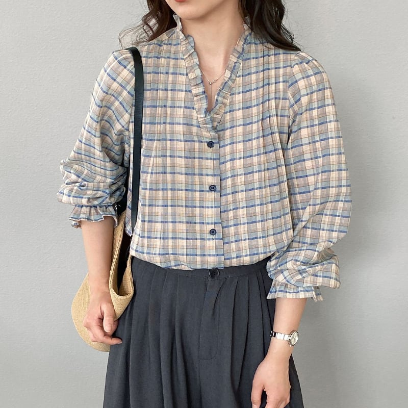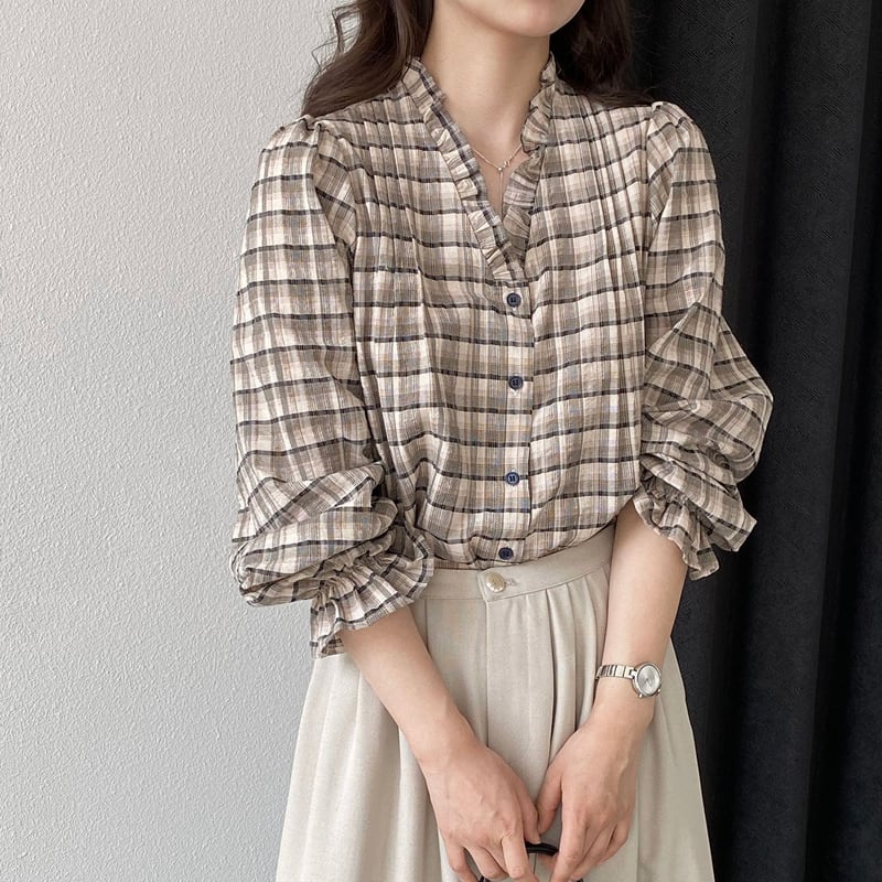 【tops】ギャザーフリル付きチェック柄トップス Q8281