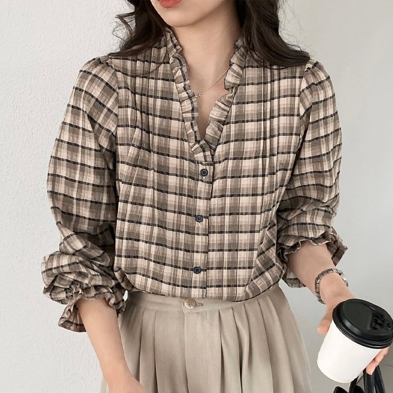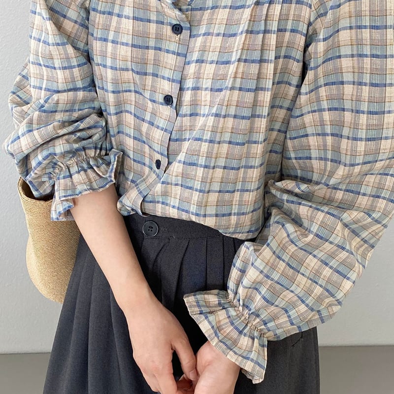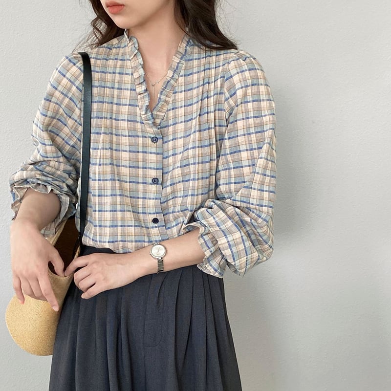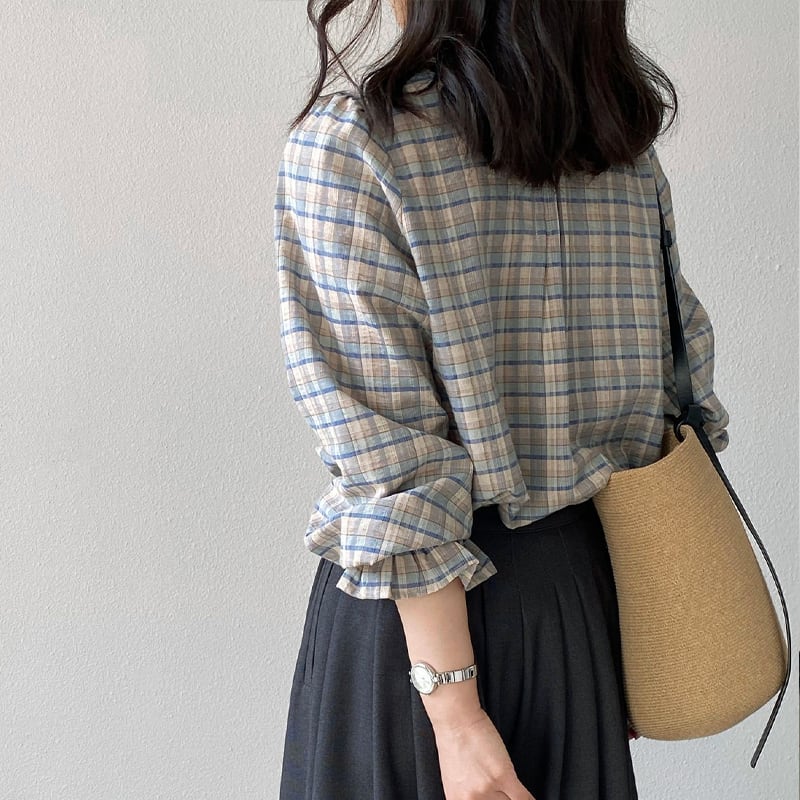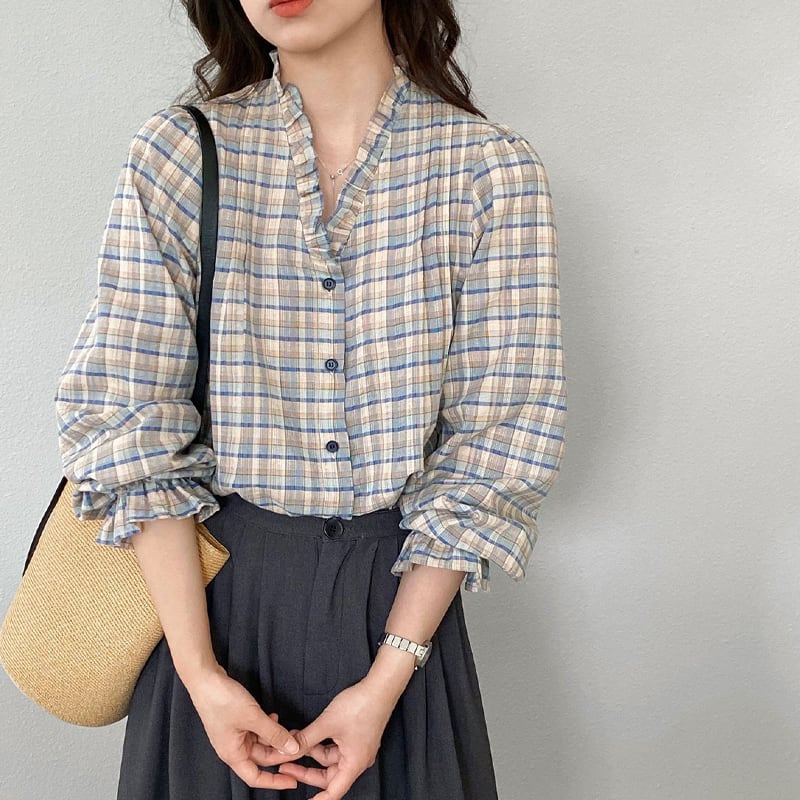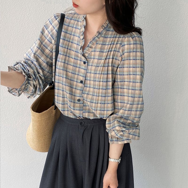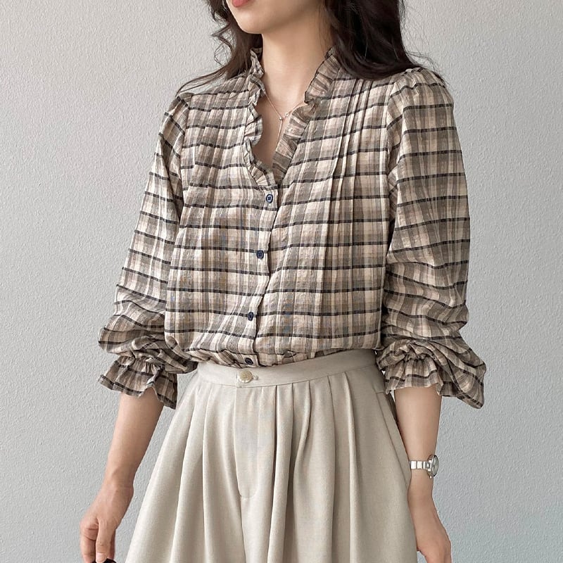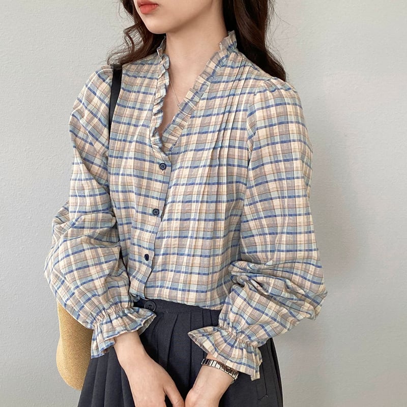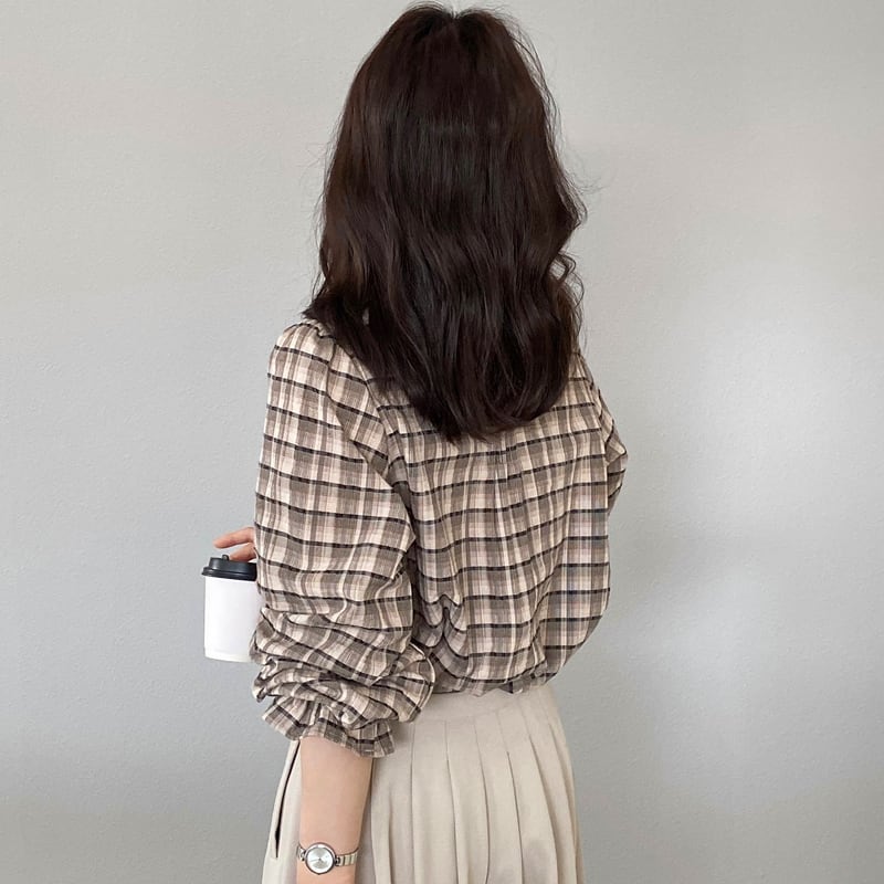 【tops】ギャザーフリル付きチェック柄トップス Q8281