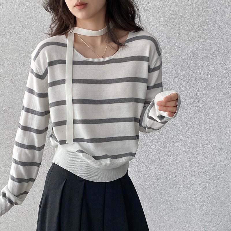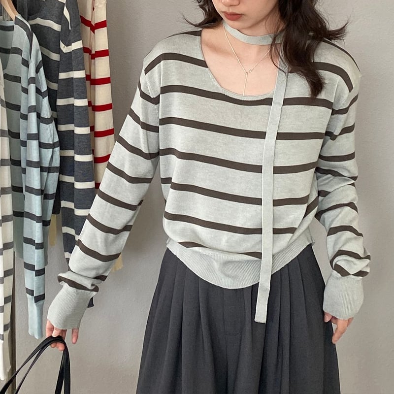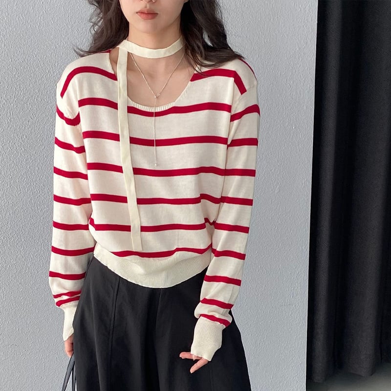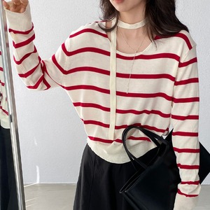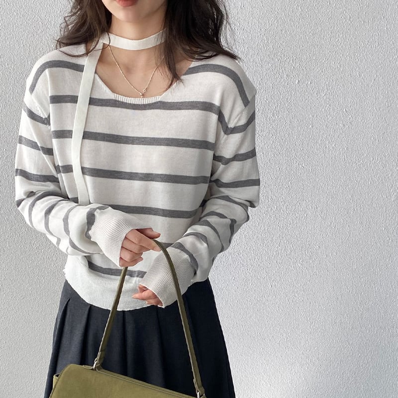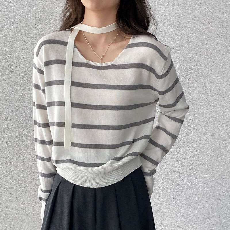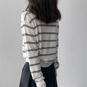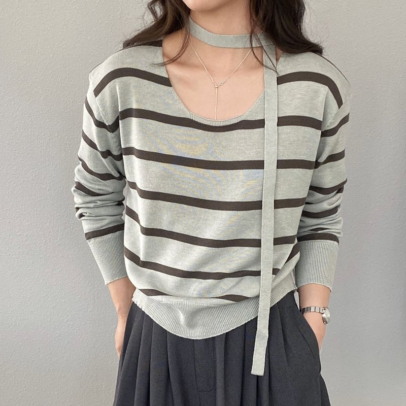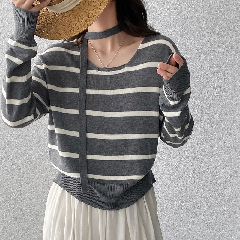 【tops】スカーフ付きボーダー柄ニットトップス Q8284