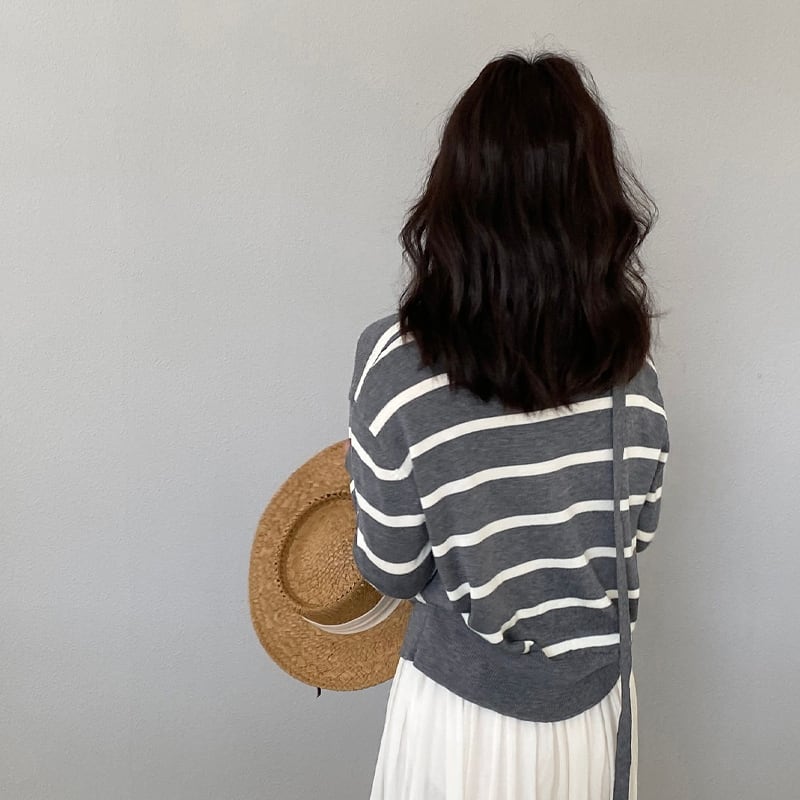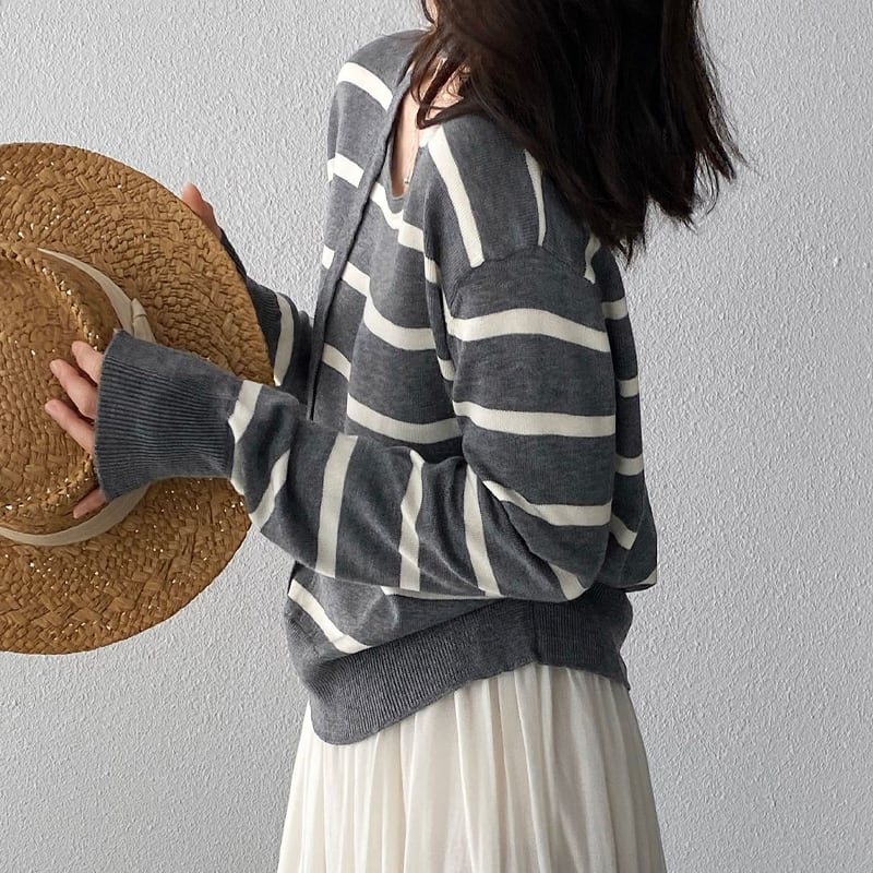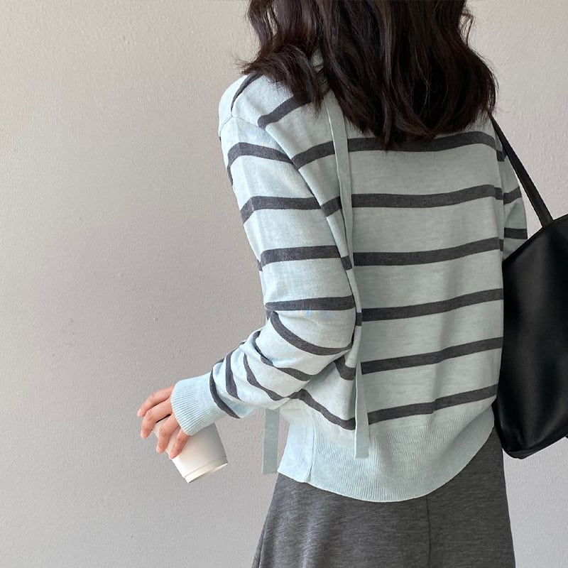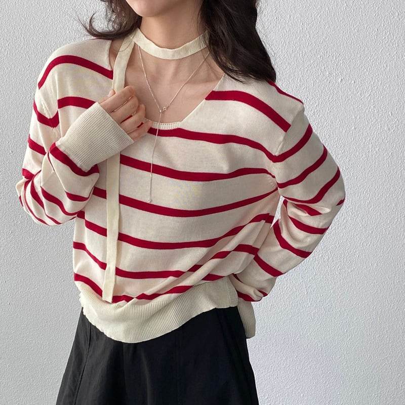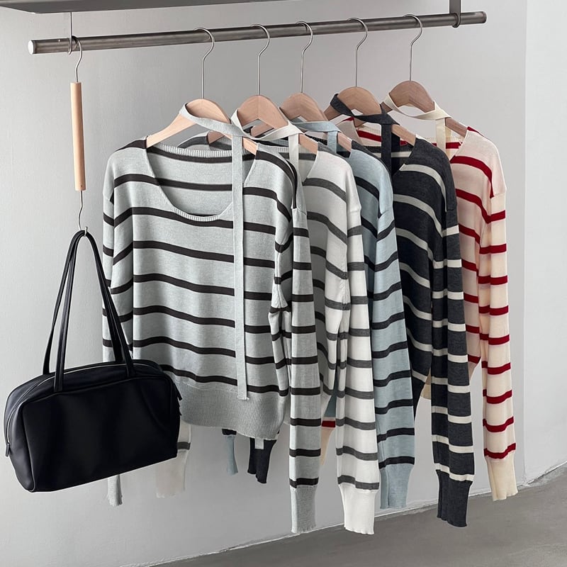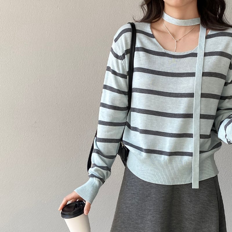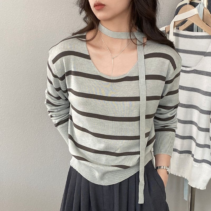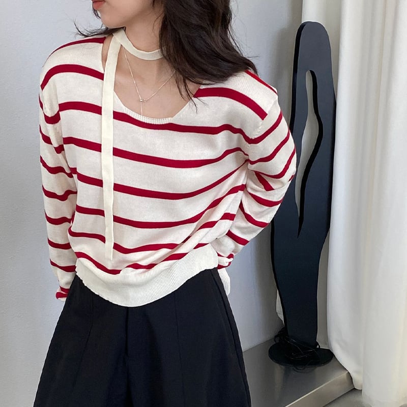 【tops】スカーフ付きボーダー柄ニットトップス Q8284