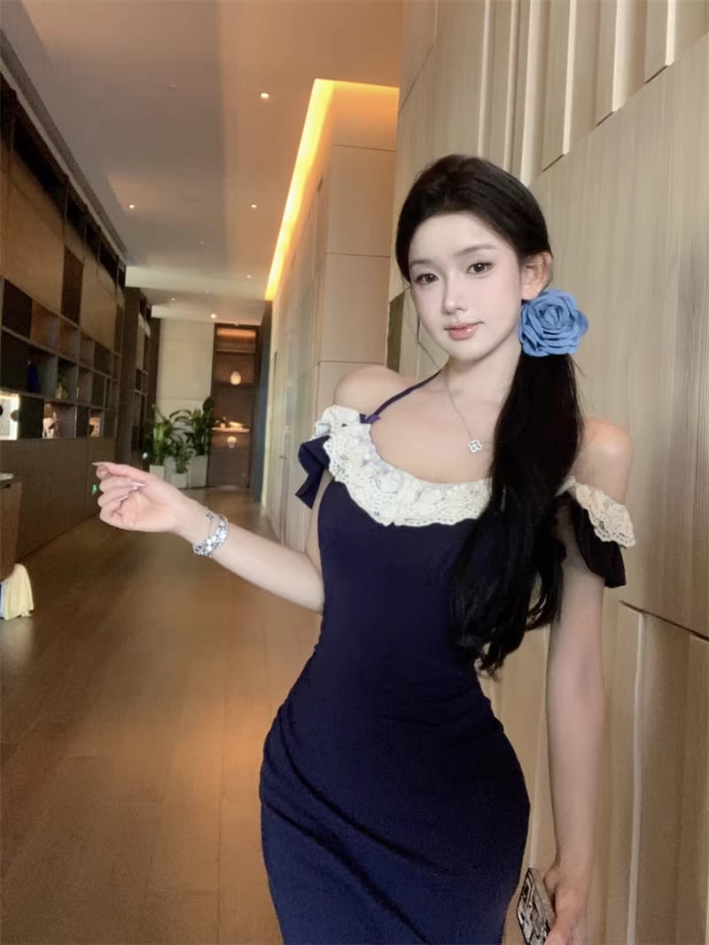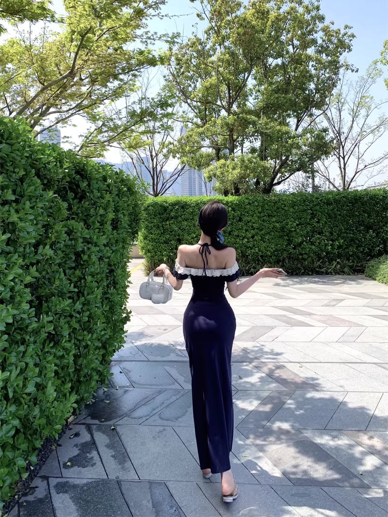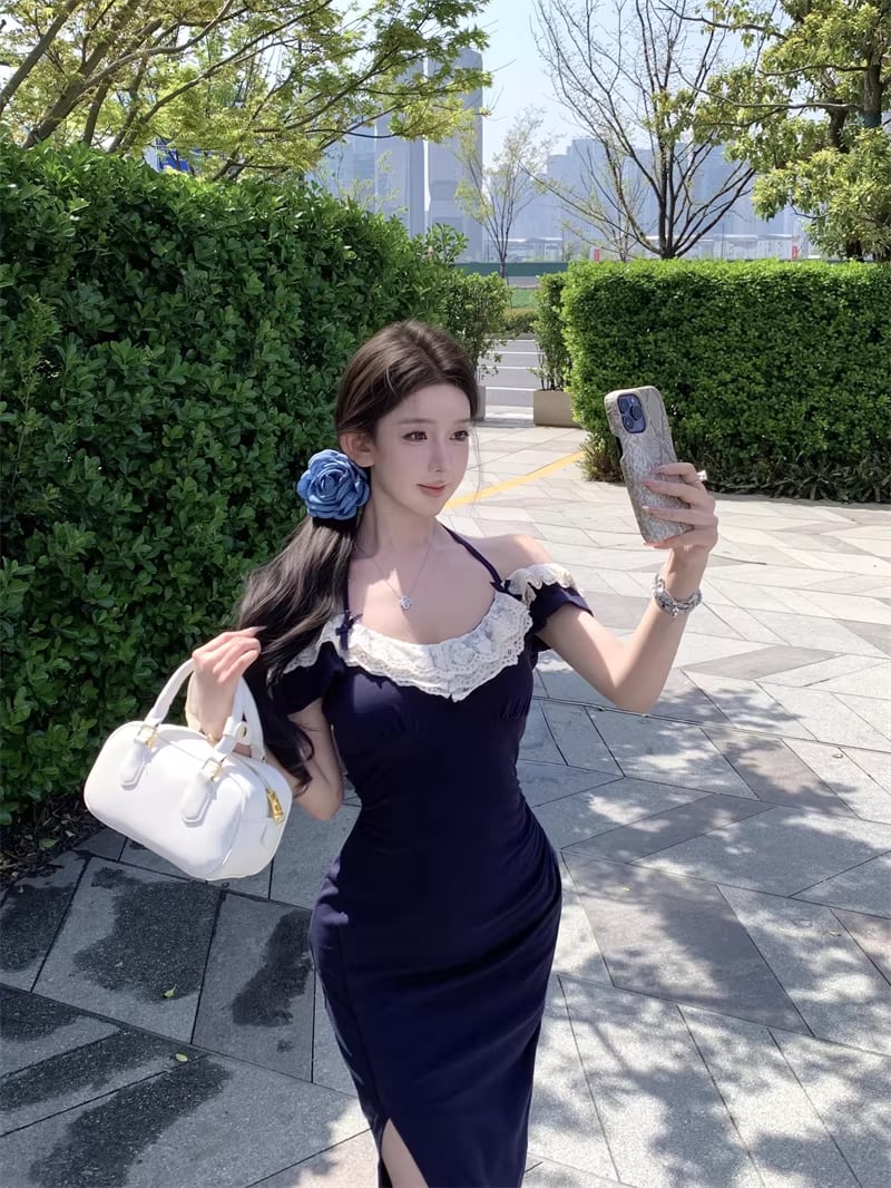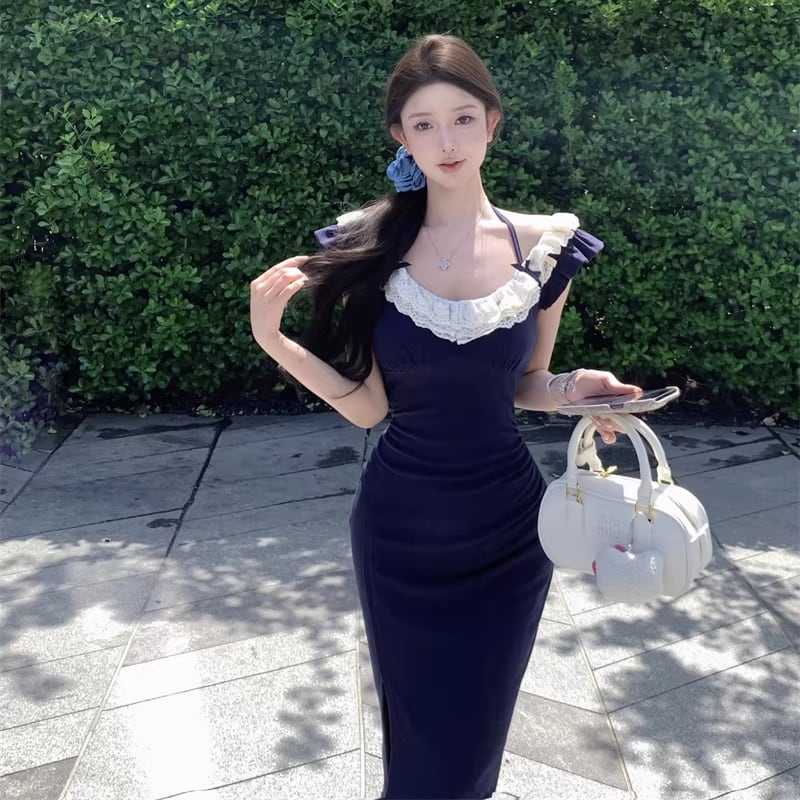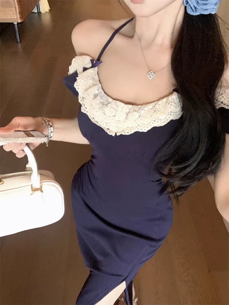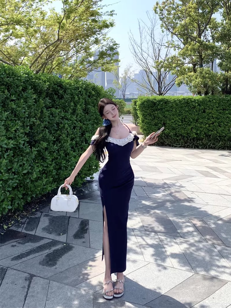 【dress】スリット入れレースドッキングロングワンピース Q8315