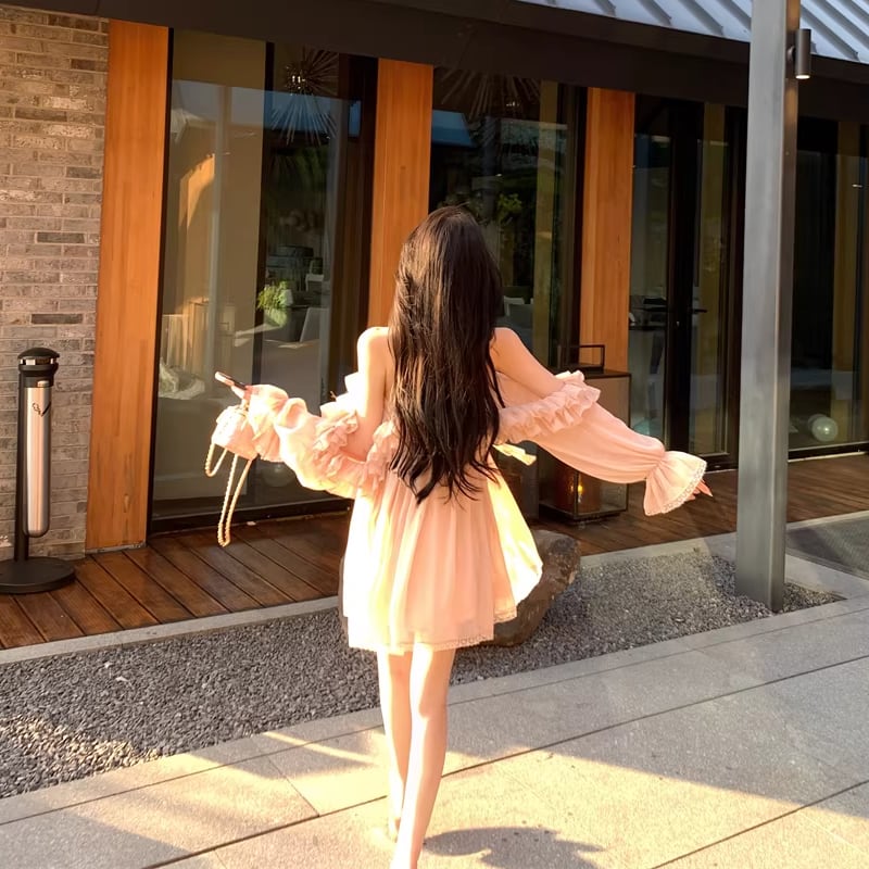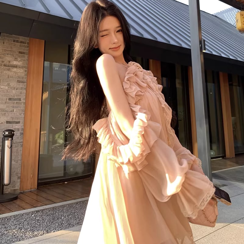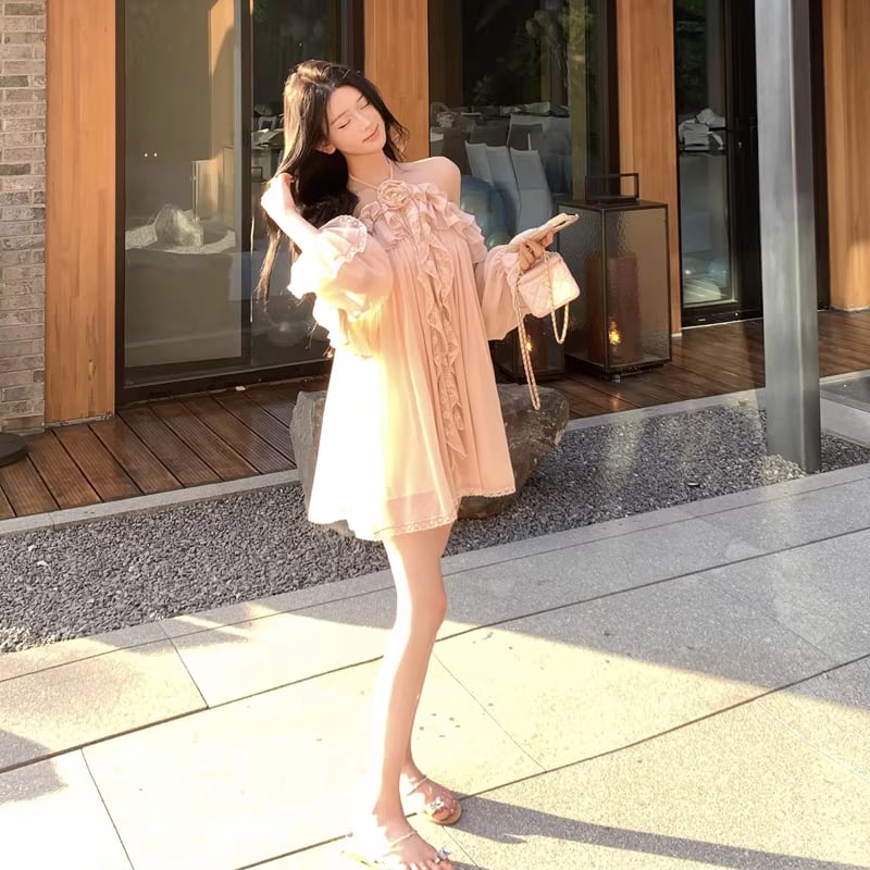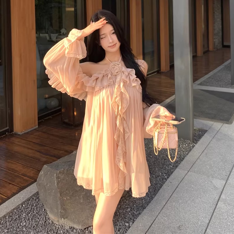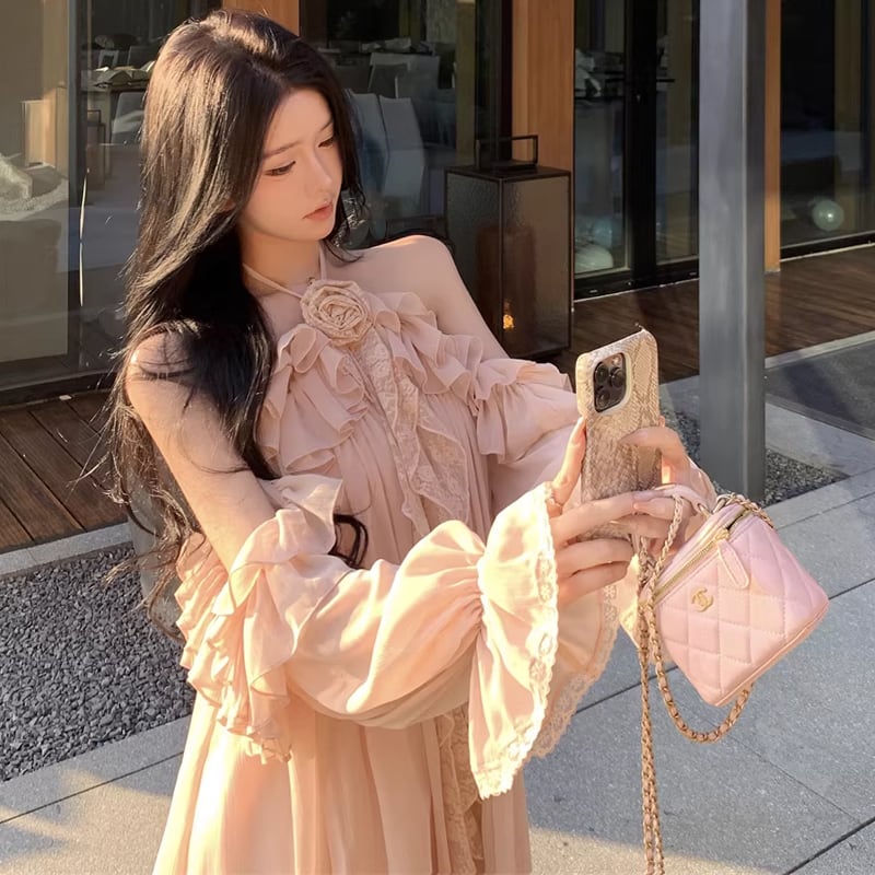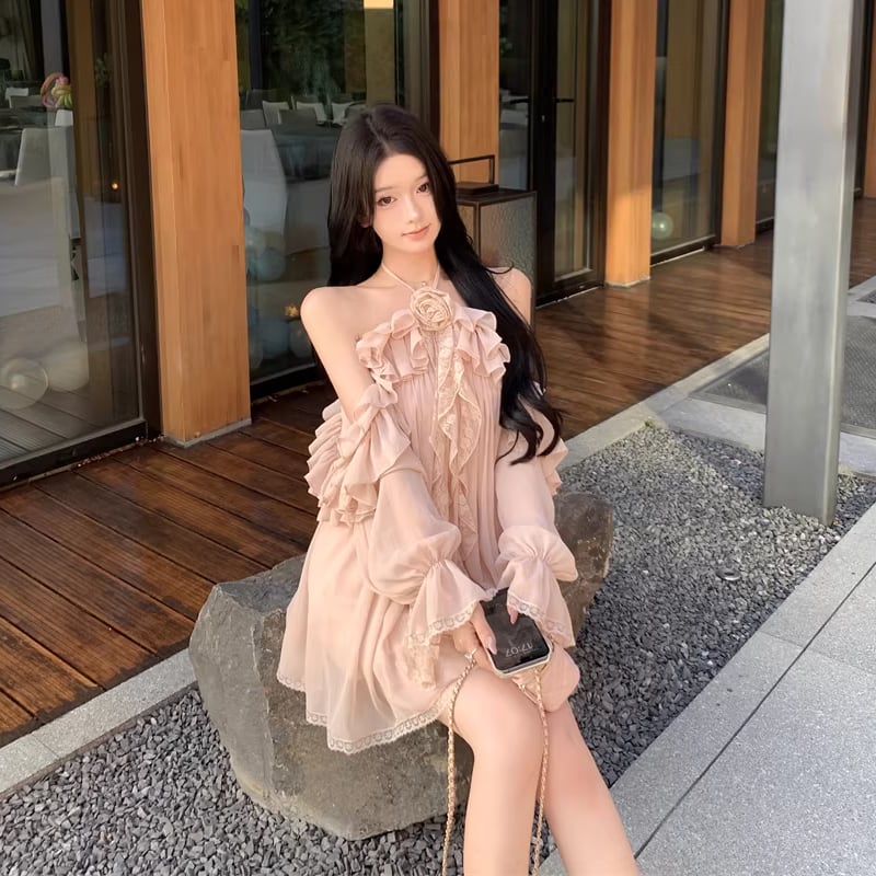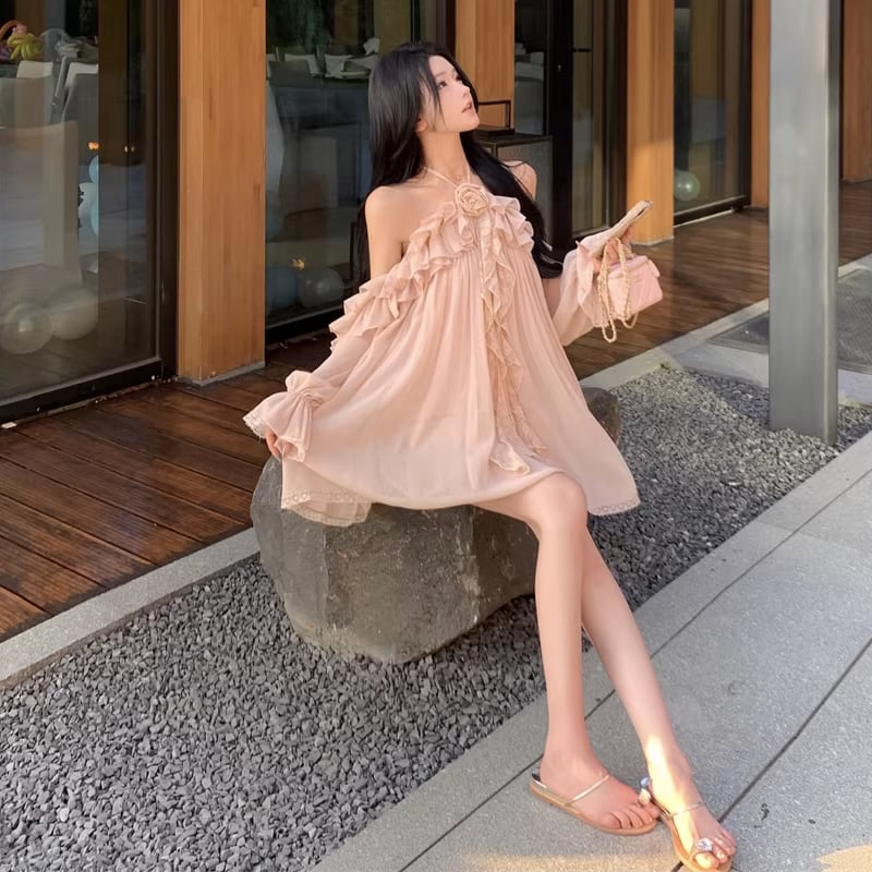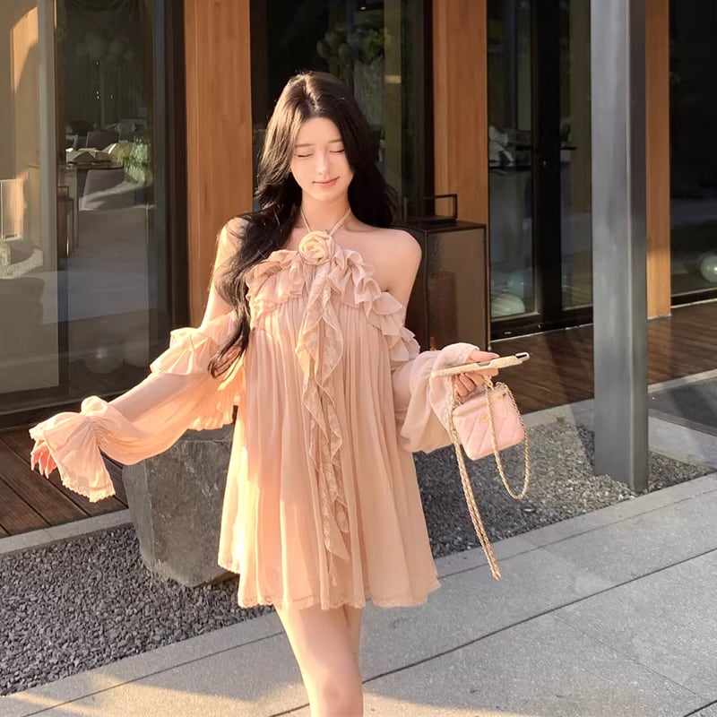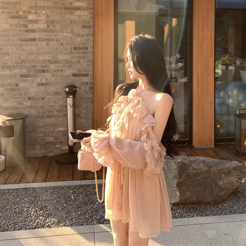 【dress】ホルターネックギャザーフリルワンピース Q8317