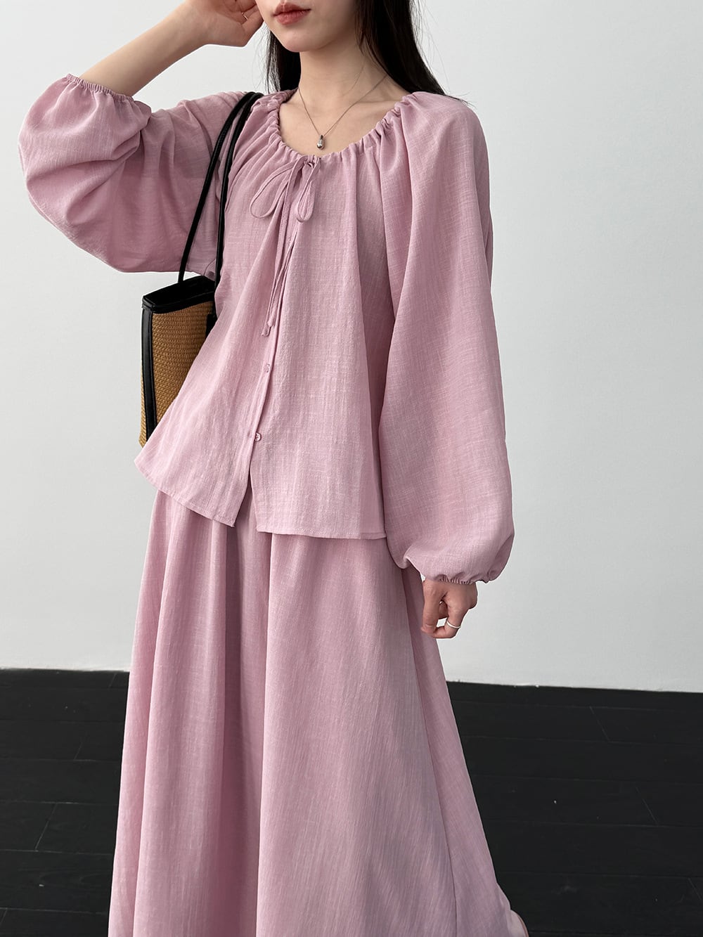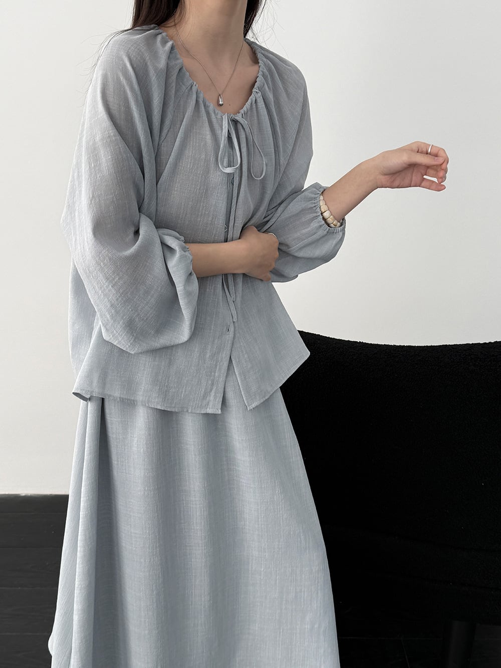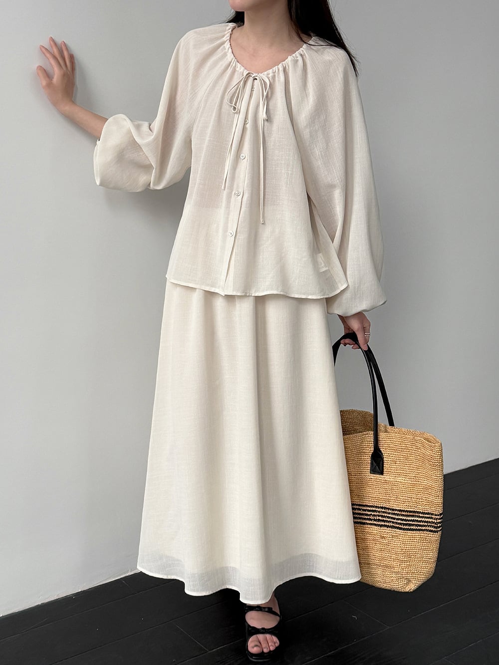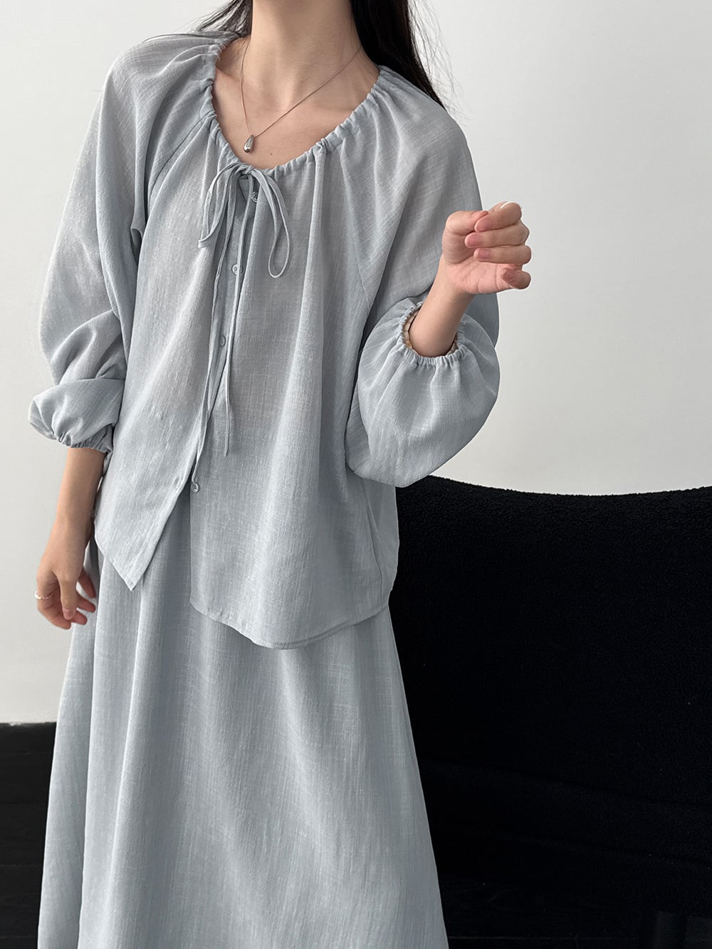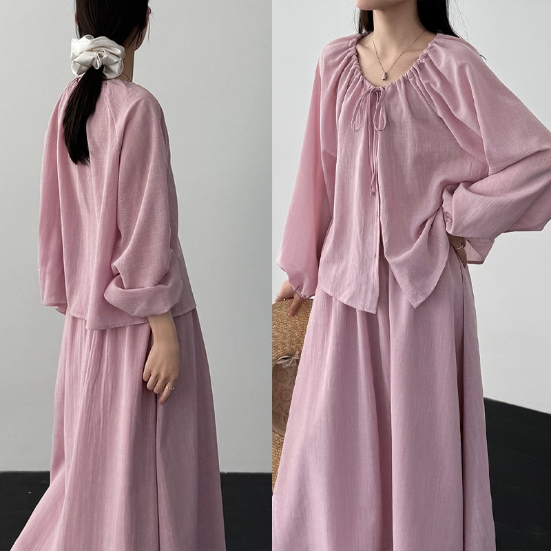 【set】リボン付きトップス×ロングスカートセット Q8324