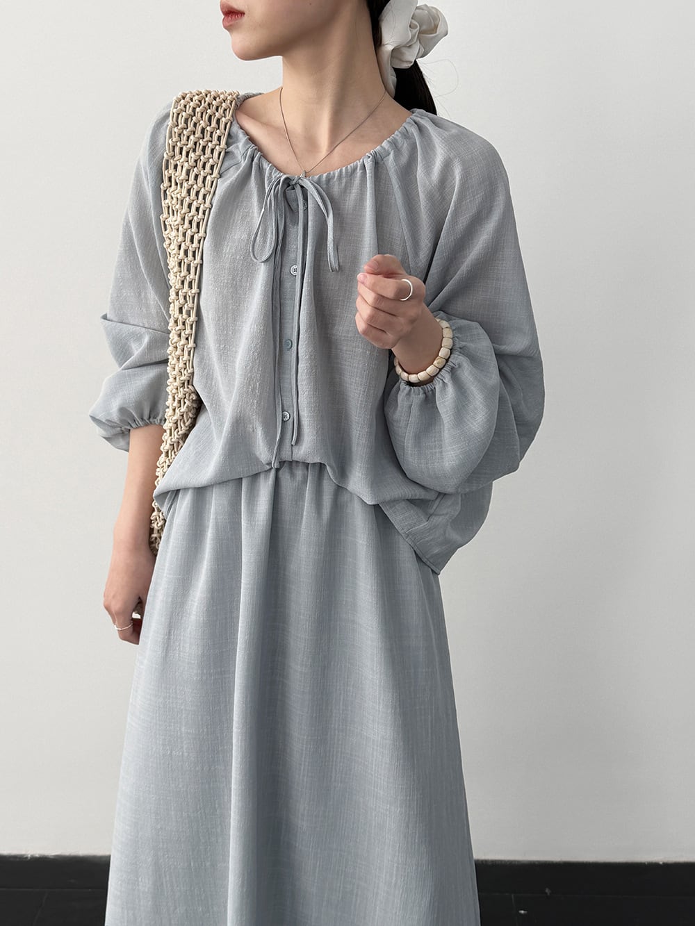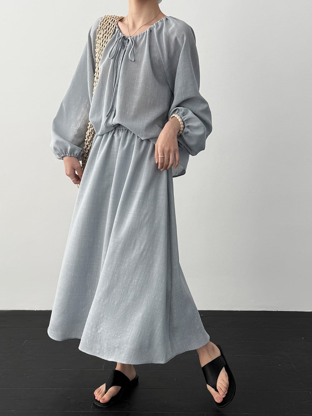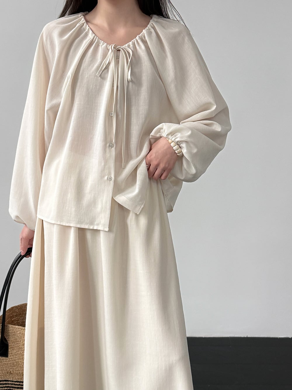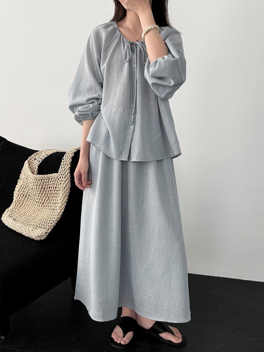 【set】リボン付きトップス×ロングスカートセット Q8324