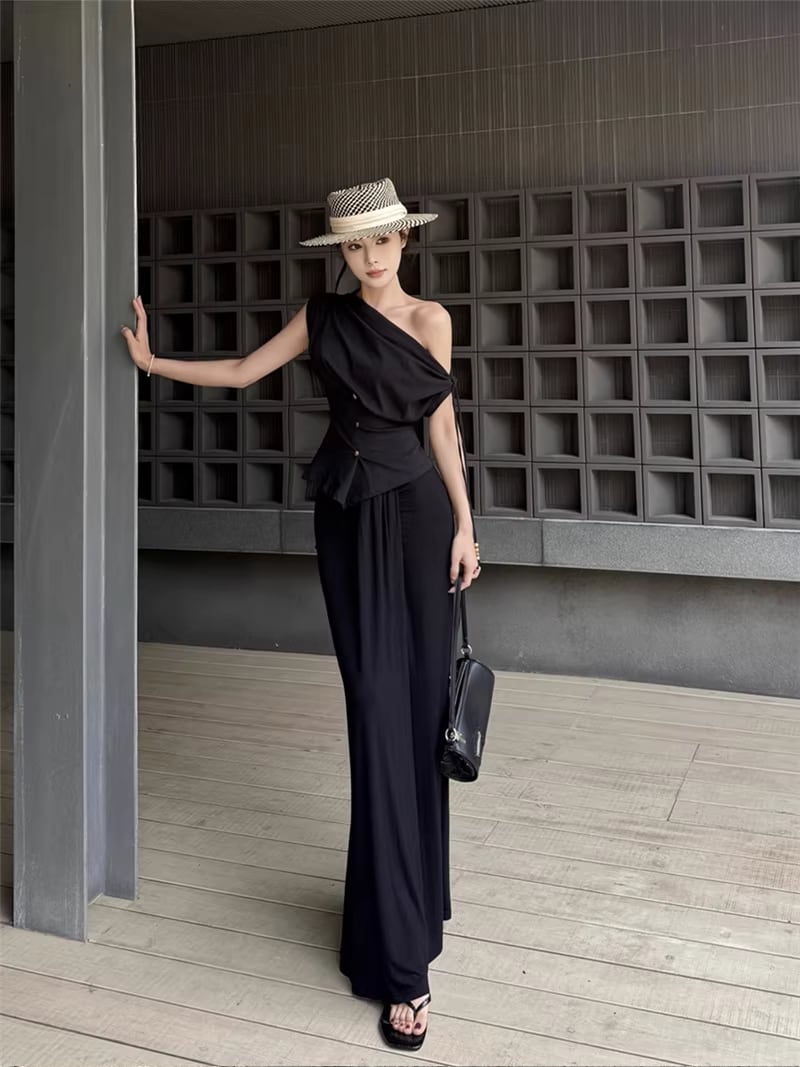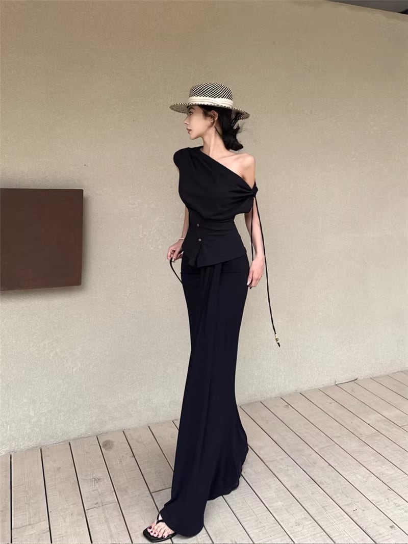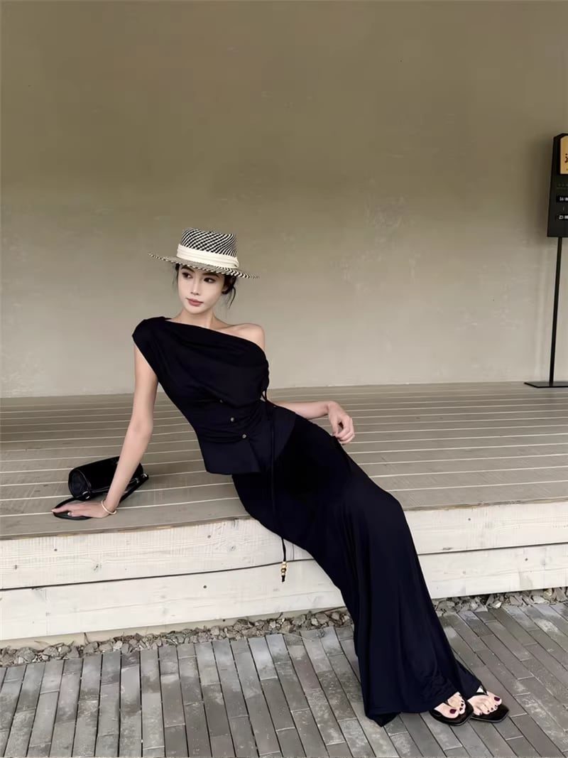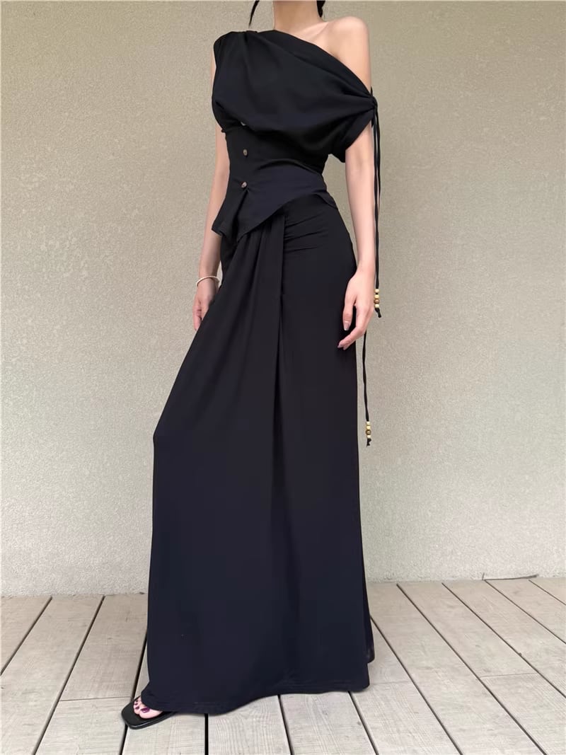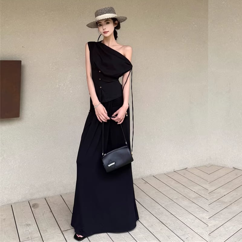 【set】ストラップ付ノースリーブトップス×ロングスカートセット Q8347