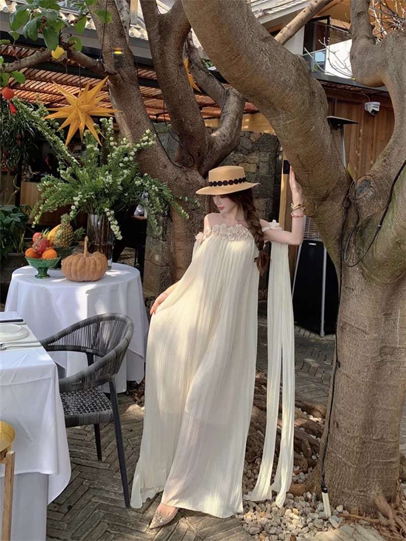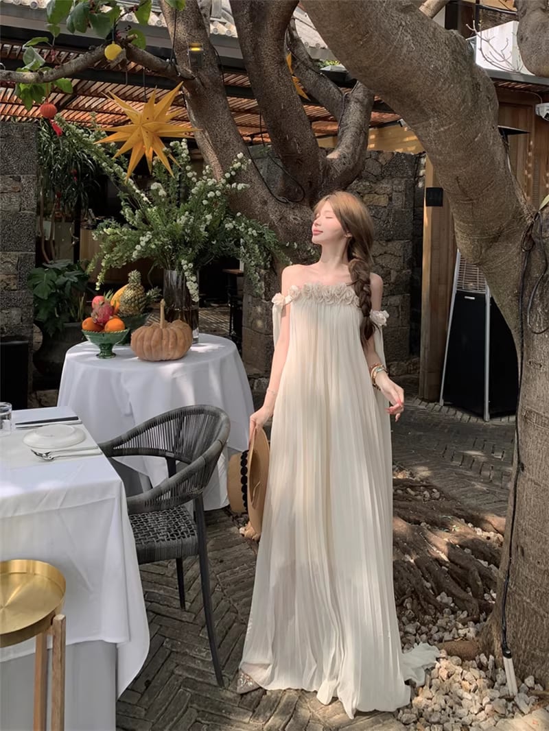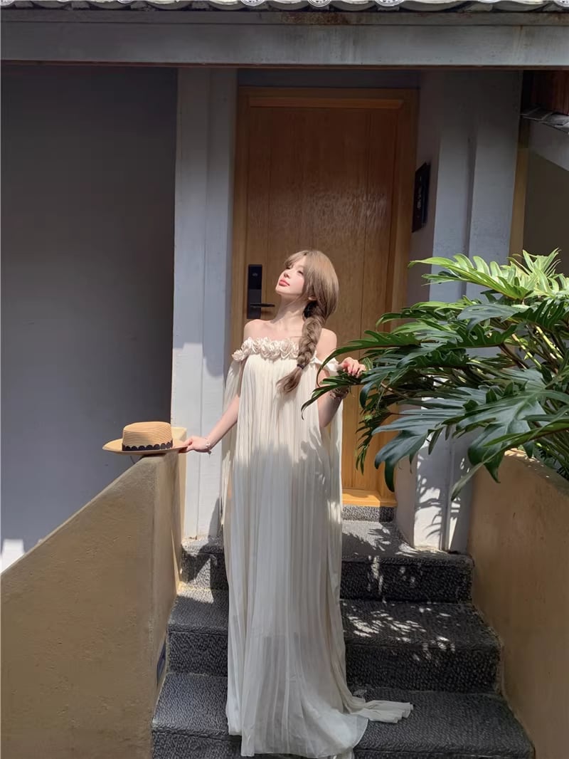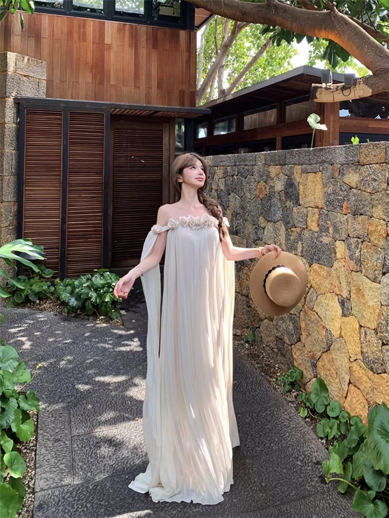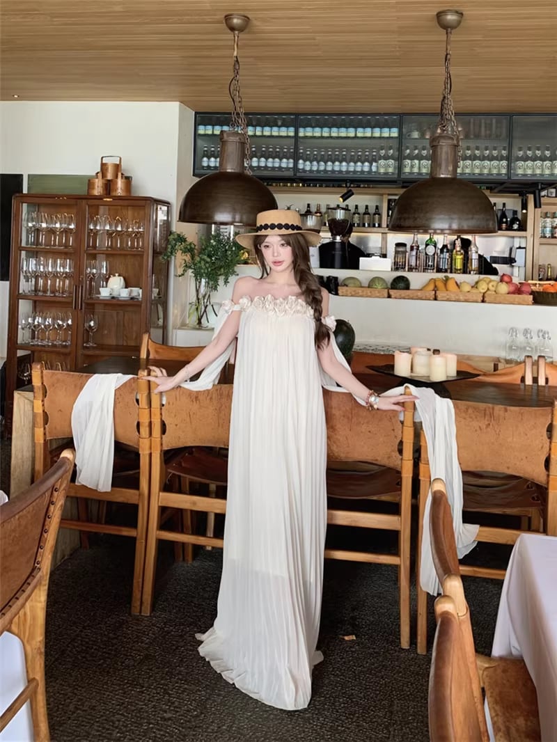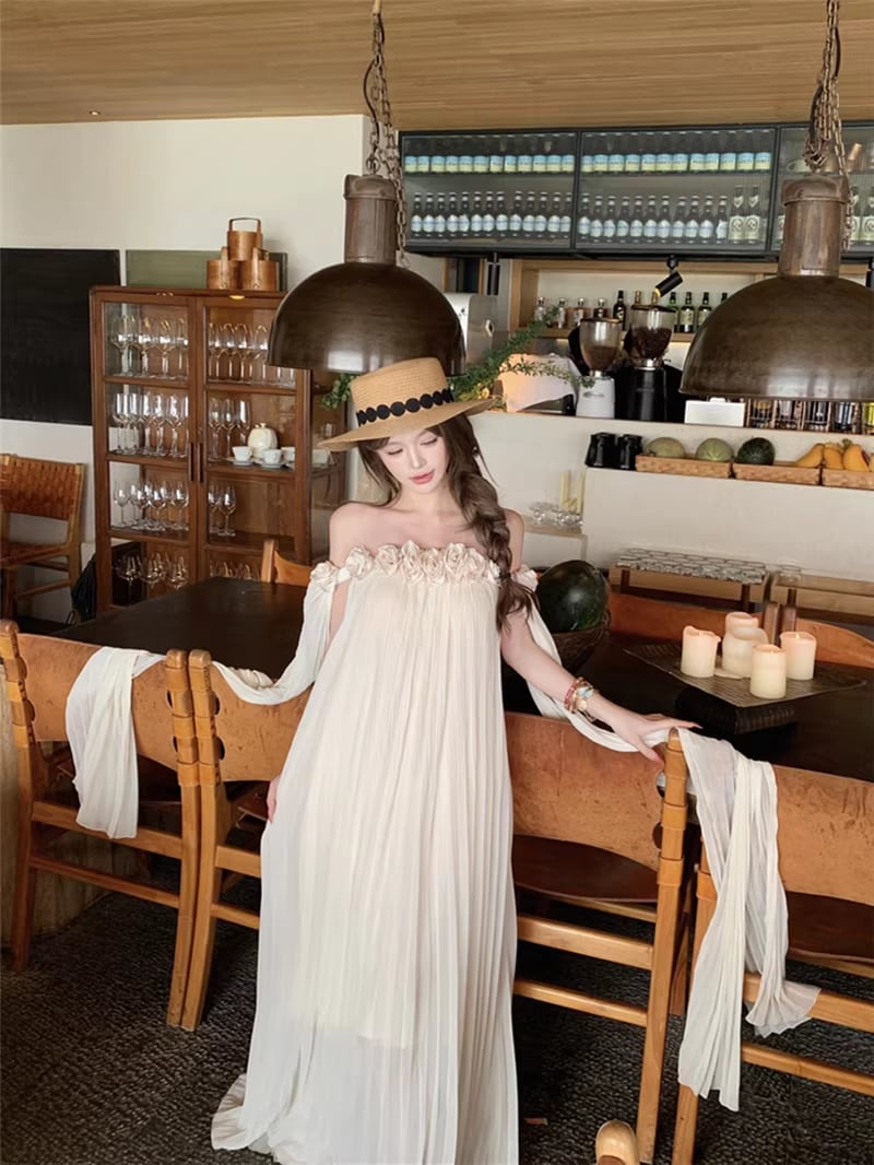 【dress】立体感フラワー付きオフショルダーワンピース Q8351