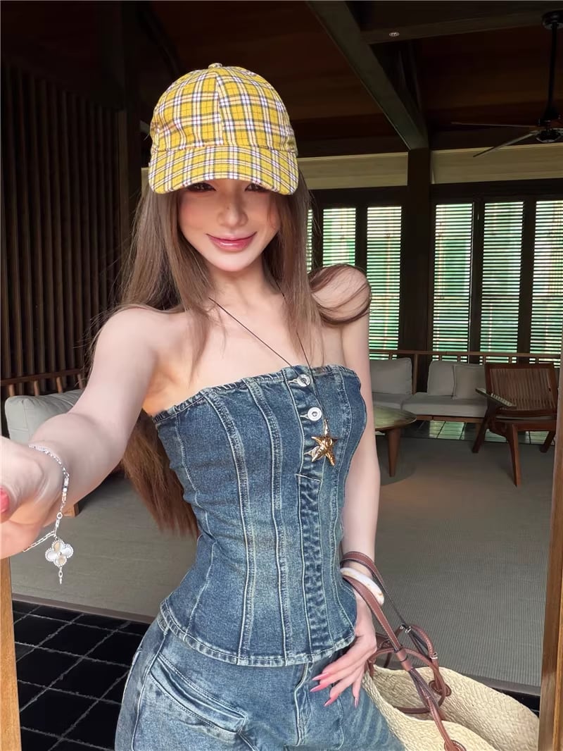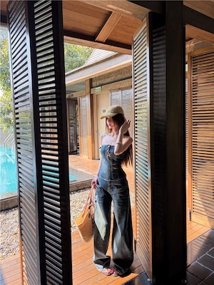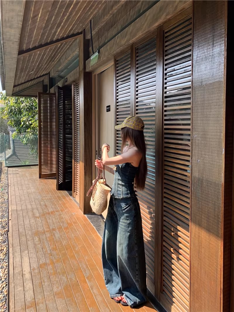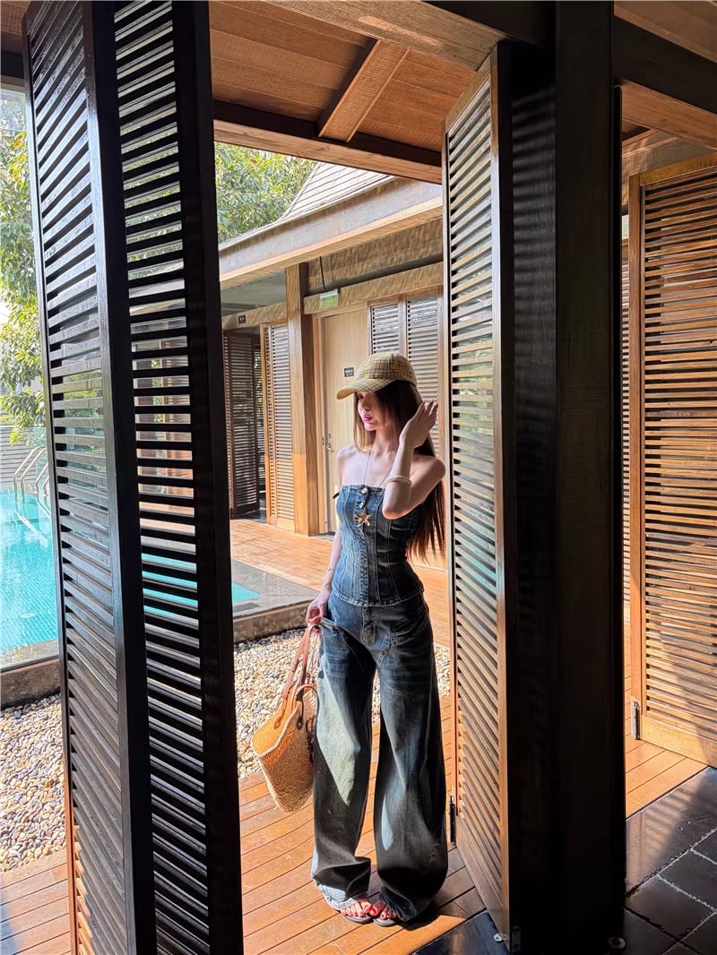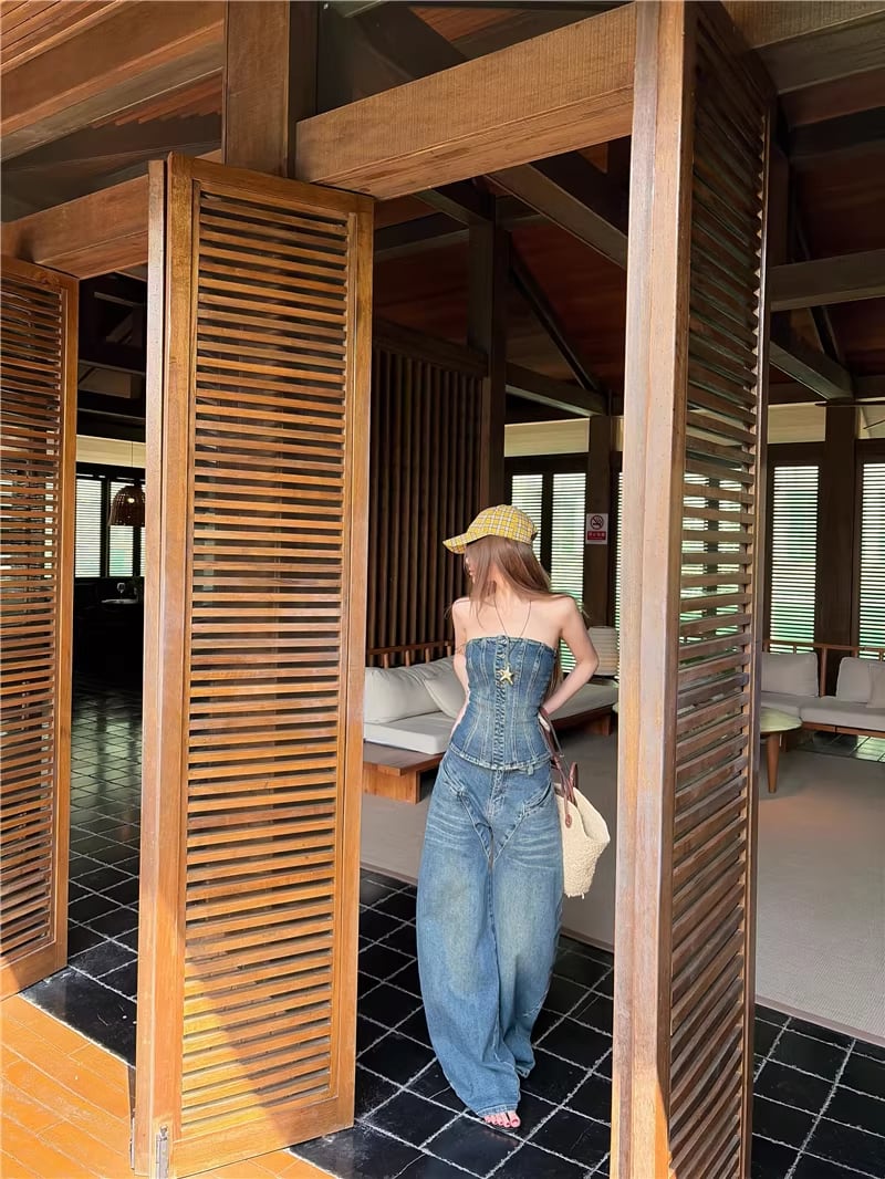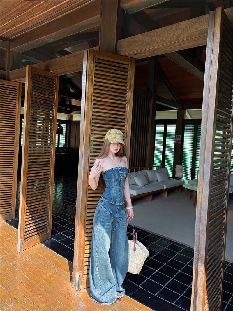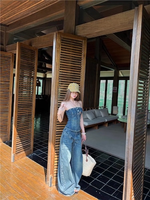 【set】デニムチューブトップス×デニムワイドパンツセット Q8365
