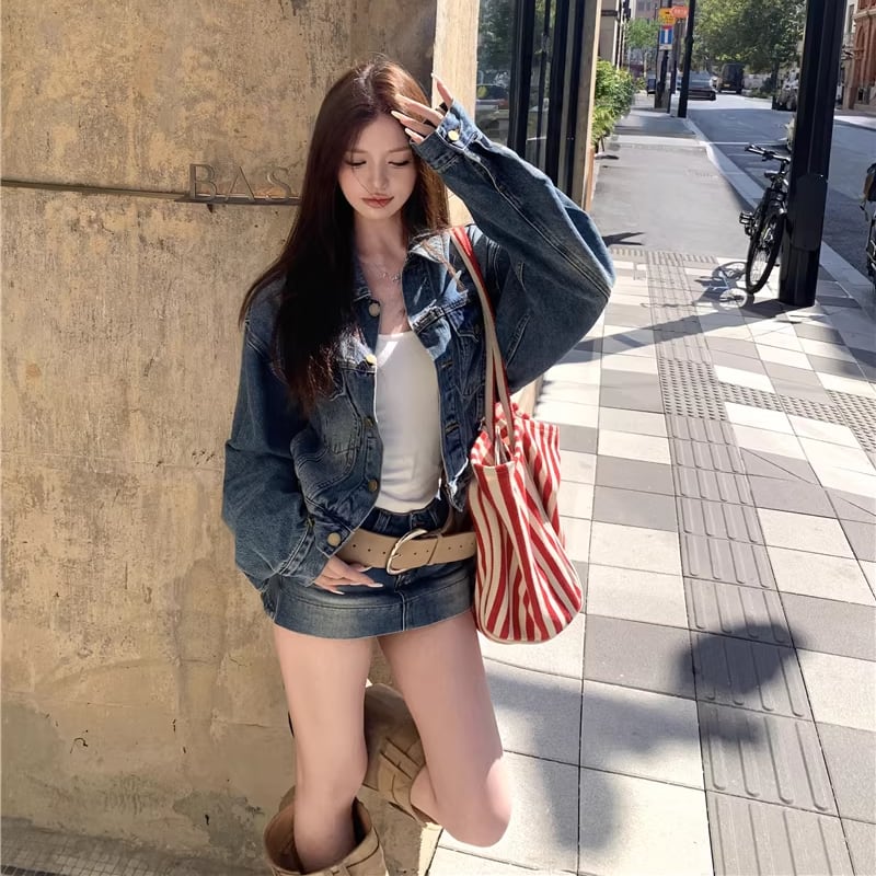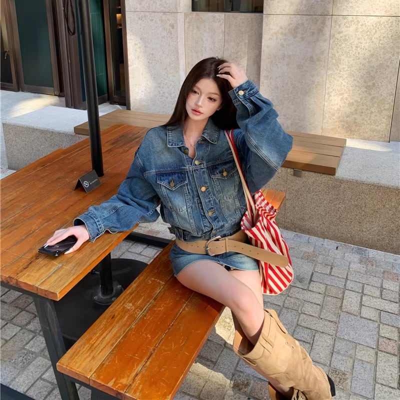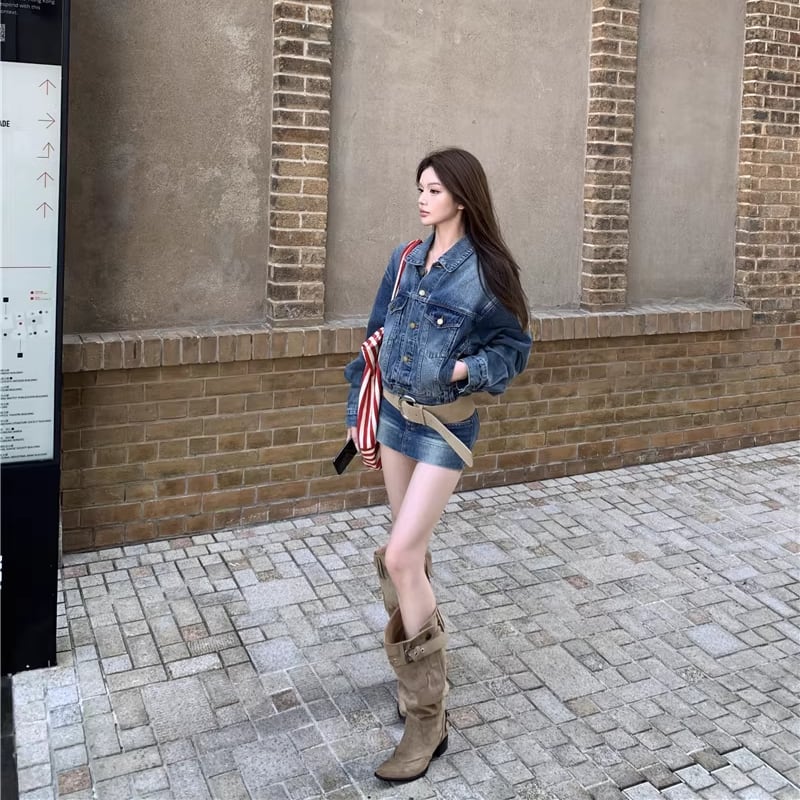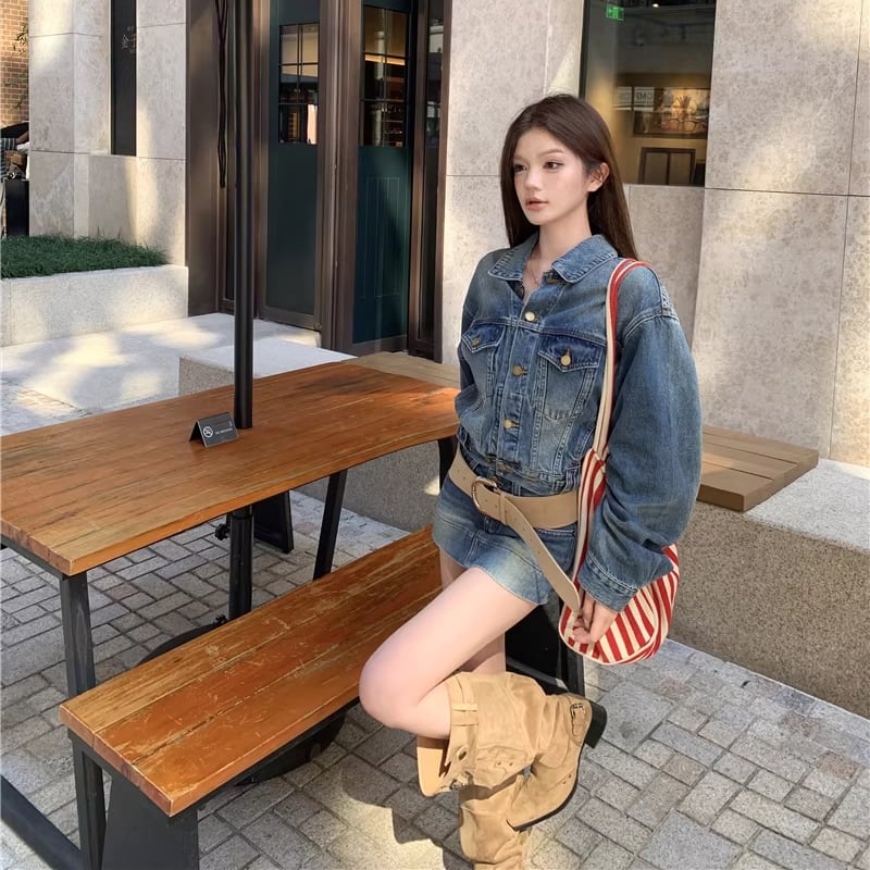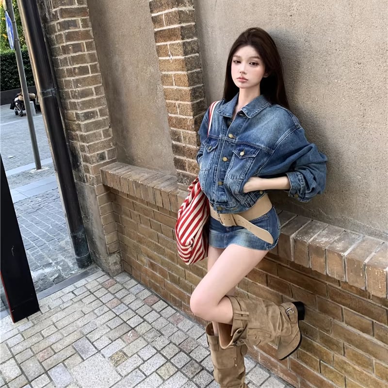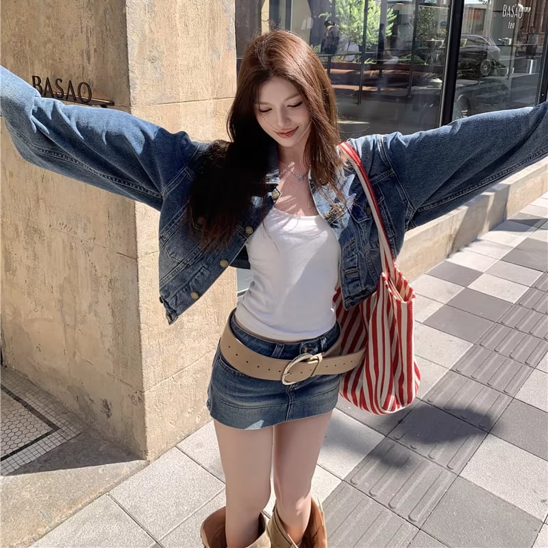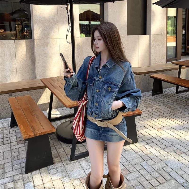 【set】デニムジャケット×ベルト付きデニムミニスカートセット Q8372