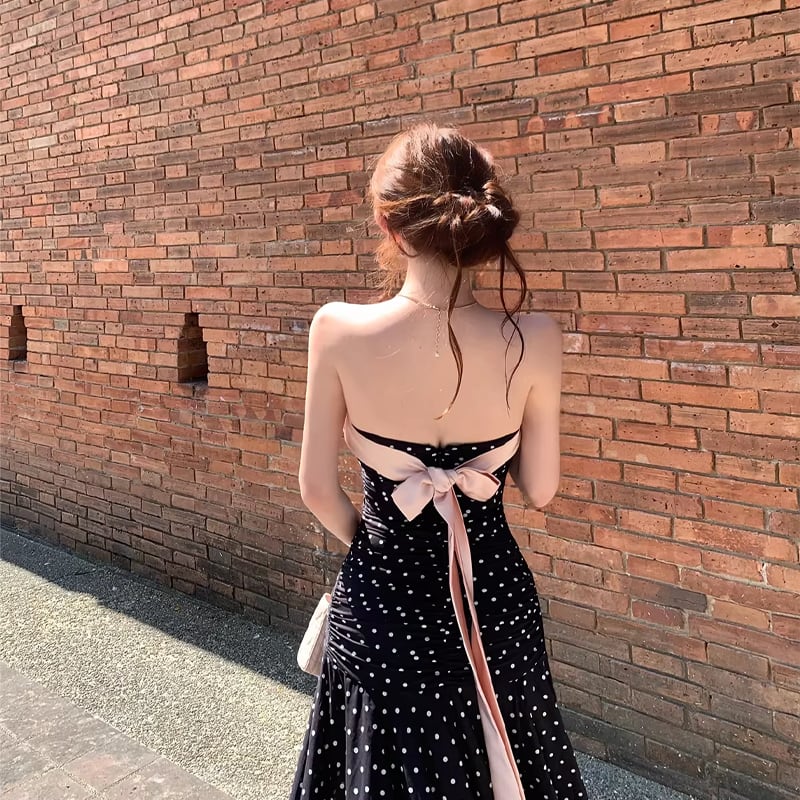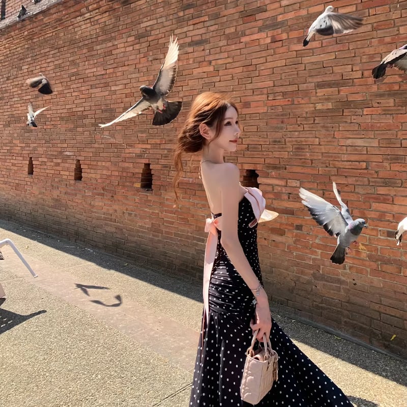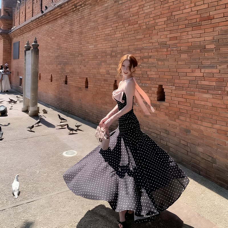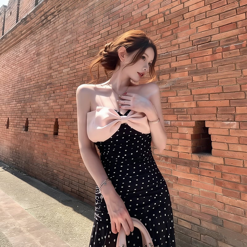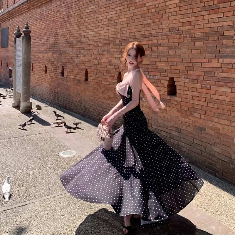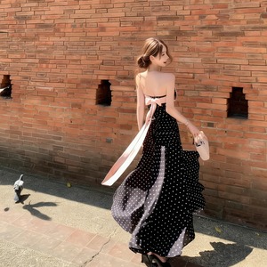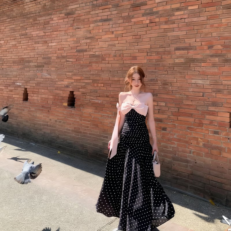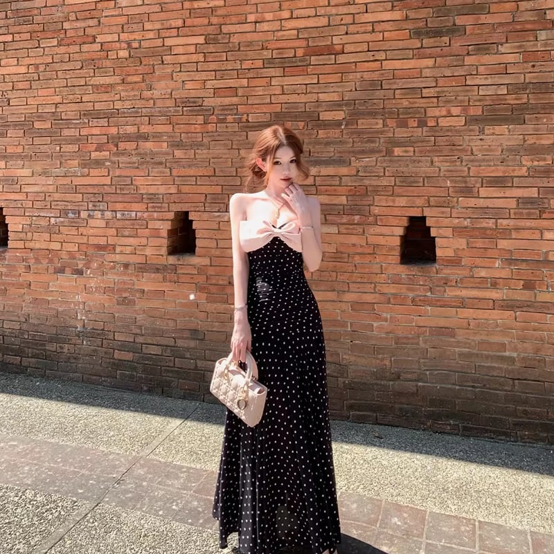 【dress】ドット柄リボン付きロングワンピース Q8374