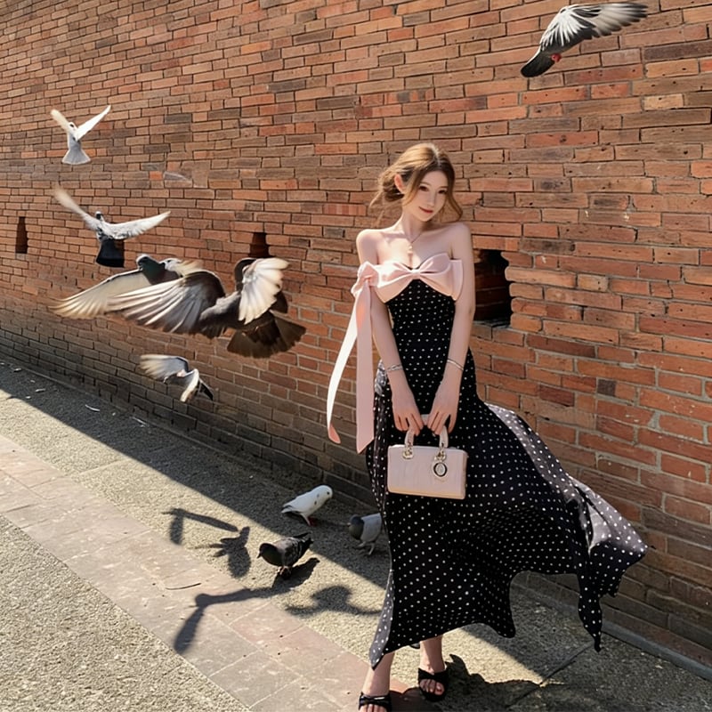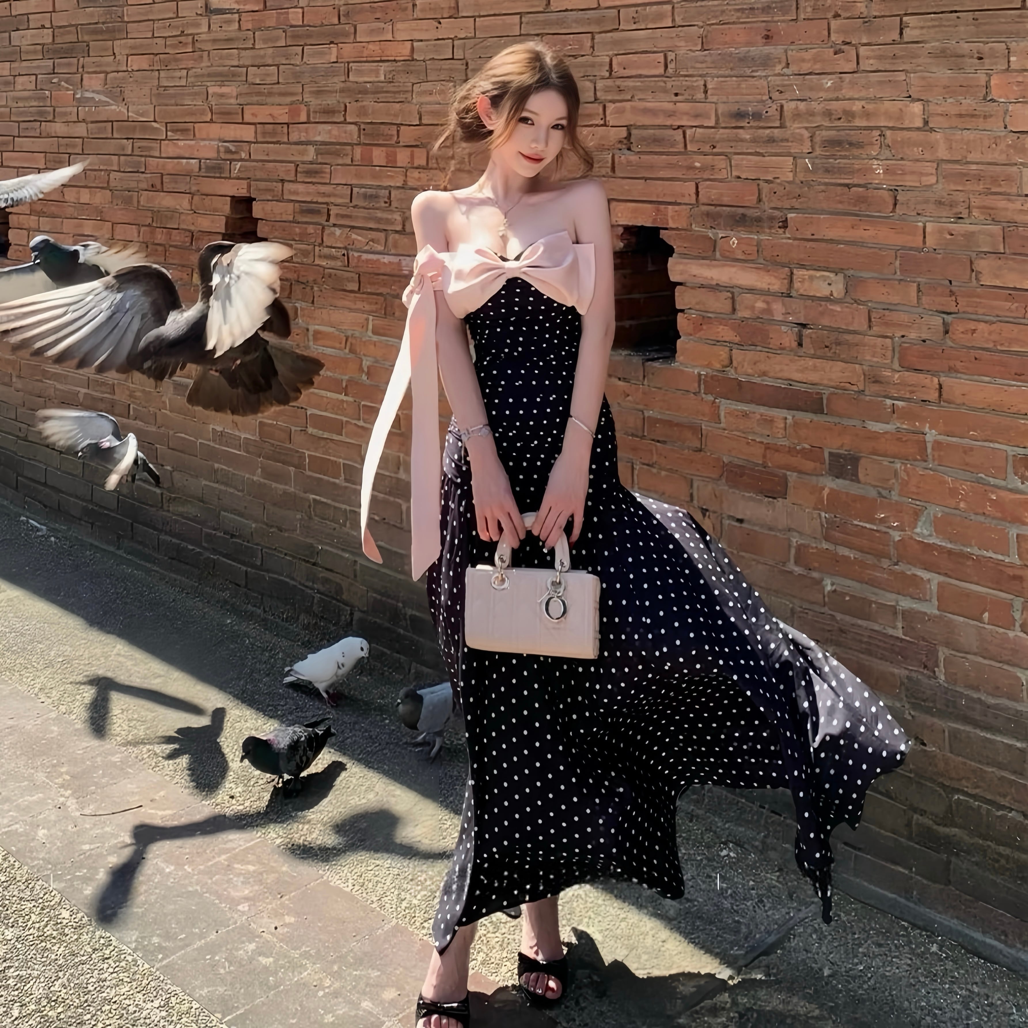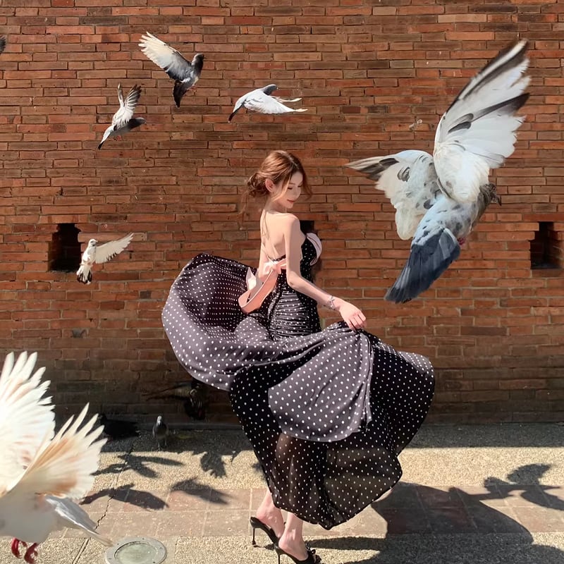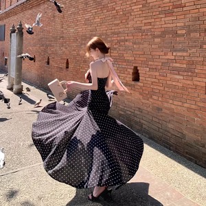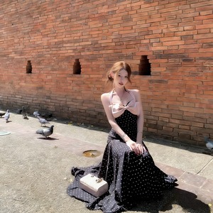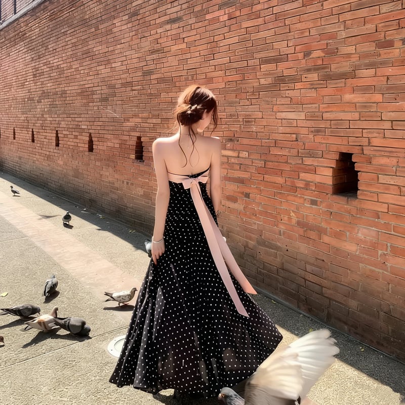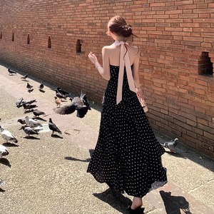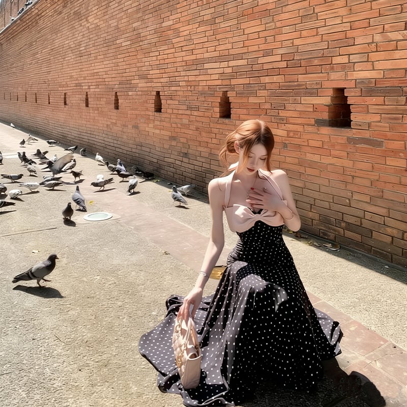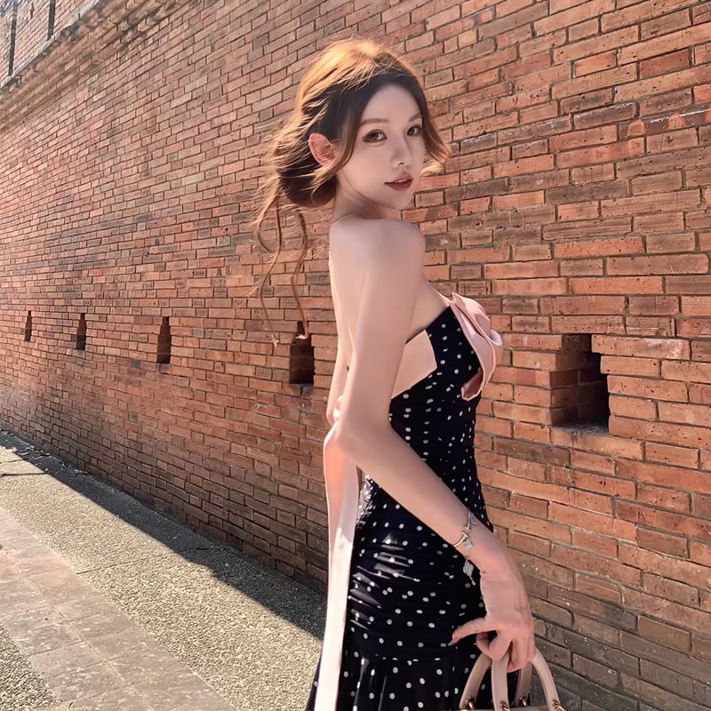 【dress】ドット柄リボン付きロングワンピース Q8374