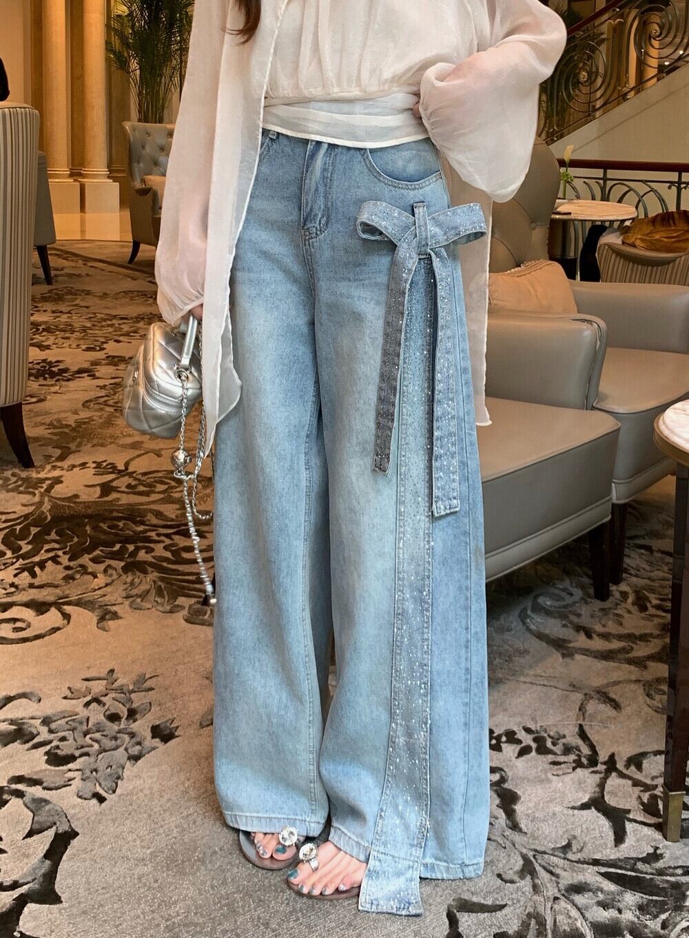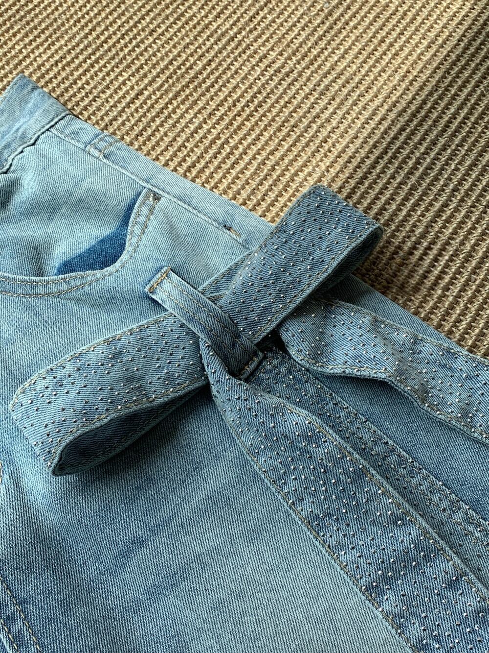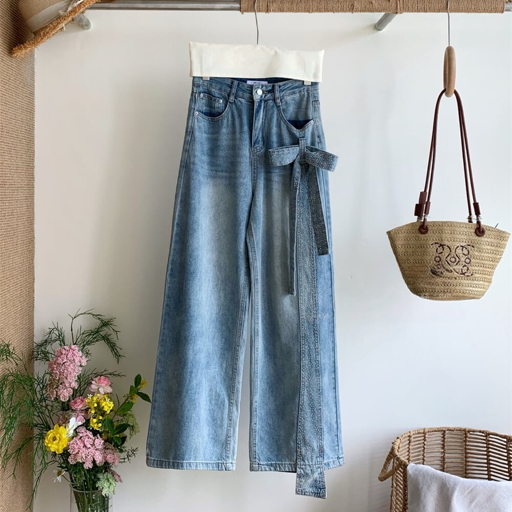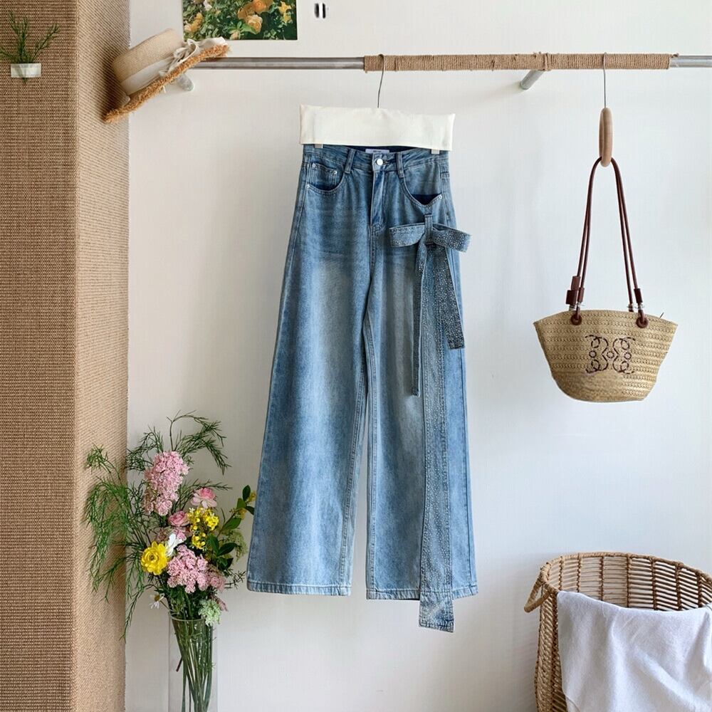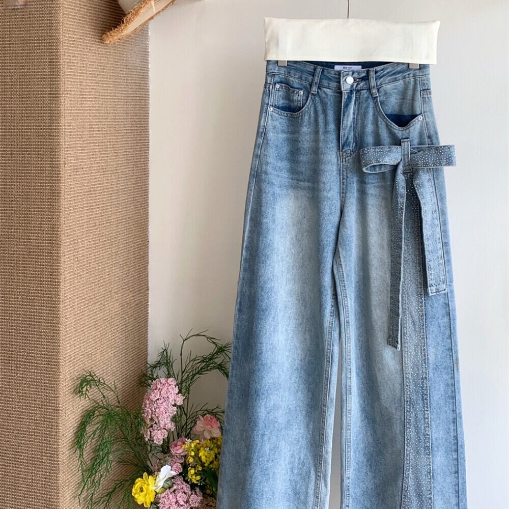 【bottoms】スパンコール付きリボンデニムパンツ N3545