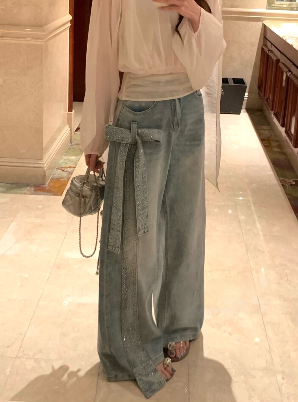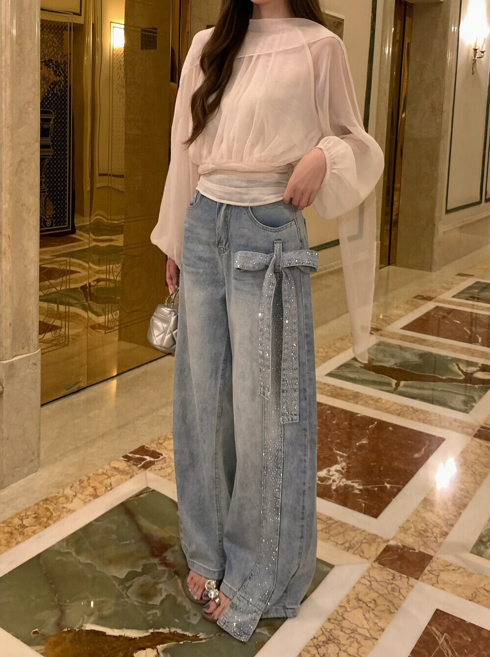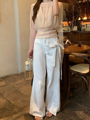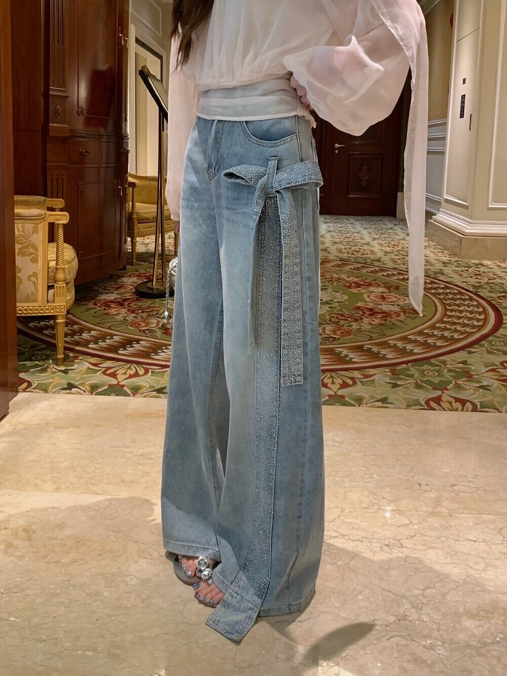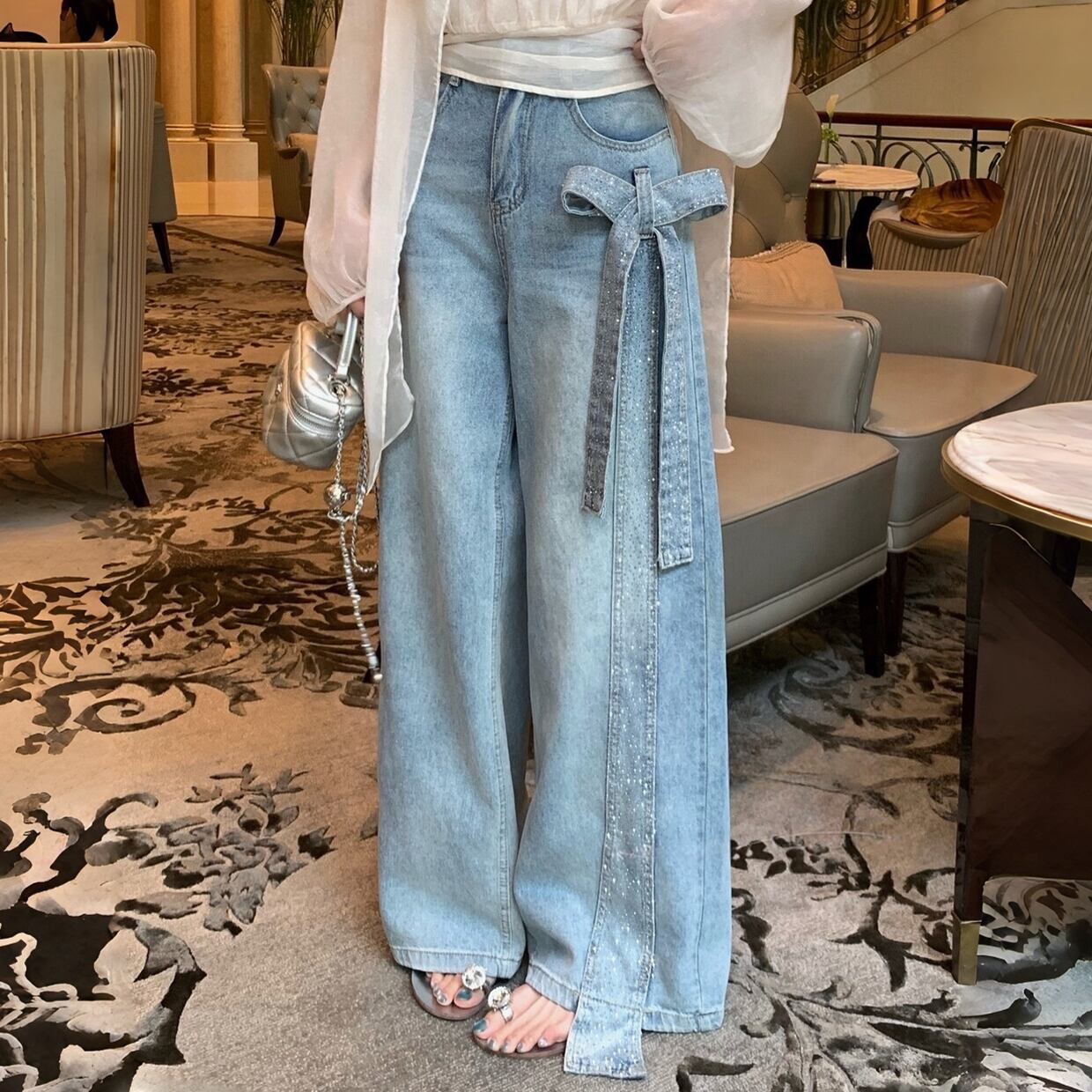 【bottoms】スパンコール付きリボンデニムパンツ N3545