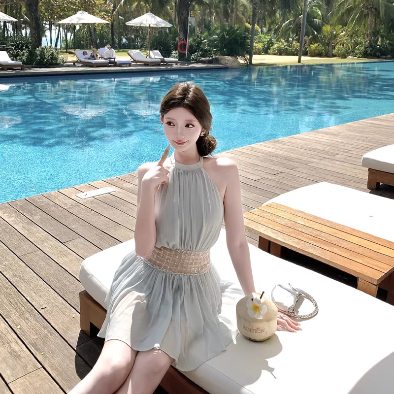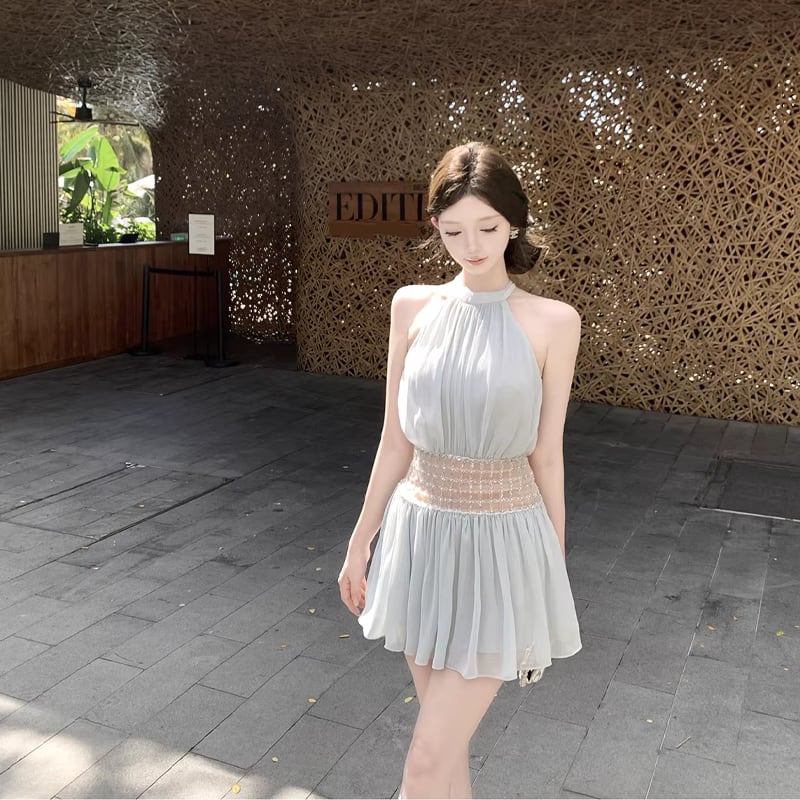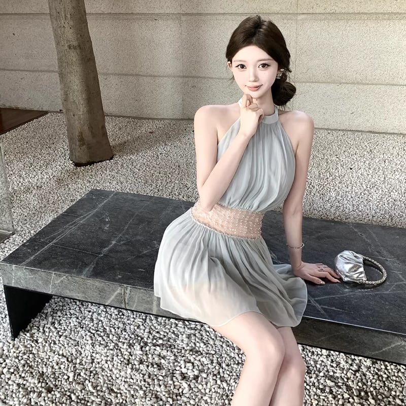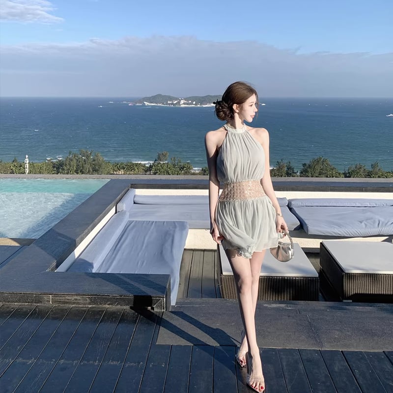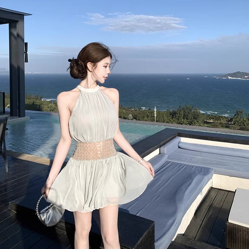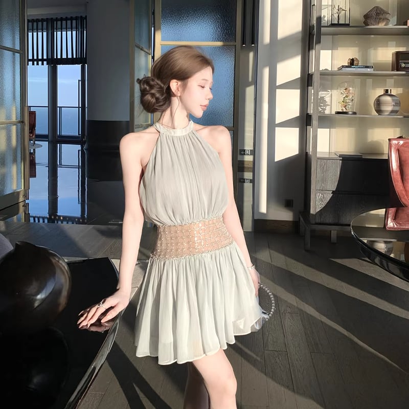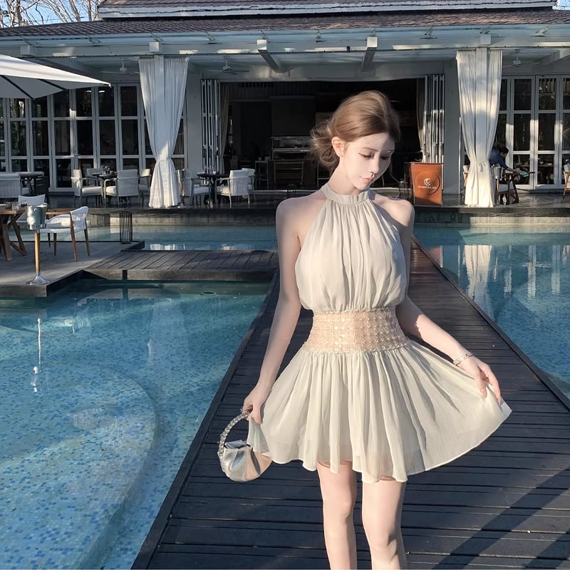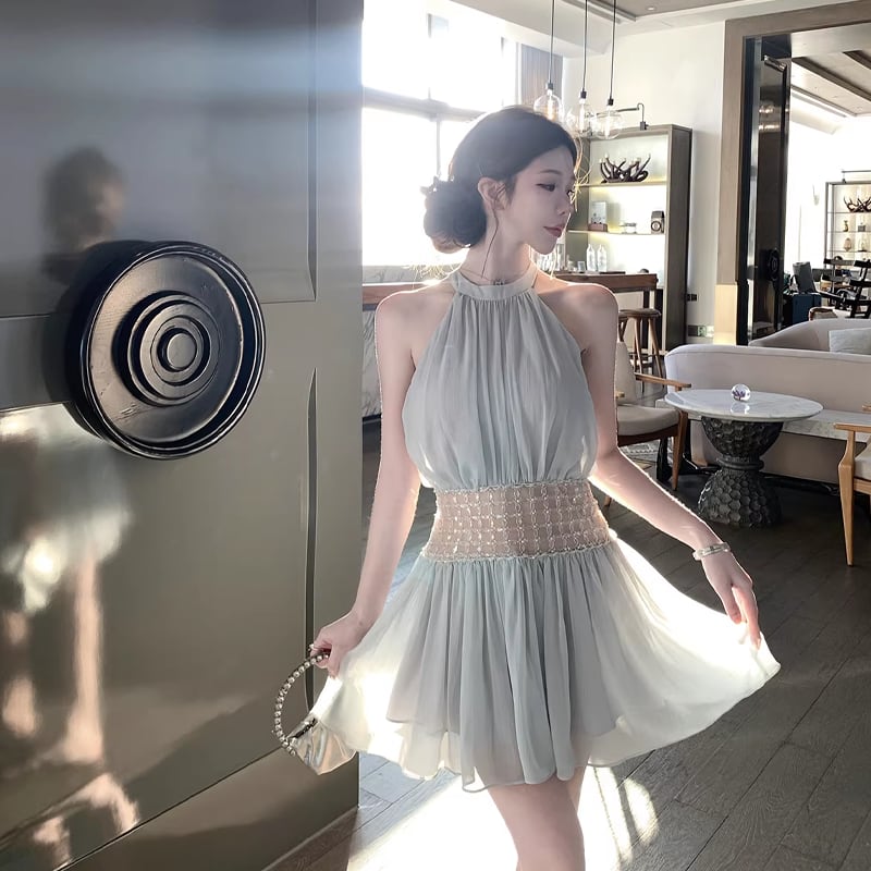 【dress】ビーズ付きノースリーブチュールミニワンピース Q8406