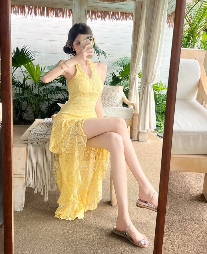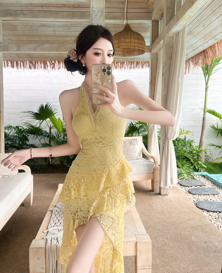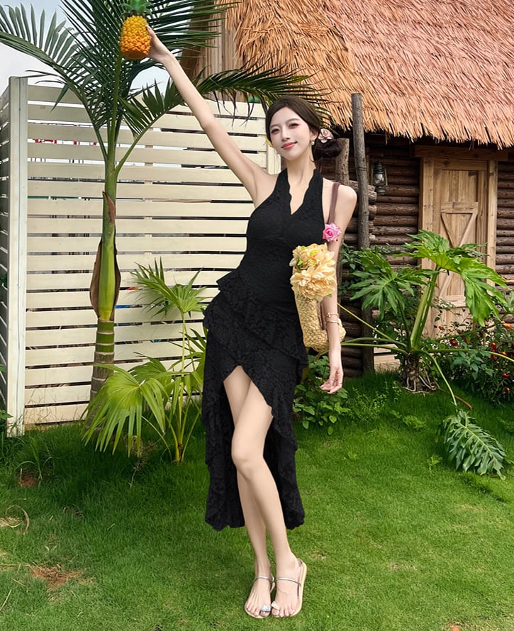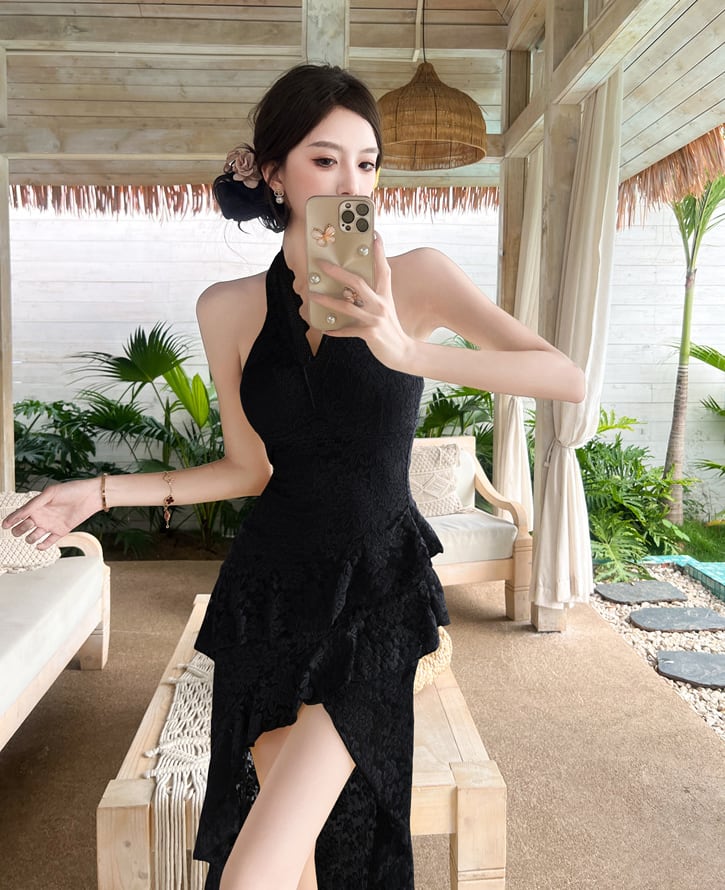 【dress】ホルターネックイレヘムレースワンピース Q8414