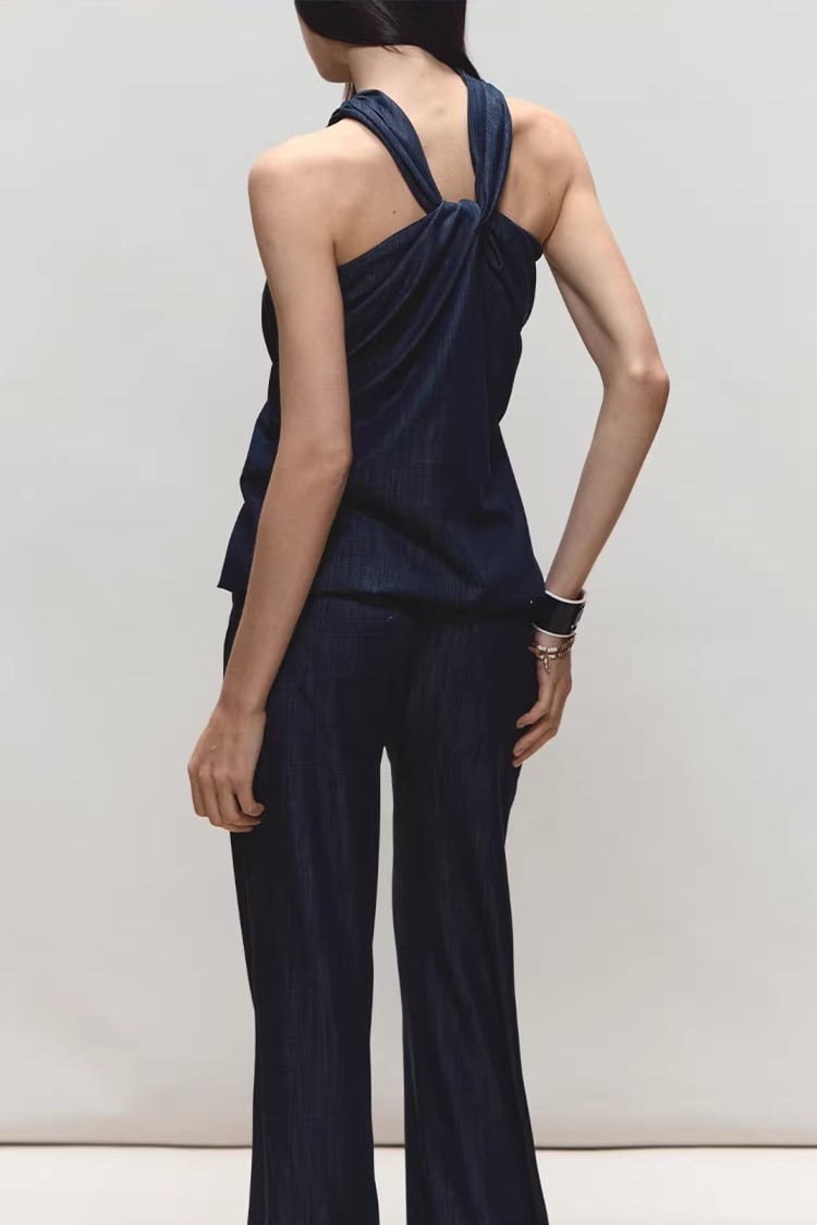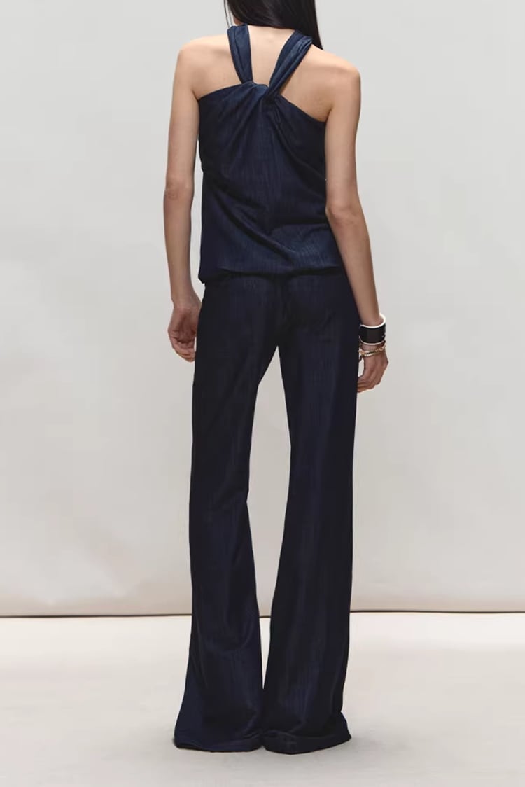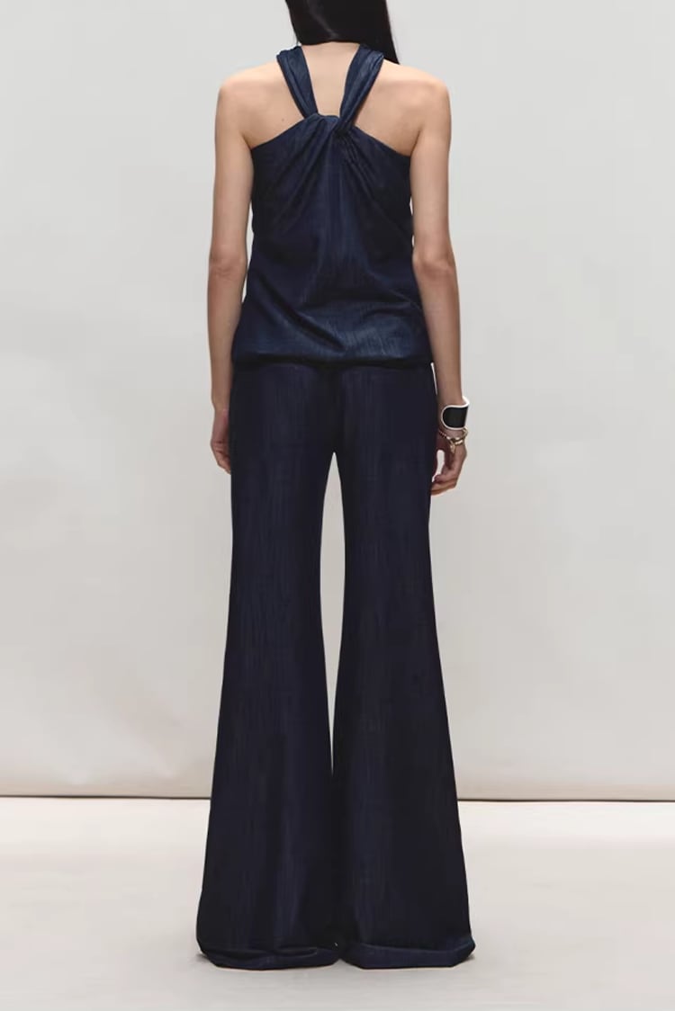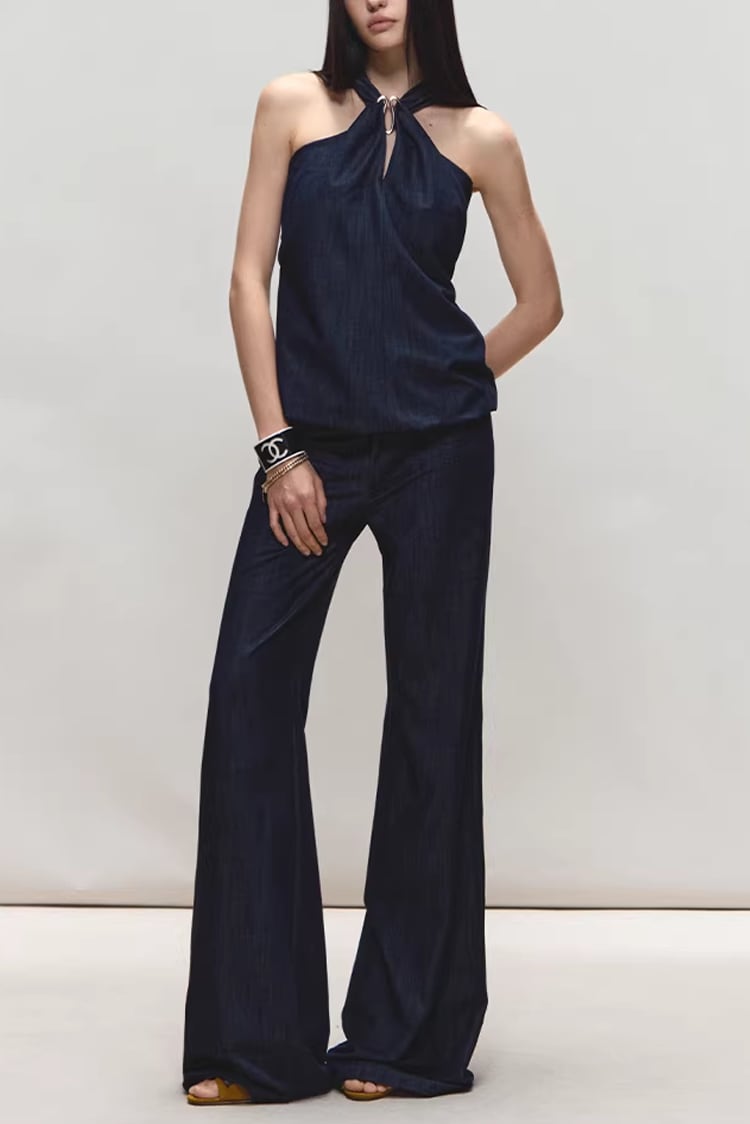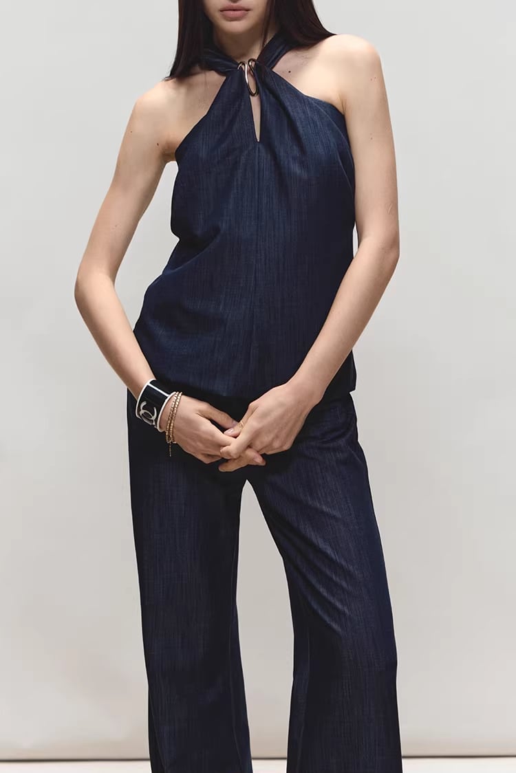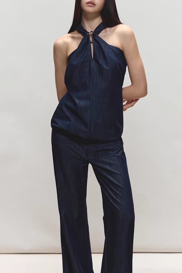 【set】デニムホルターネックトップス×ワイドパンツセット Q8416