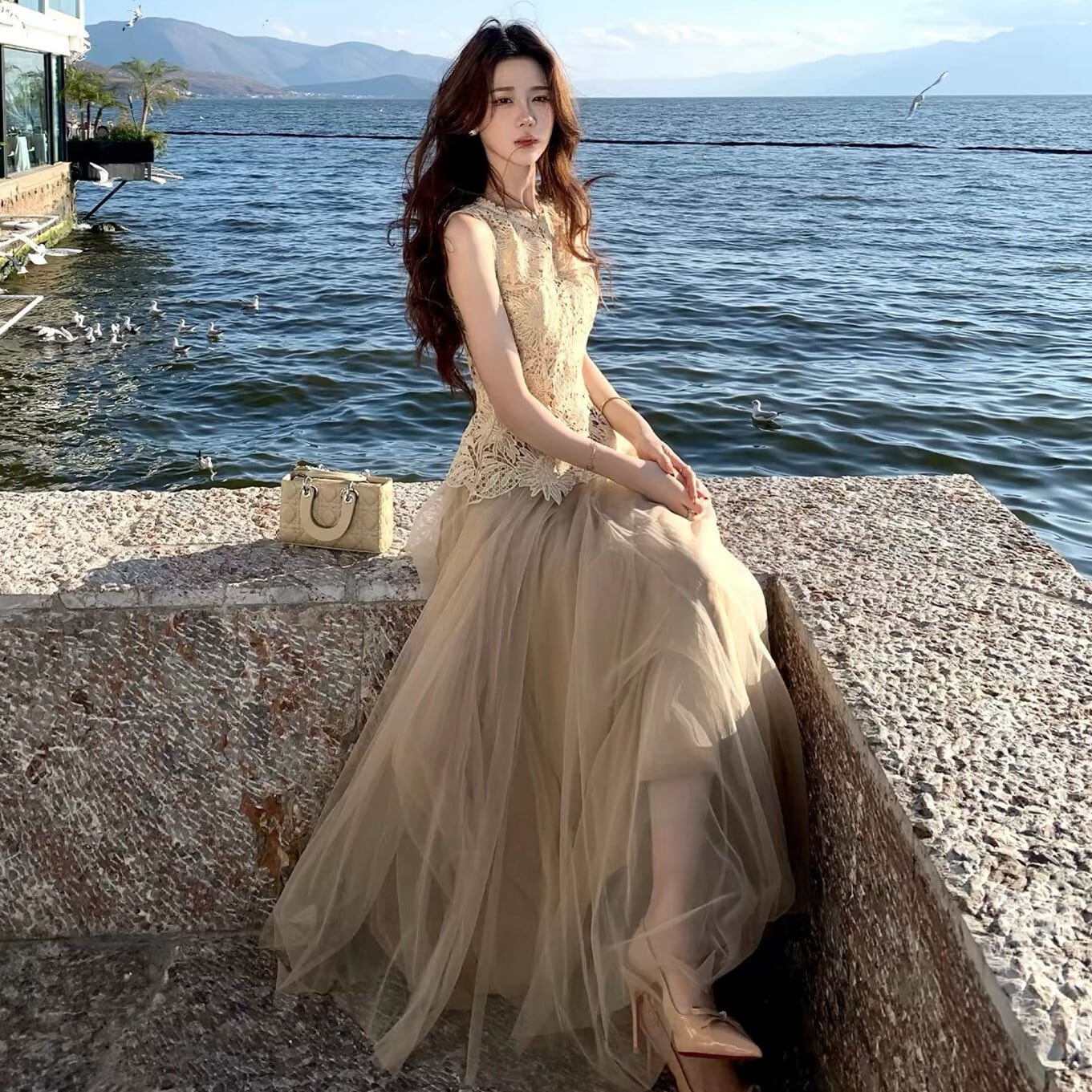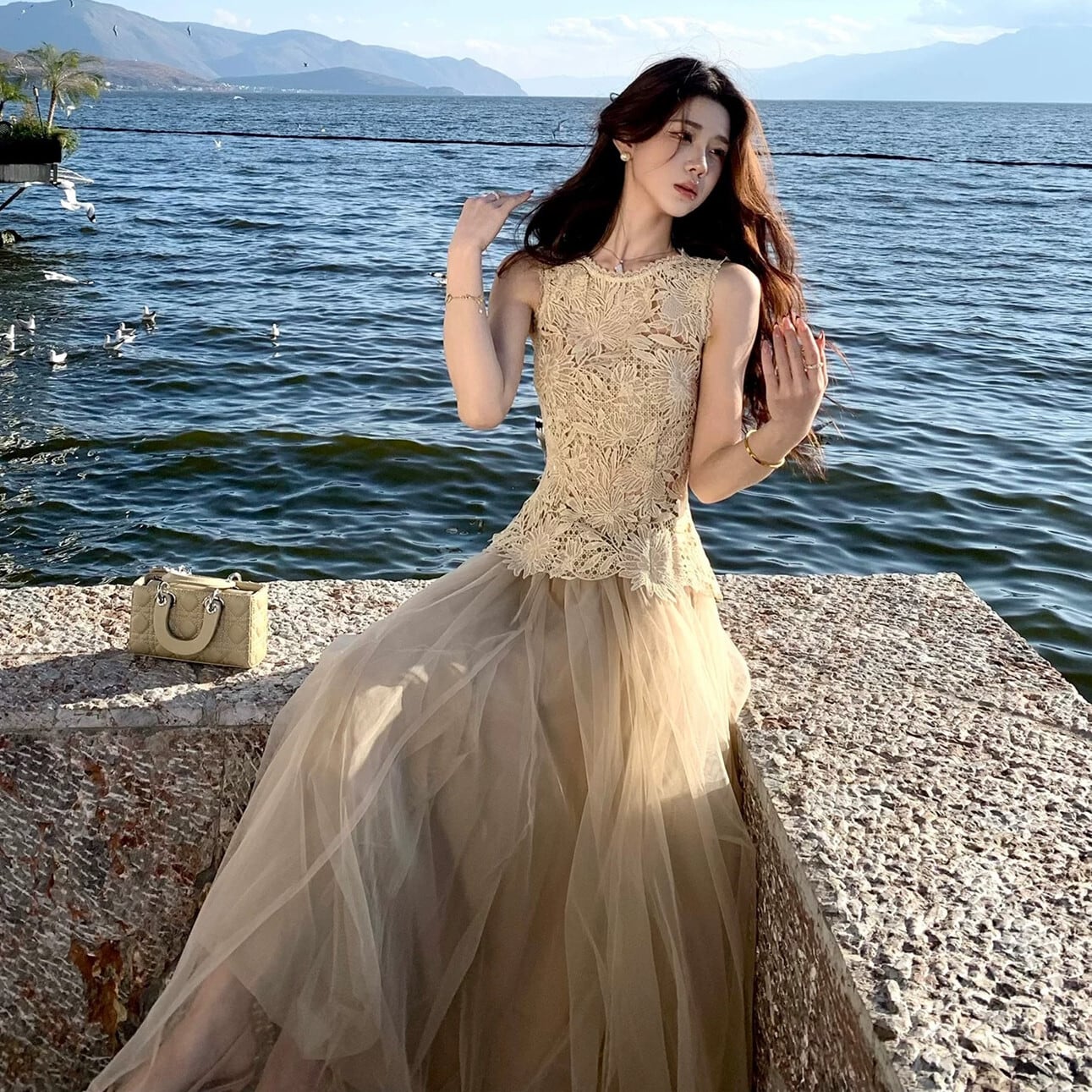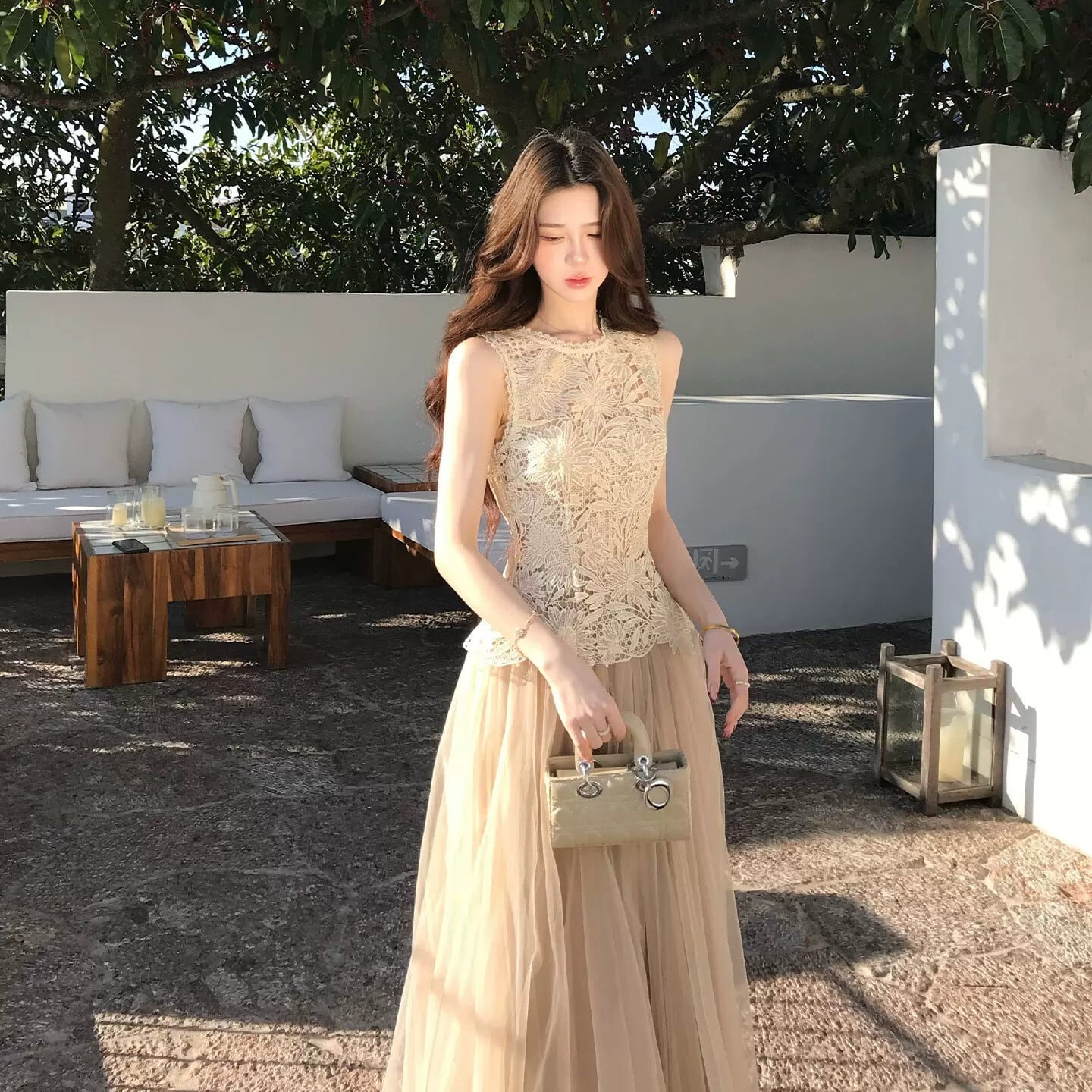 【set】レースノースリーブトップス×チュールスカートセット N3555