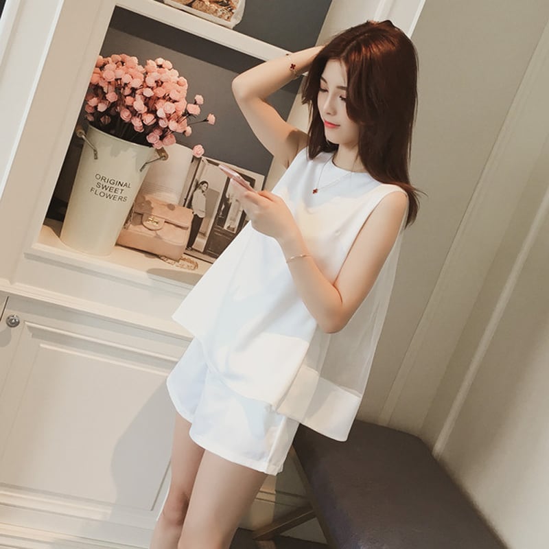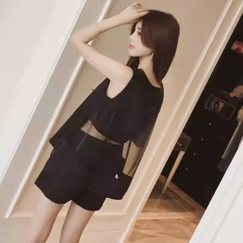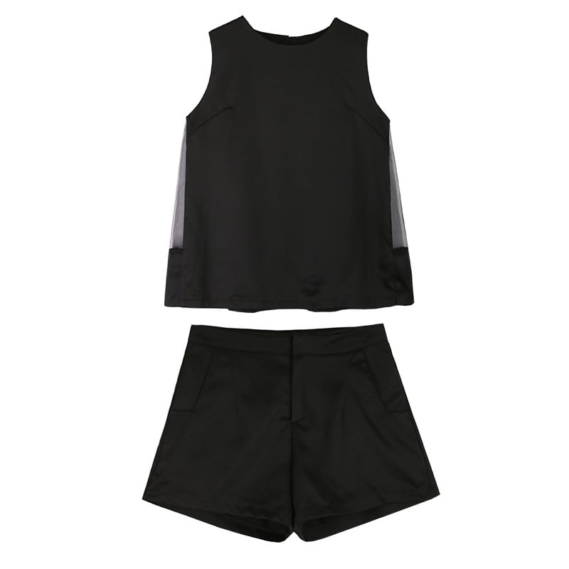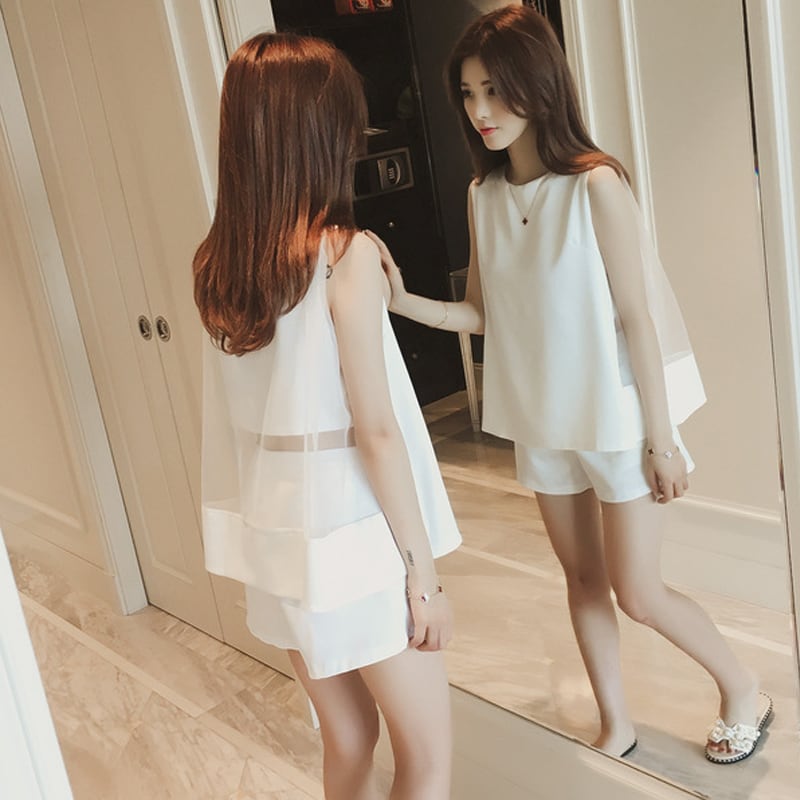 【set】ノースリーブチュールドッキングトップス×ショートパンツセット Q8430