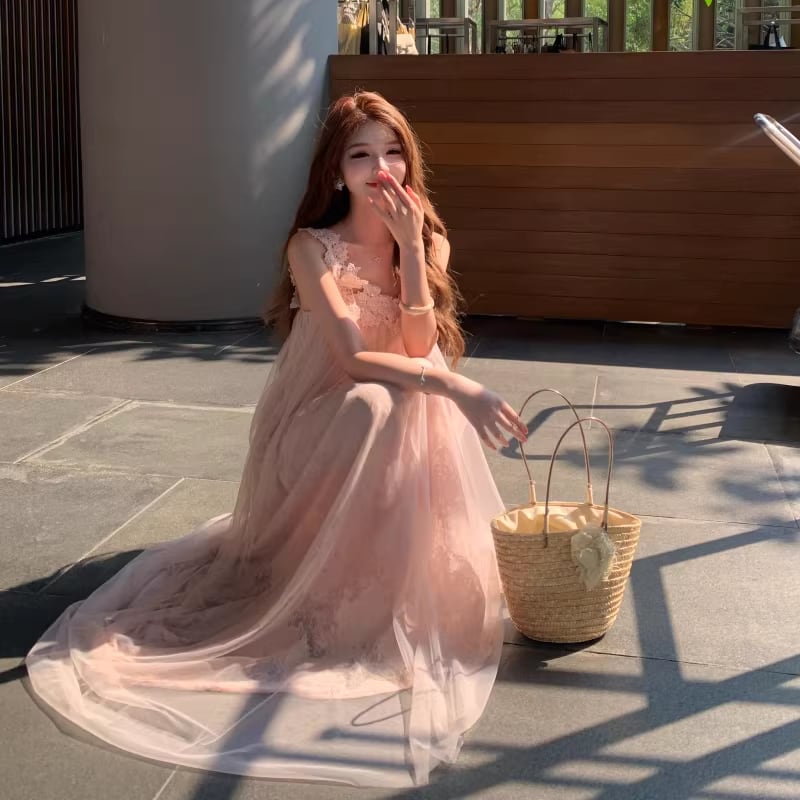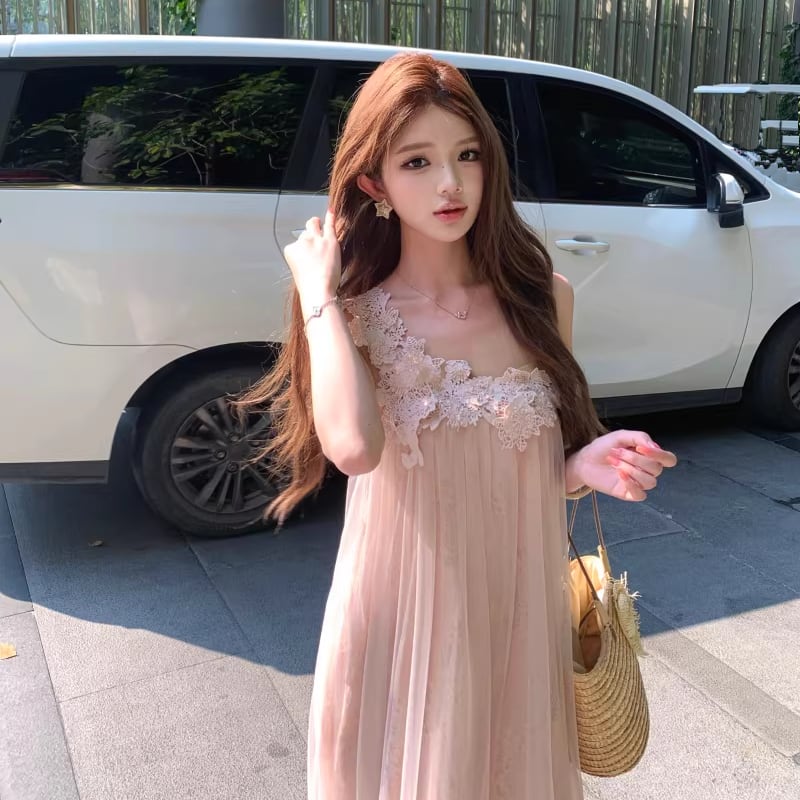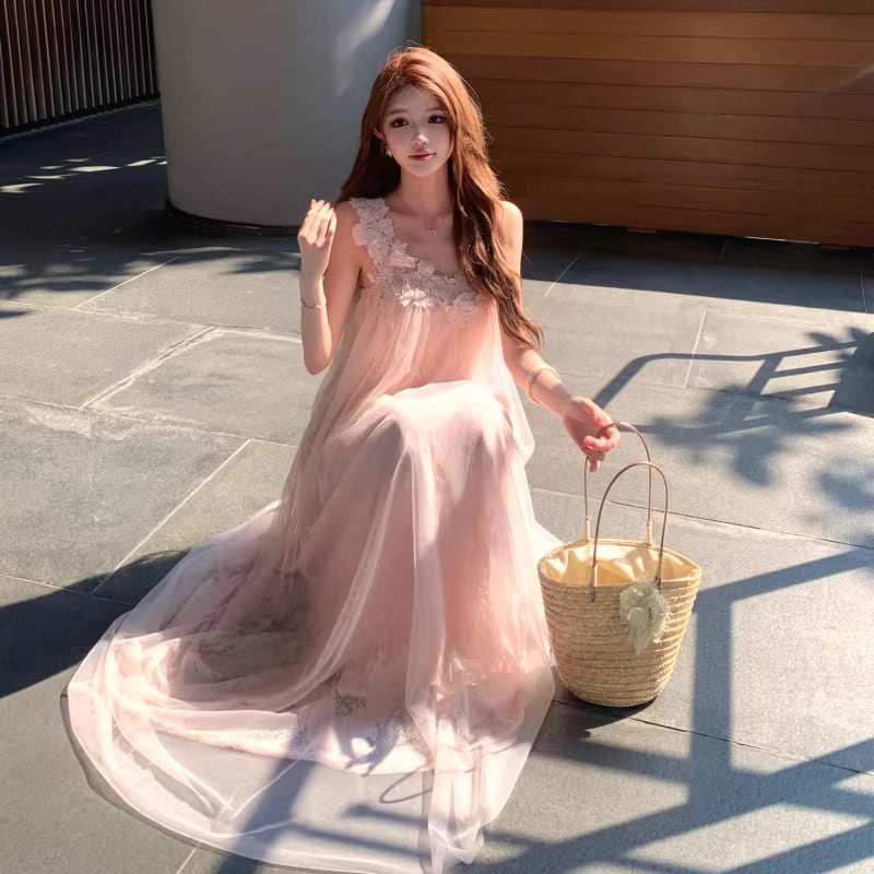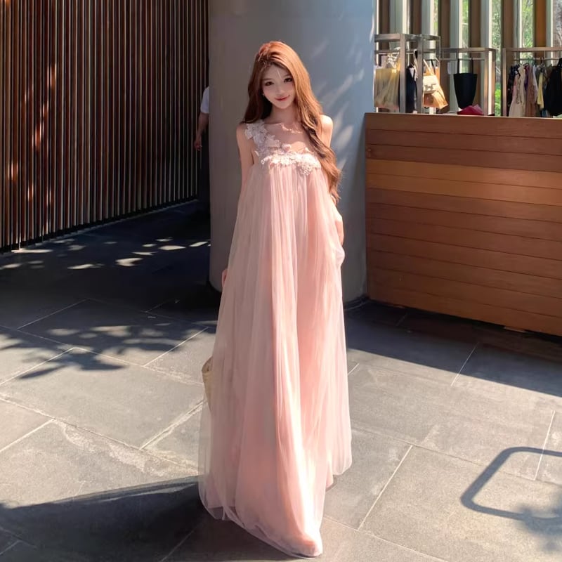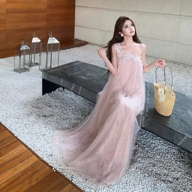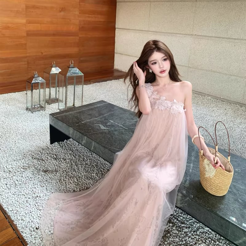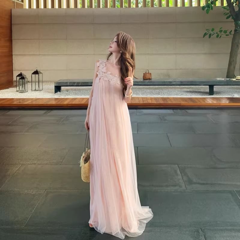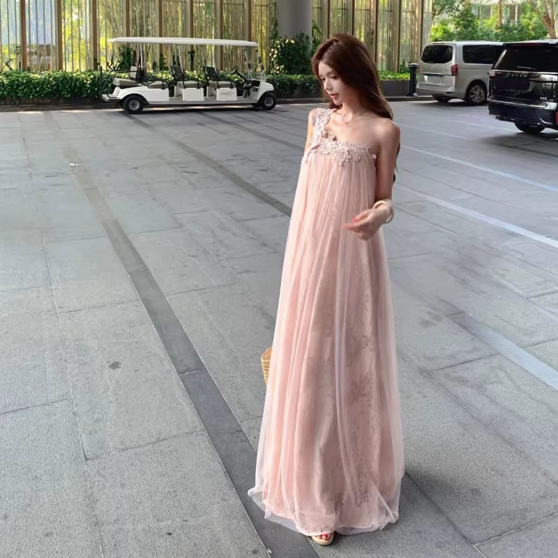 【dress】レースドッキングワンショルダーロングワンピース Q8444