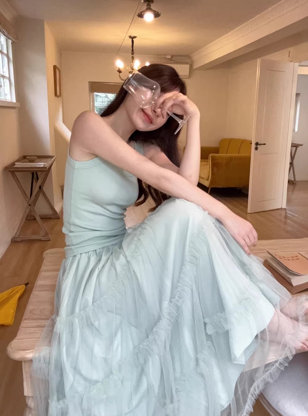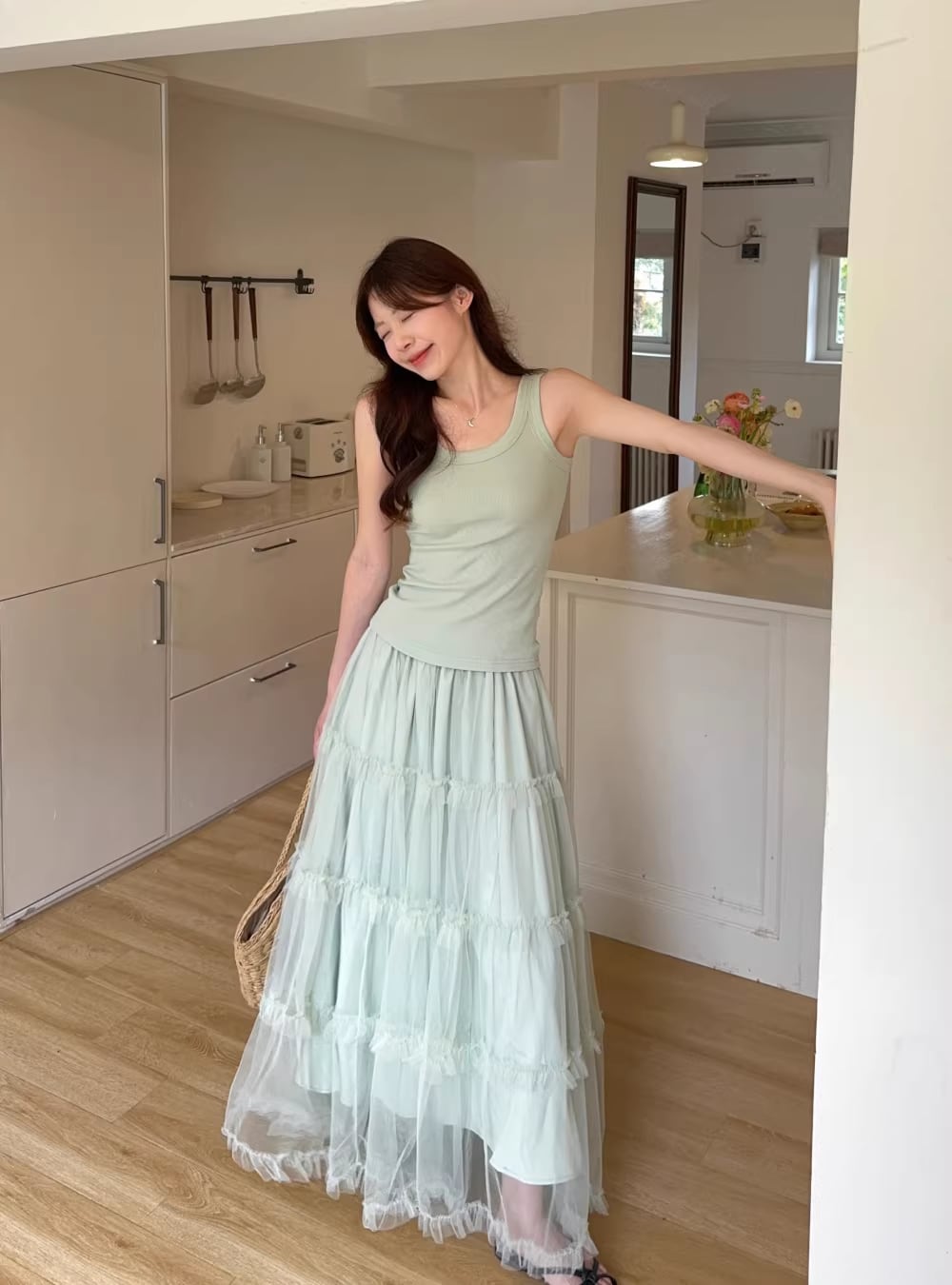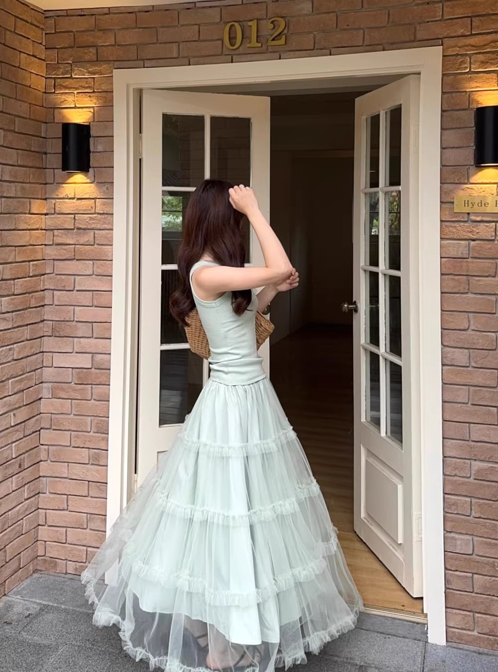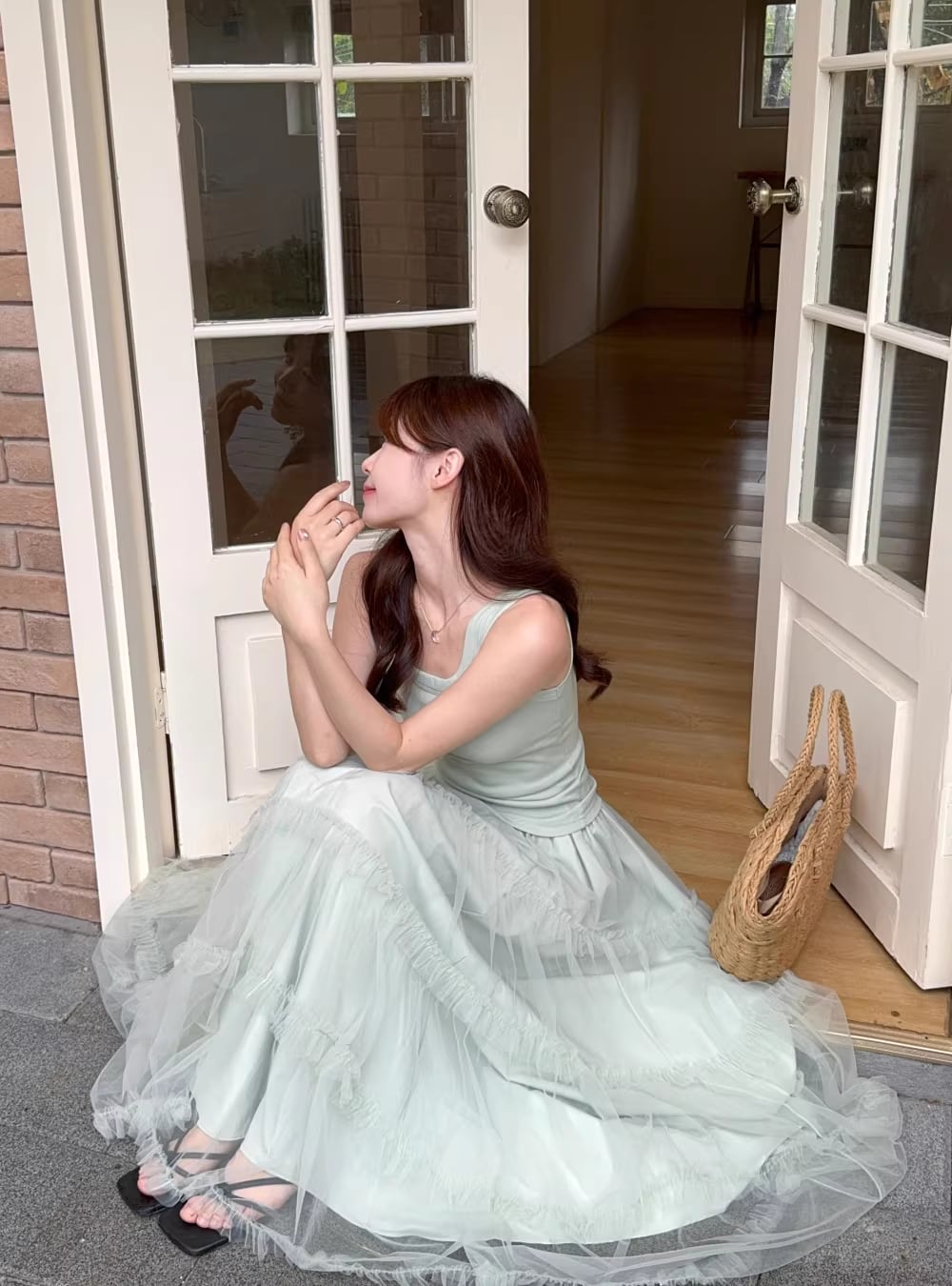 【set】キャミソール×シアーチュールロングティアードスカートセット Q8452