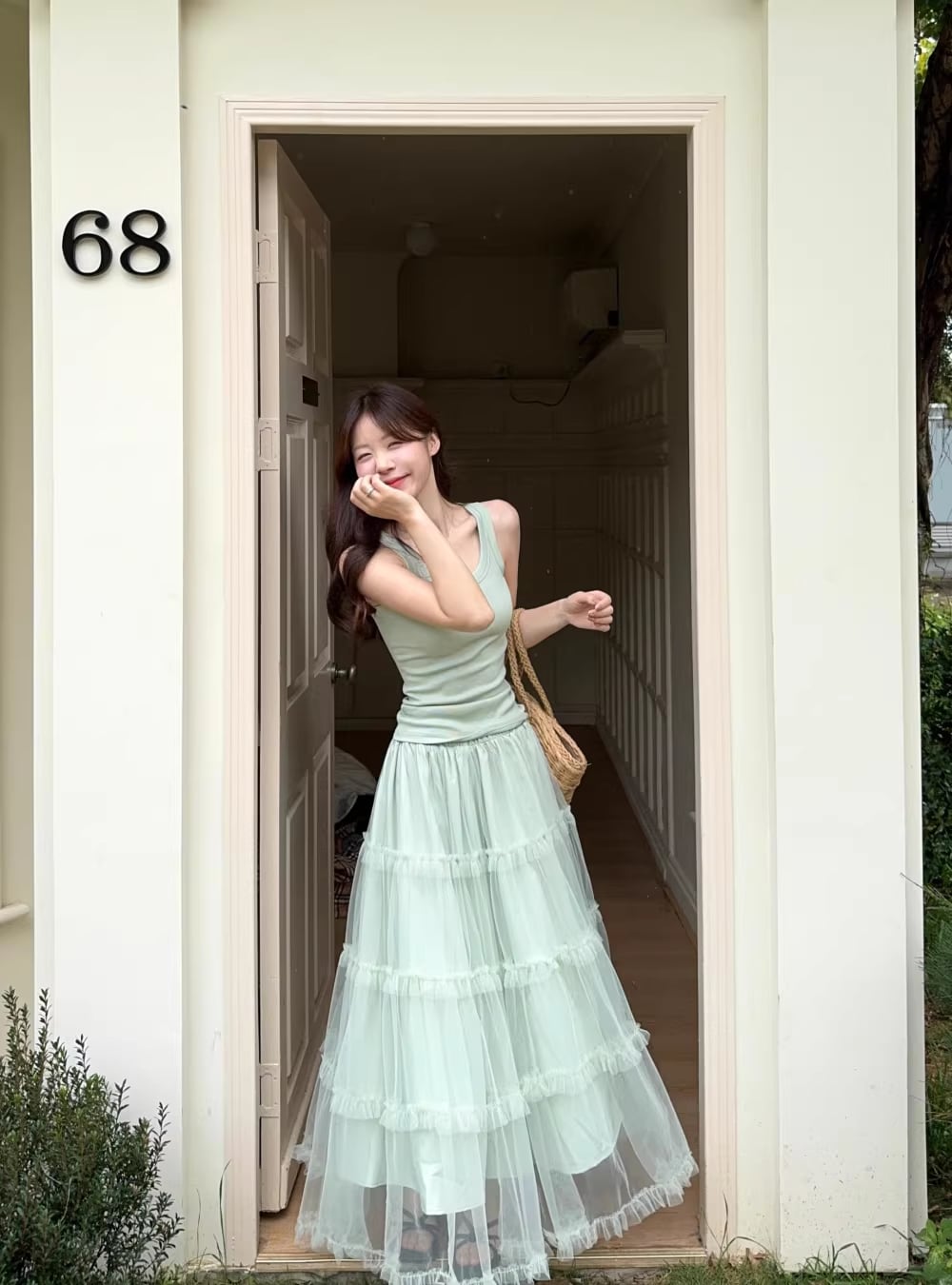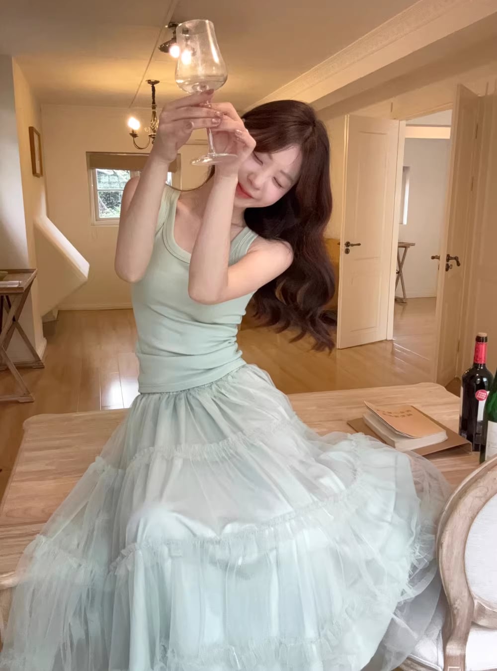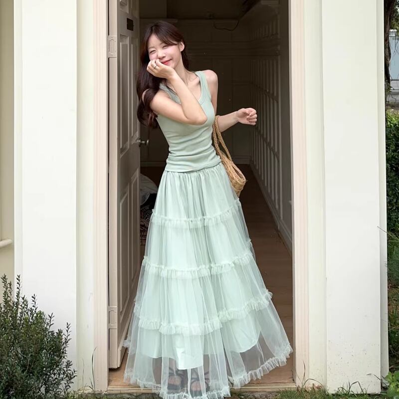【set】キャミソール×シアーチュールロングティアードスカートセット Q8452