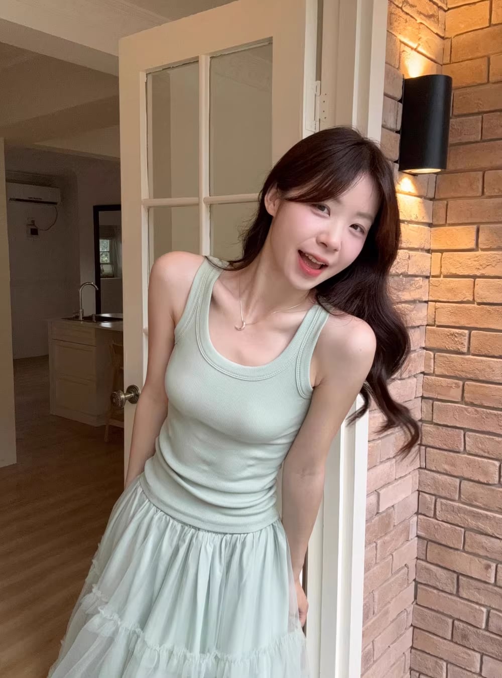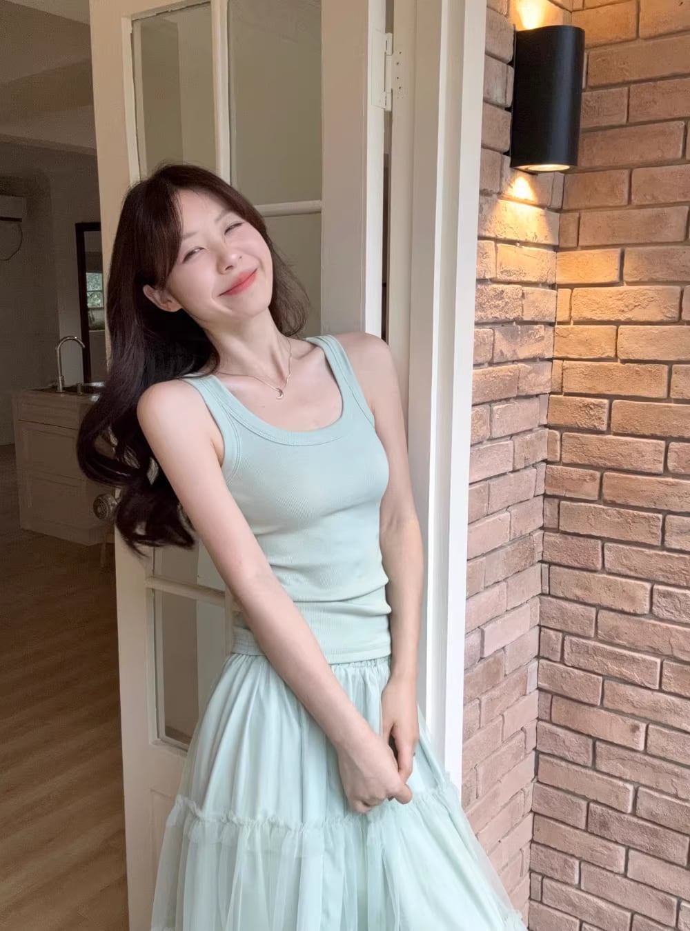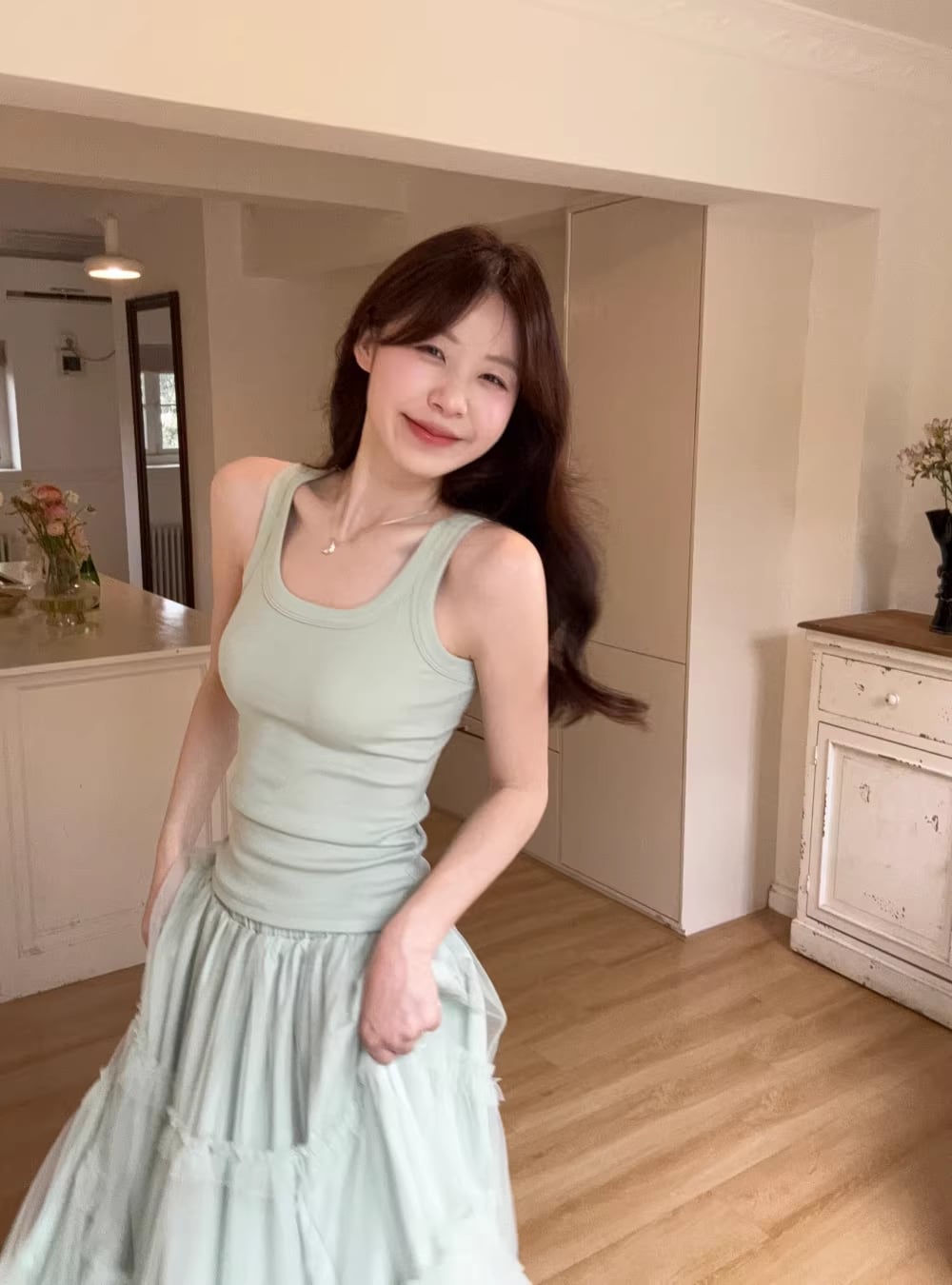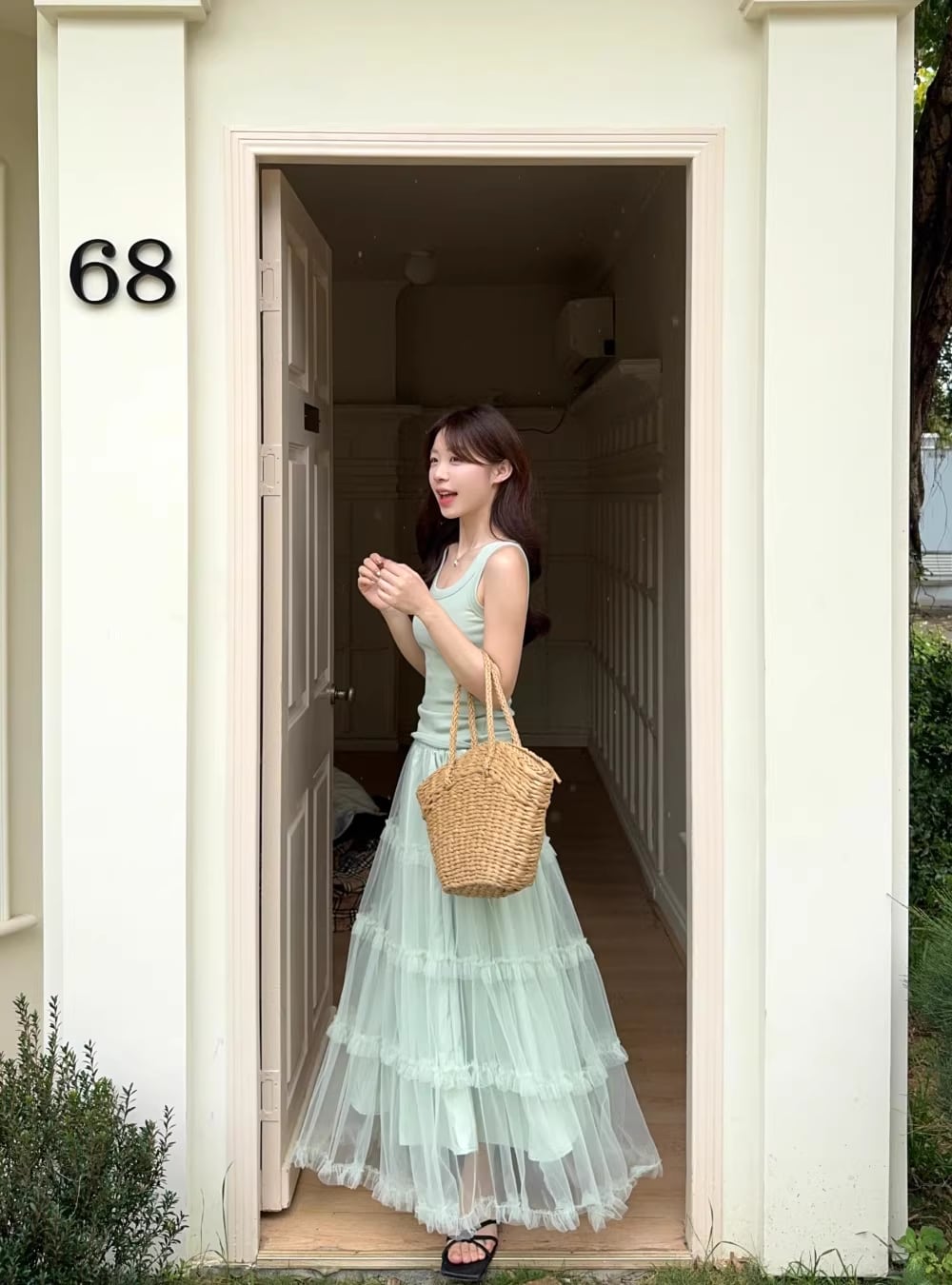 【set】キャミソール×シアーチュールロングティアードスカートセット Q8452