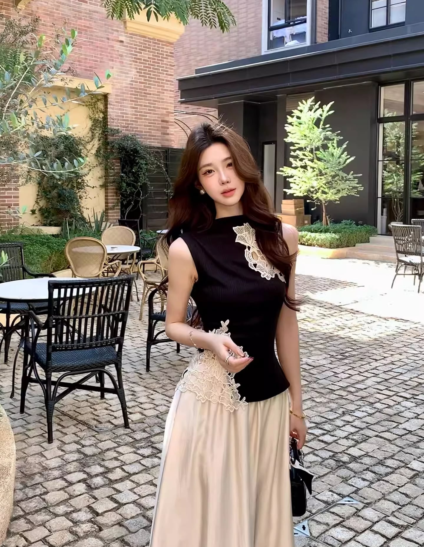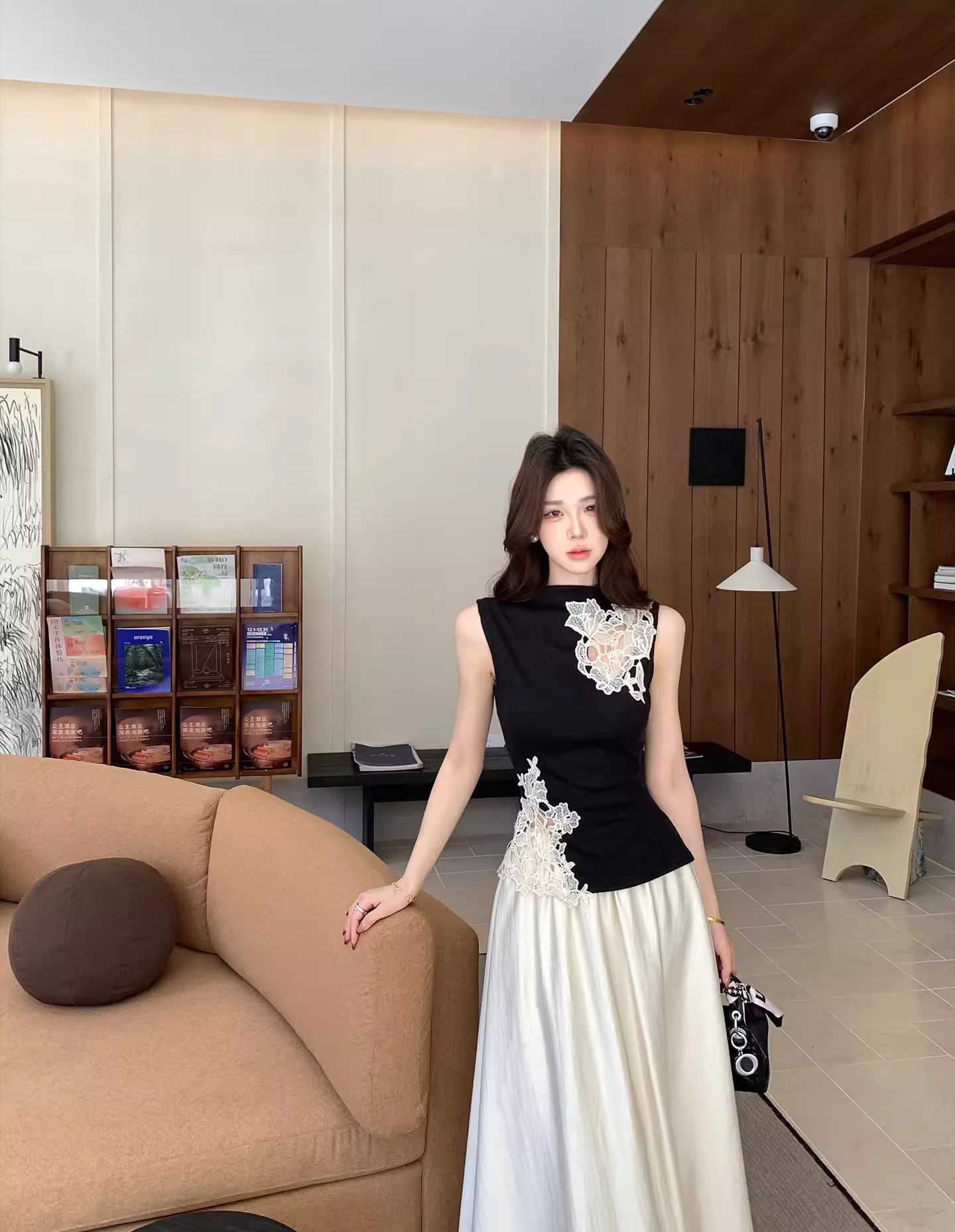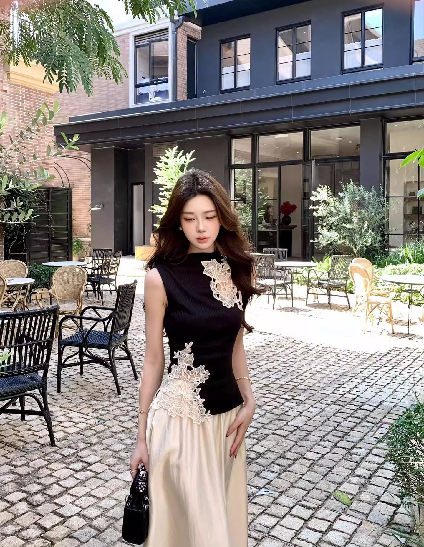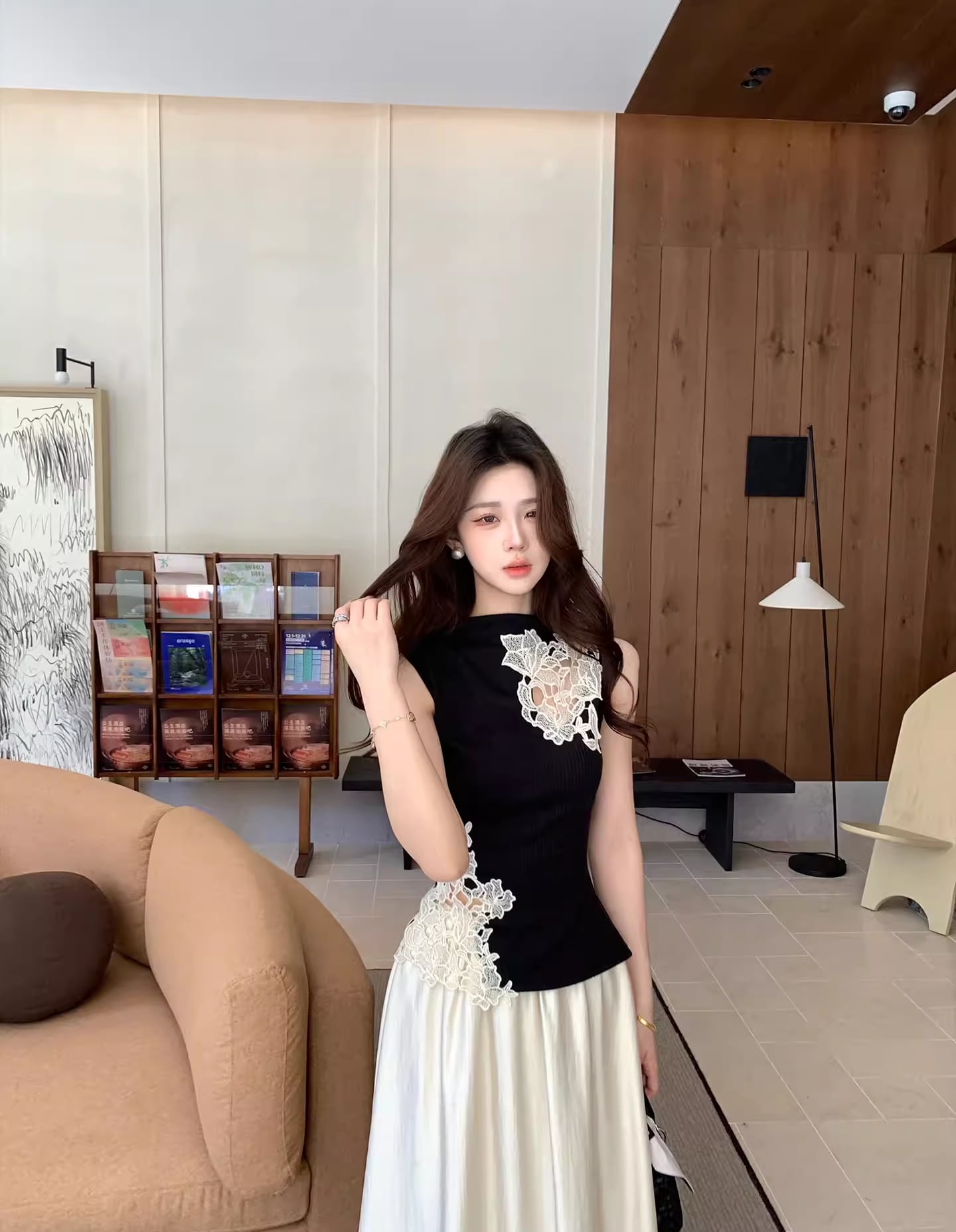 【set】ノースリーブレース刺繍トップス×ロングスカートセット Q8453