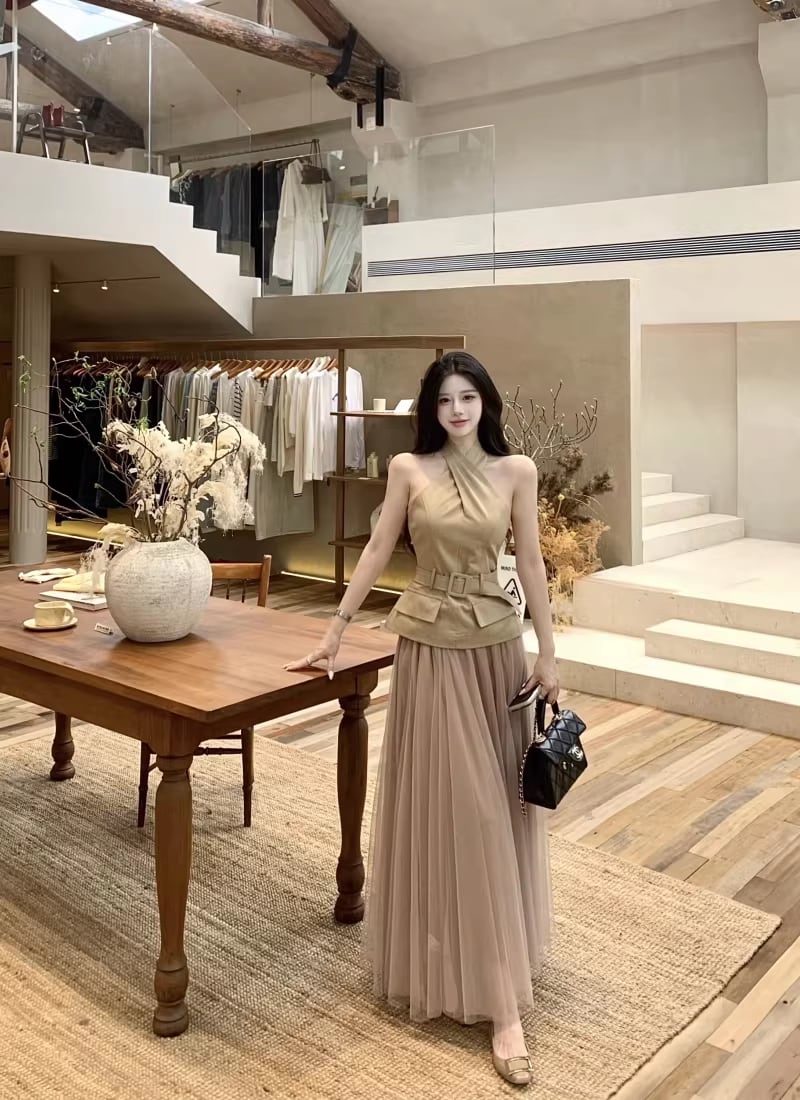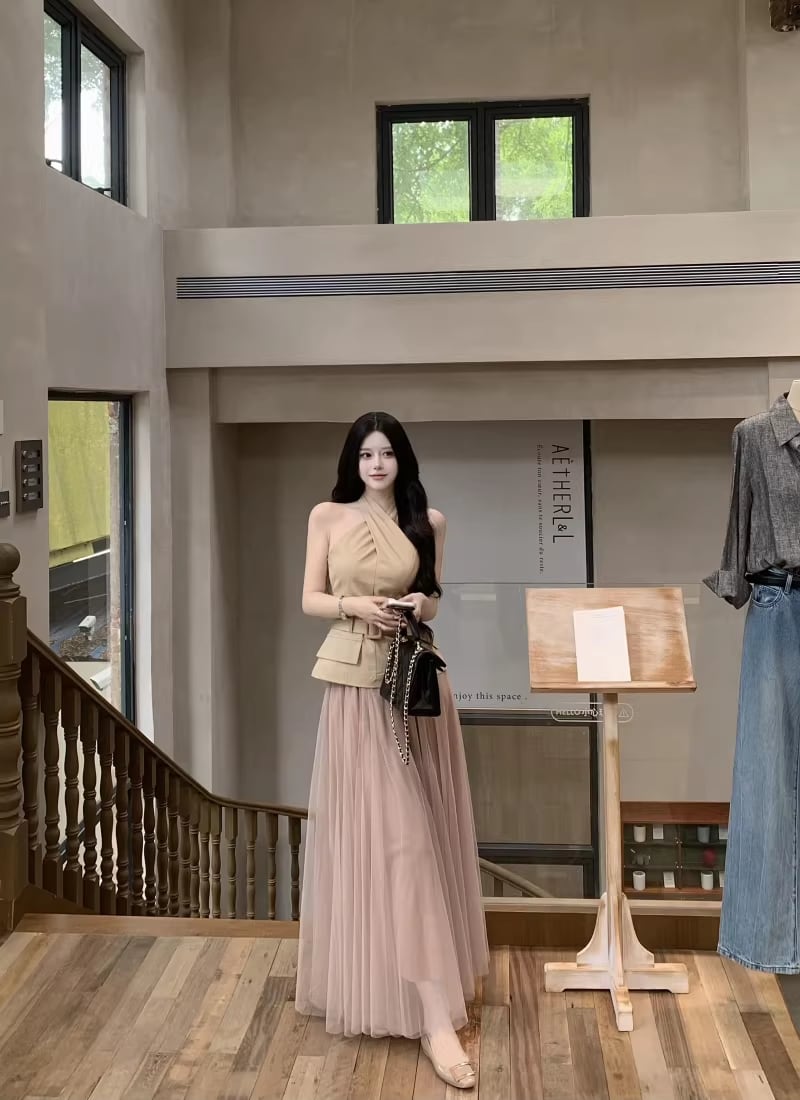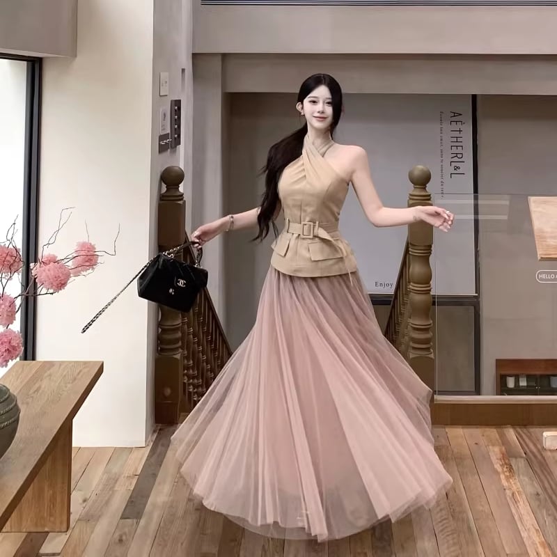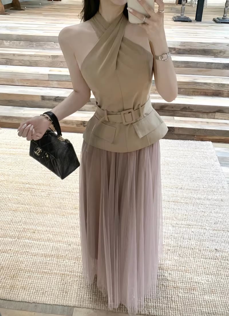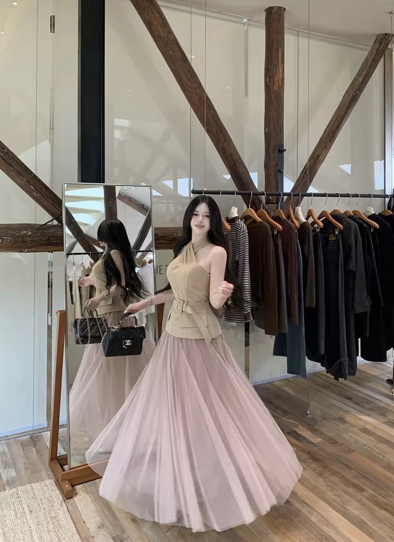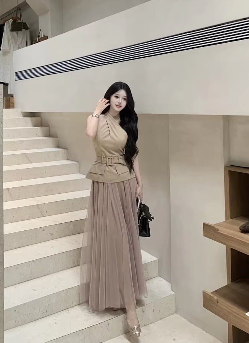【set】ノースリーブクロスネックトップス×チュールロングスカートセット Q8456