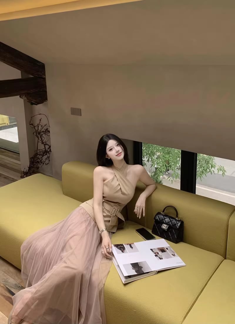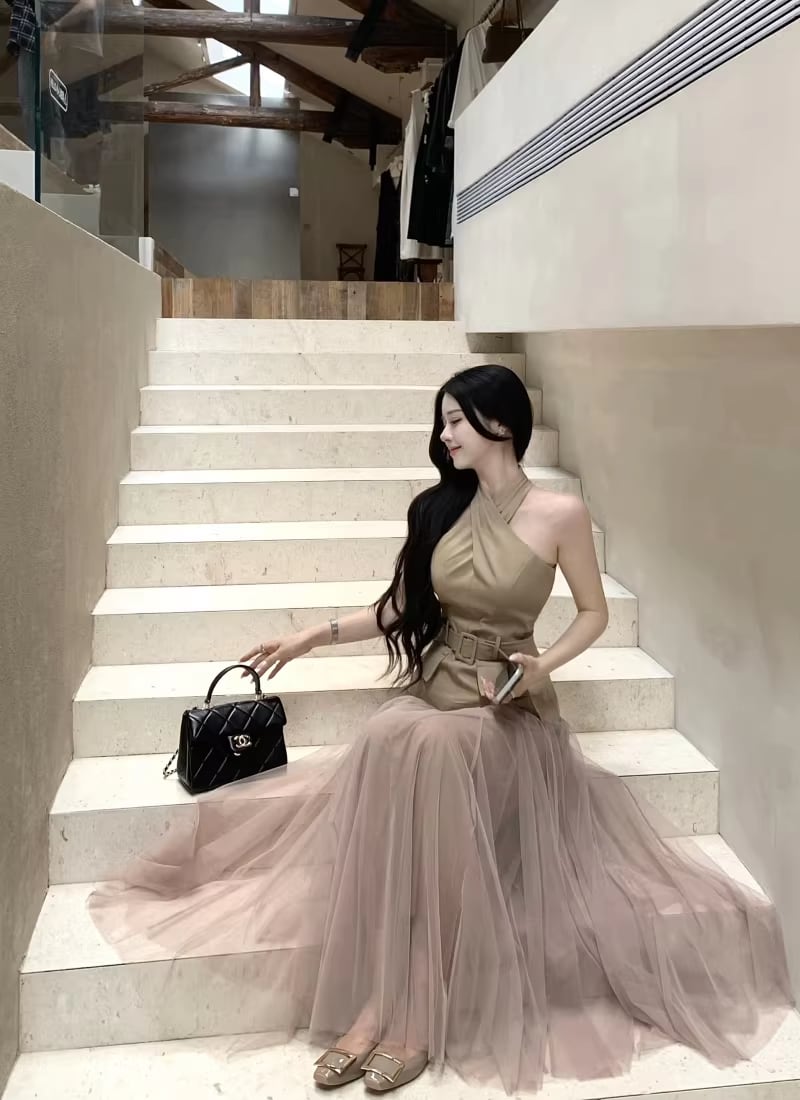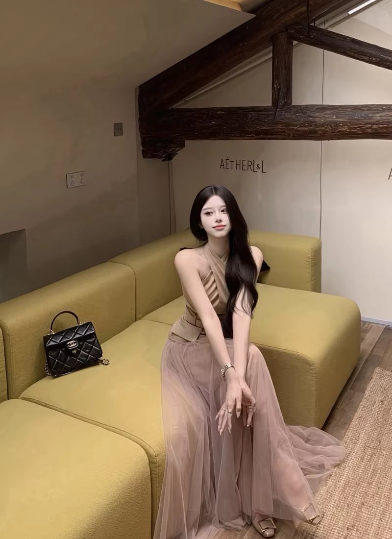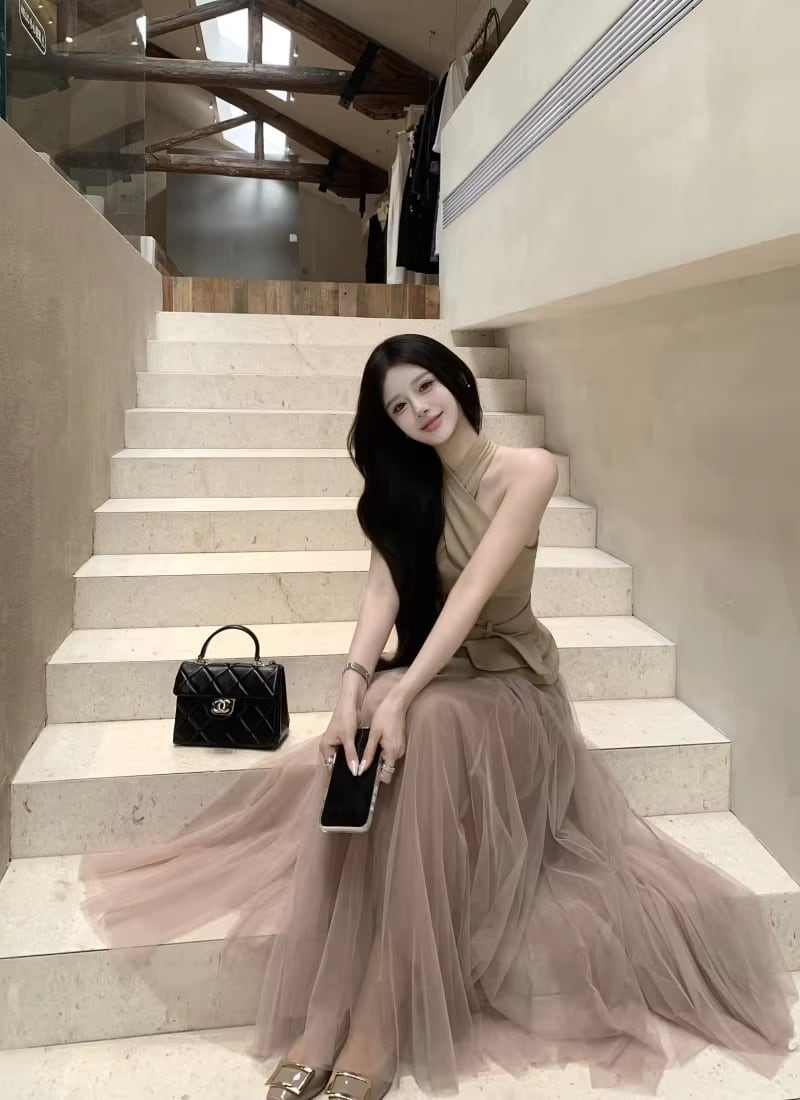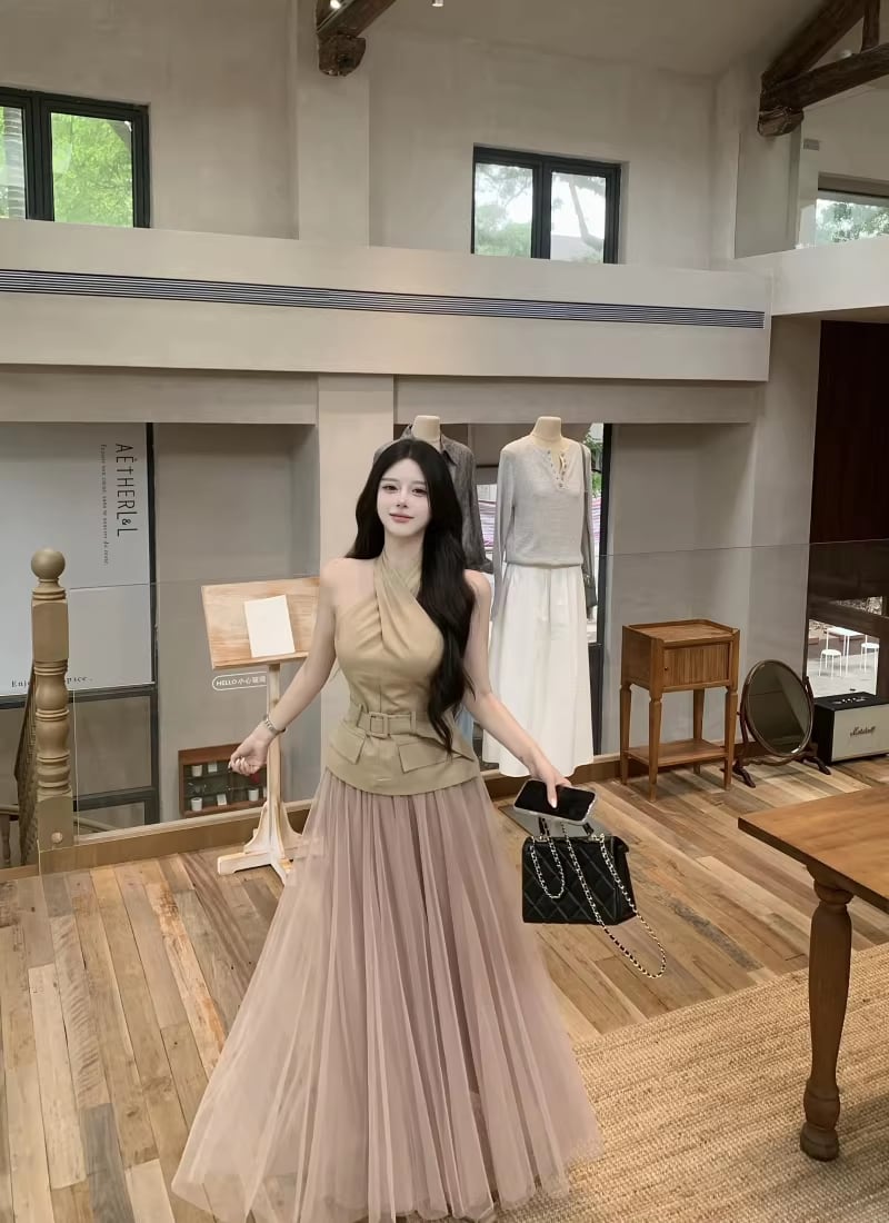 【set】ノースリーブクロスネックトップス×チュールロングスカートセット Q8456