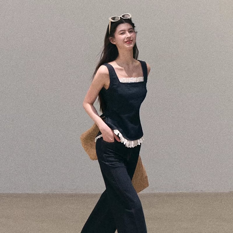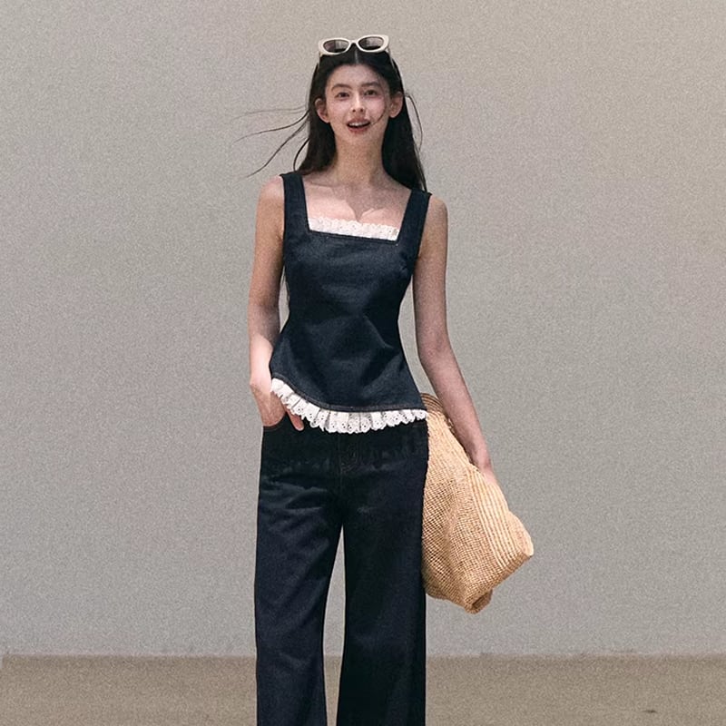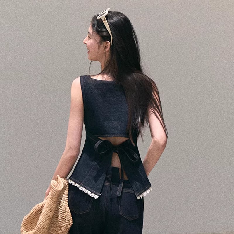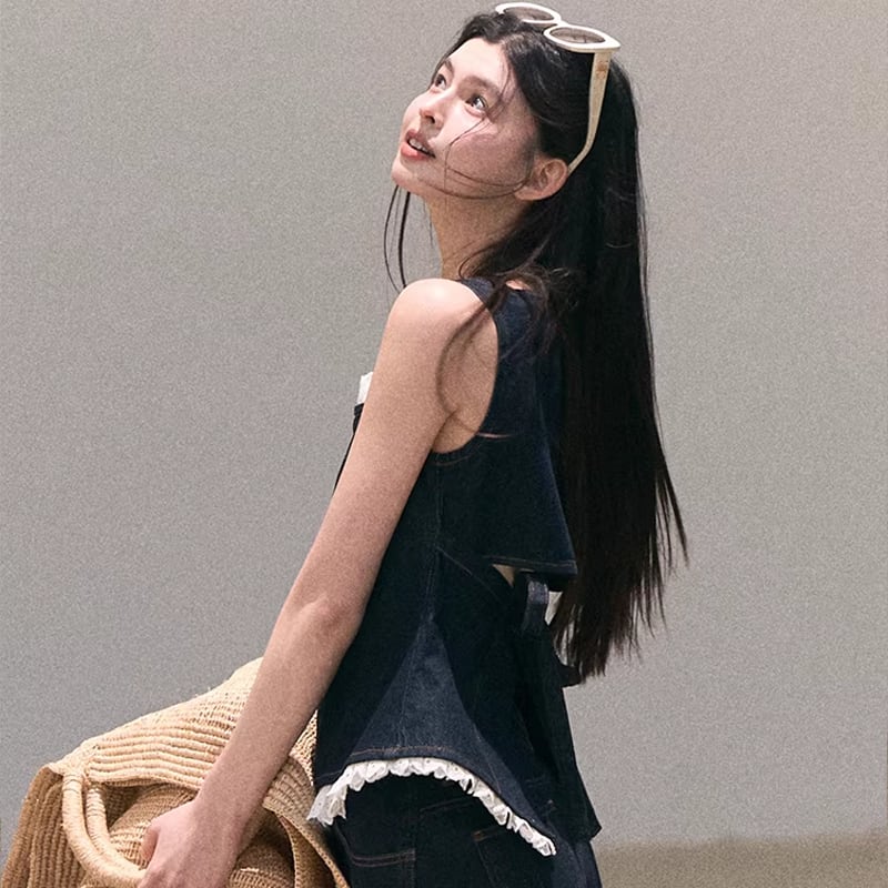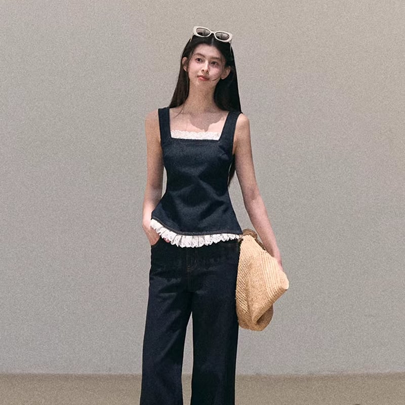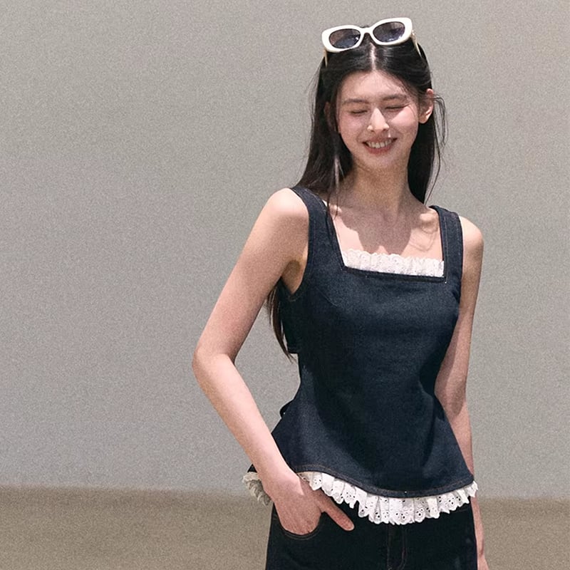 【tops】バックオーポンレースドッキングデニムキャミソール Q8472