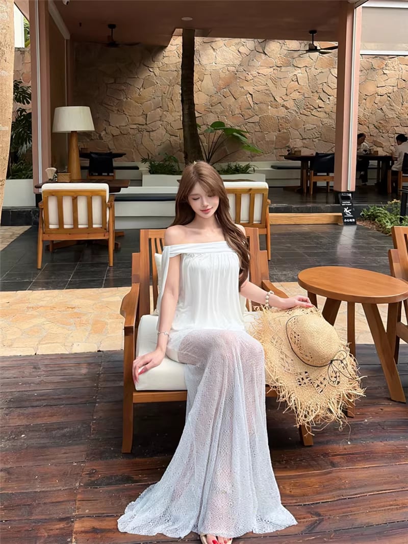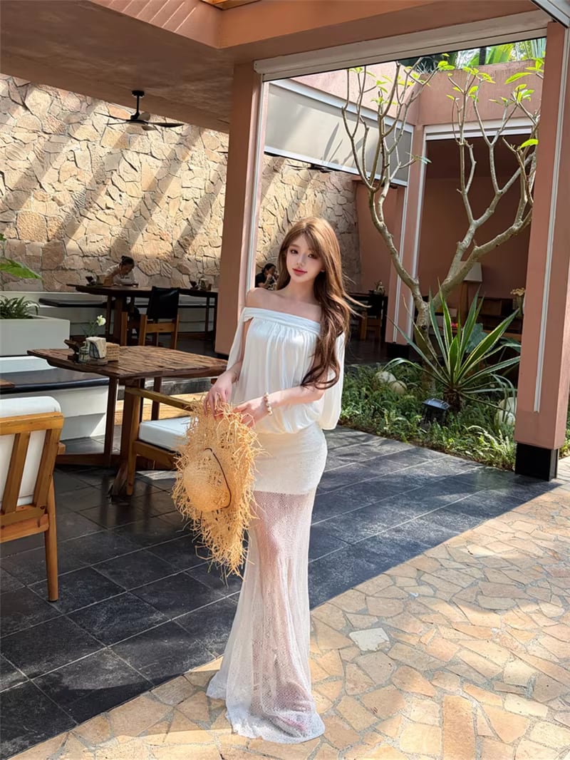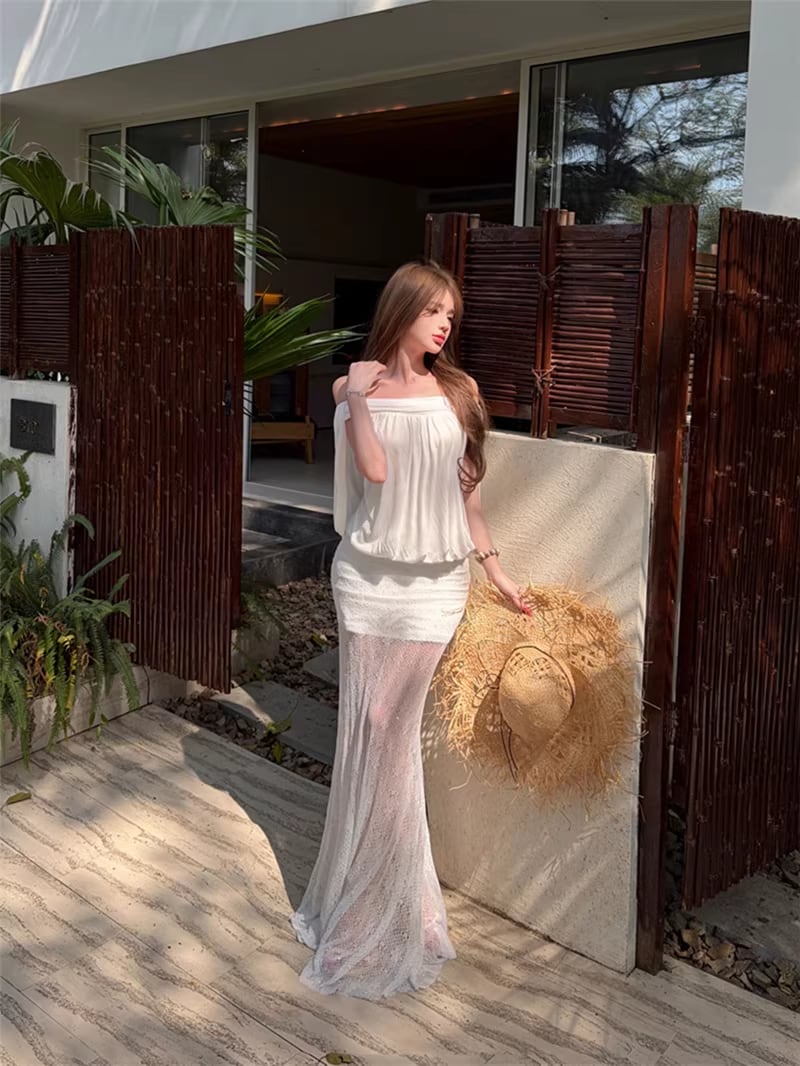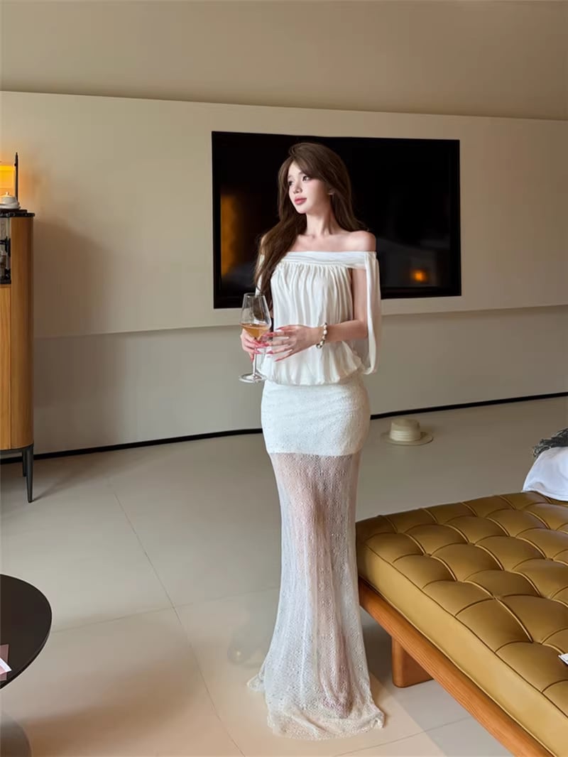 【set】オフショルダートップス×透け感レースロングスカートセット Q8479