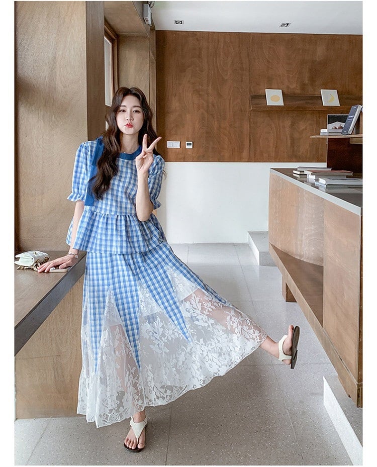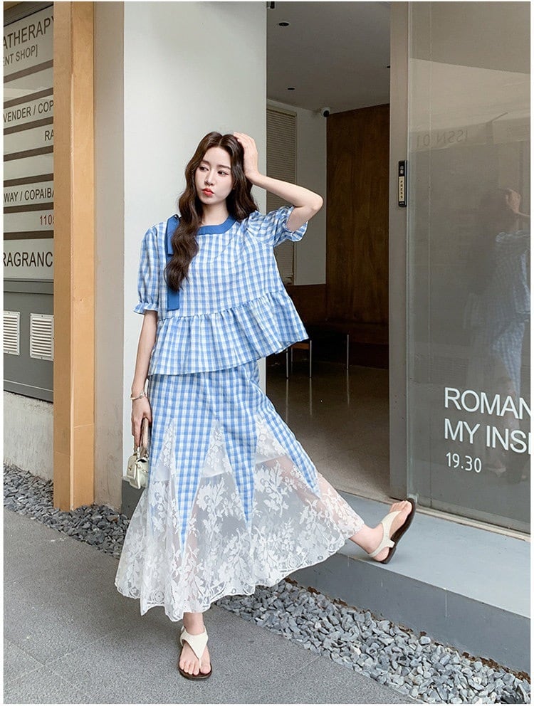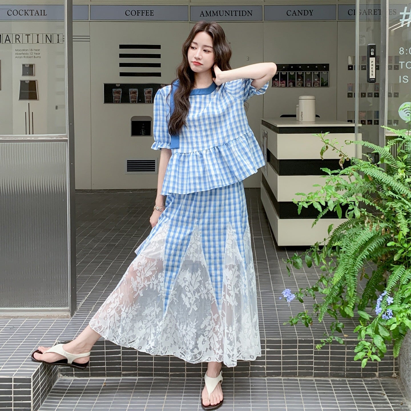 【set】 ペプラムブラウス×レースドッキングスカートチェックセット K0555