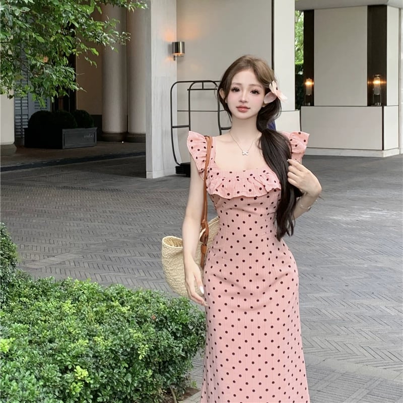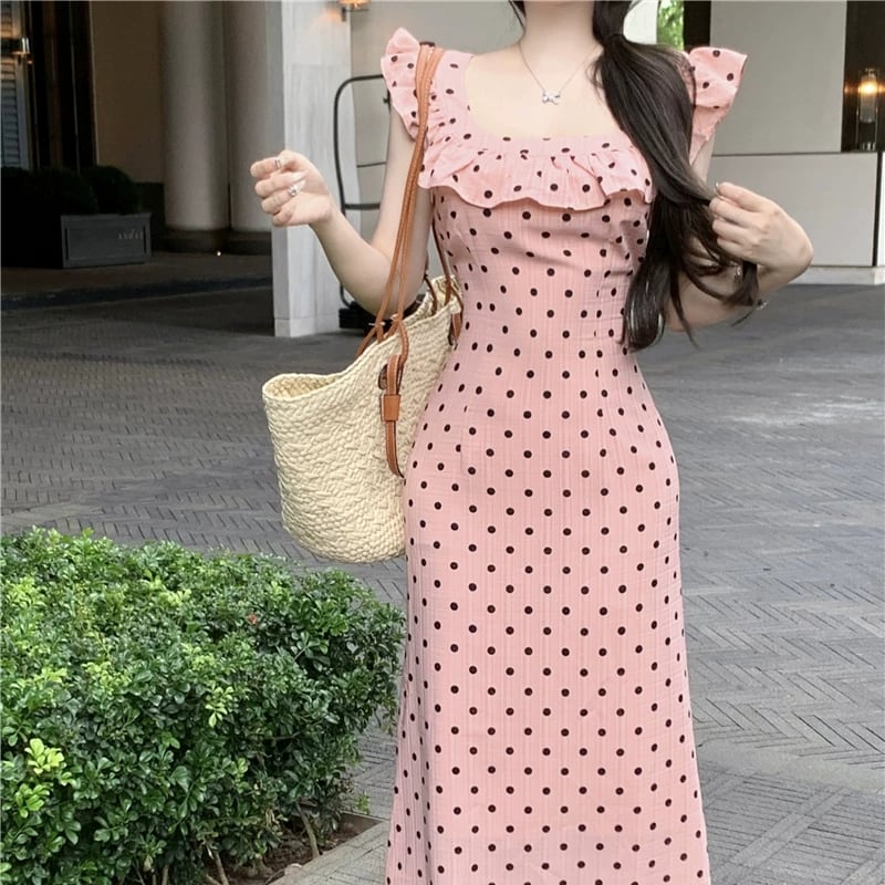【dress】ギャザーフリルドット柄ロングワンピース Q8509