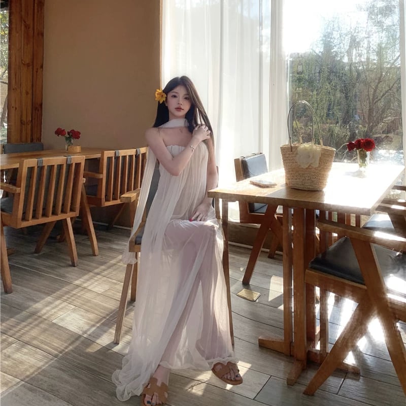 【dress】スカーフ付きシアーチュールチューブワンピース Q8511