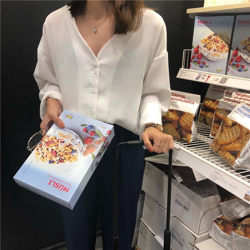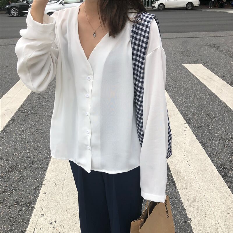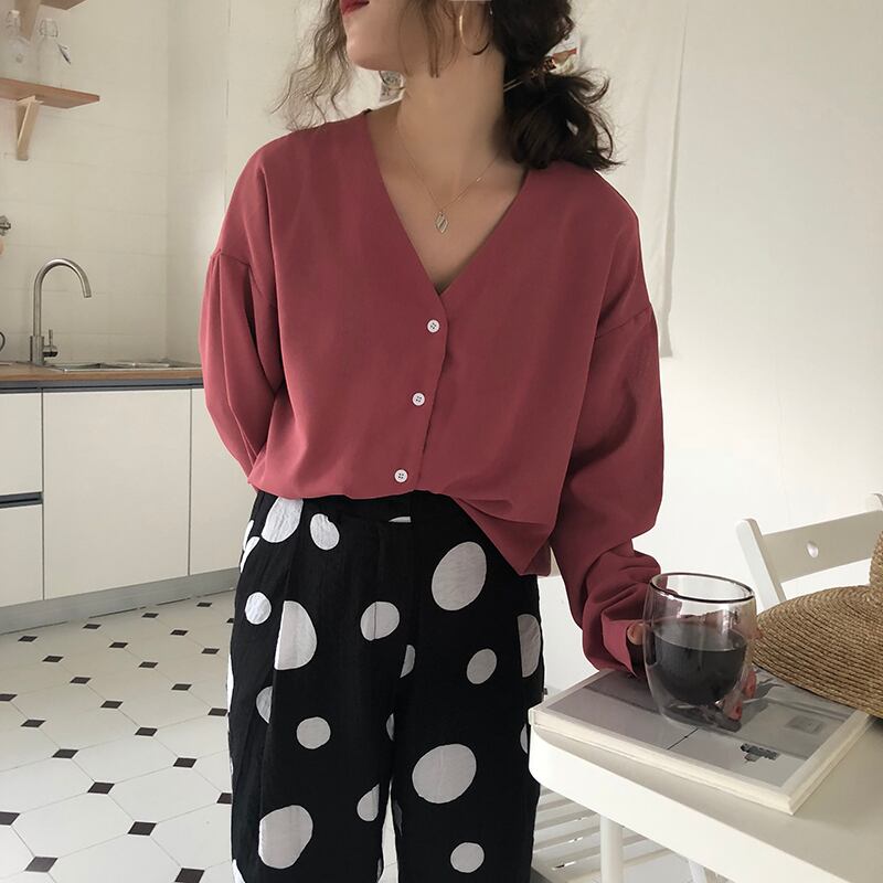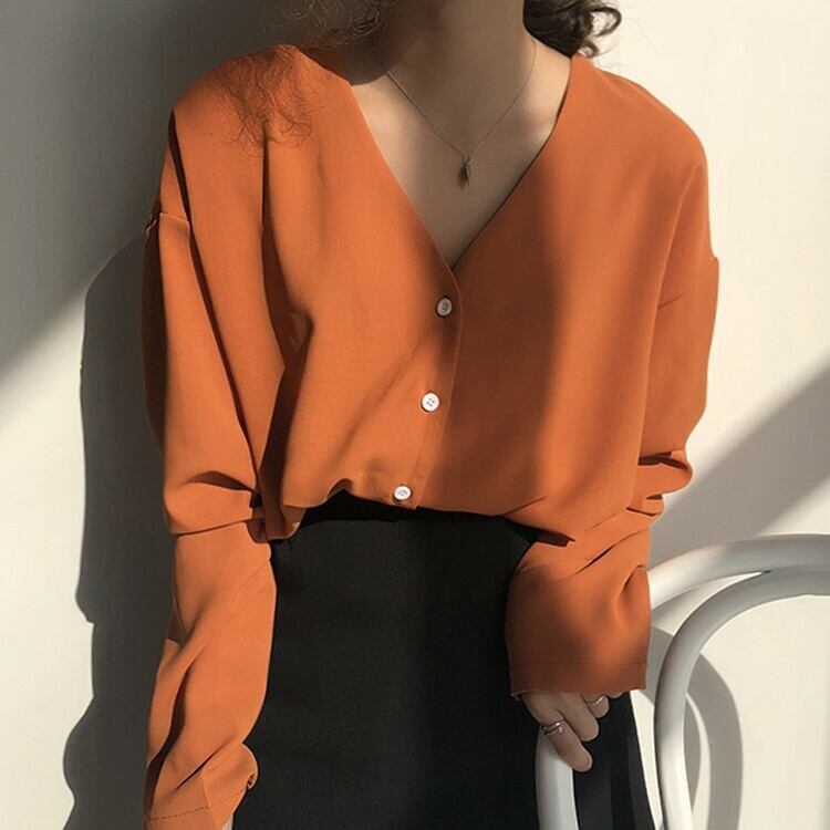【tops】シャツVネック無地通勤カジュアルあか抜け