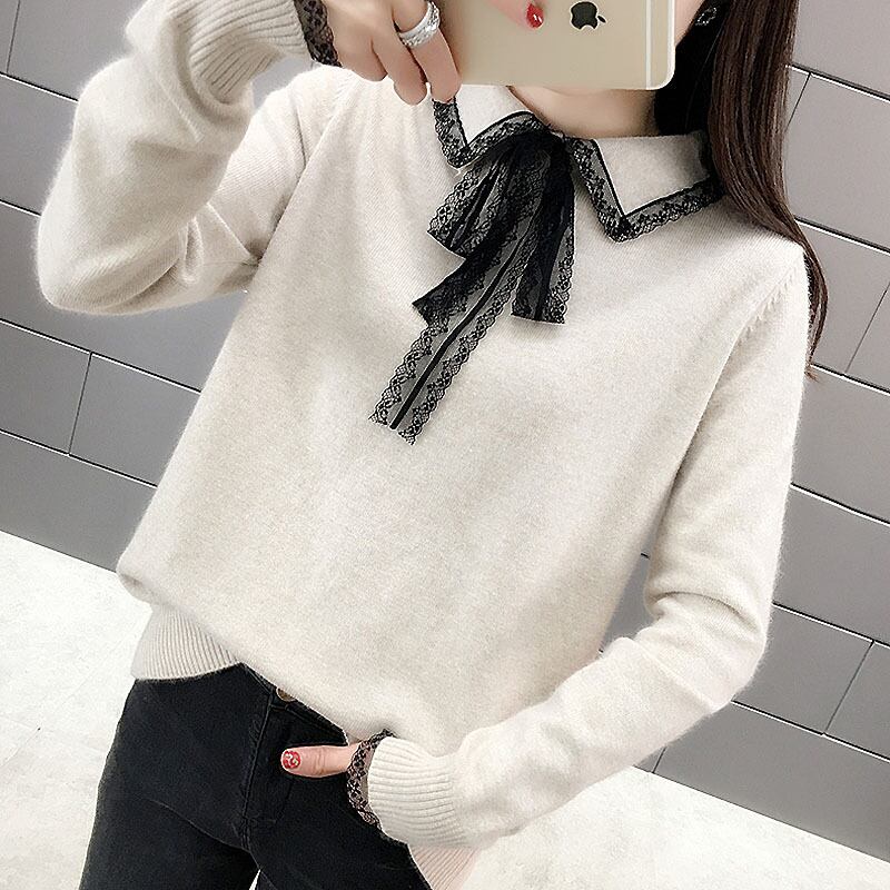 【tops】セーターレースリボン無地折り襟スウィートシンプルトップス