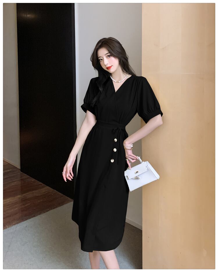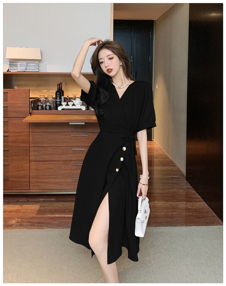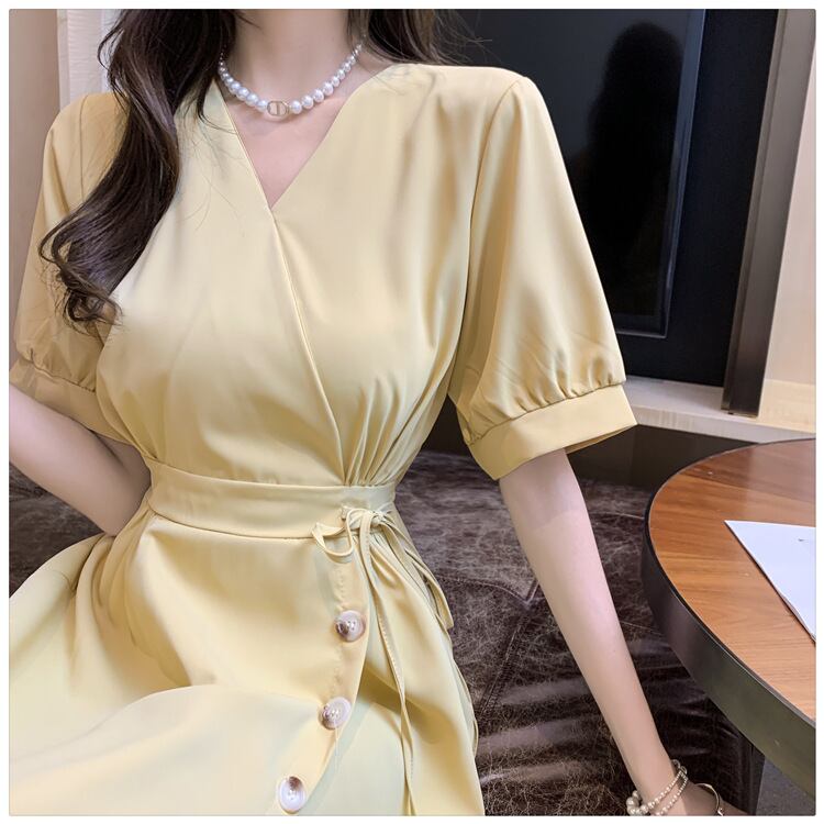 【dress】Vネックボタンデザインスリット優しい雰囲気デートワンピース2色