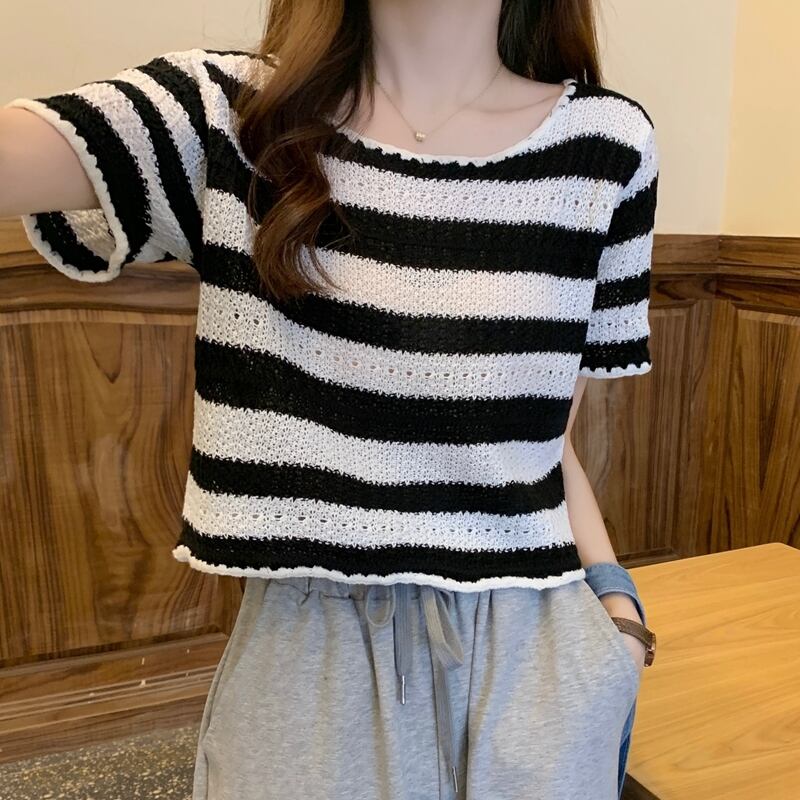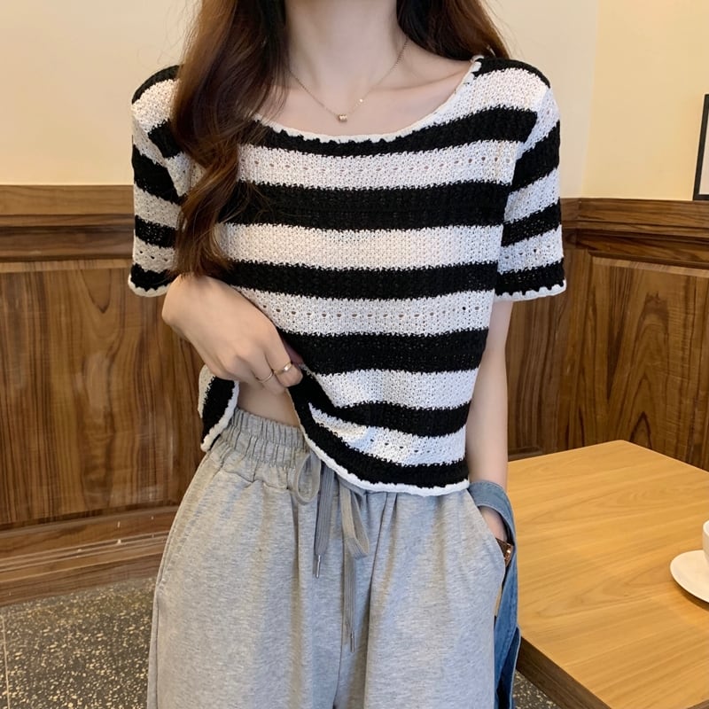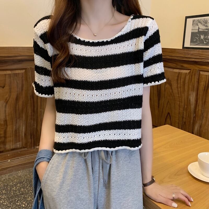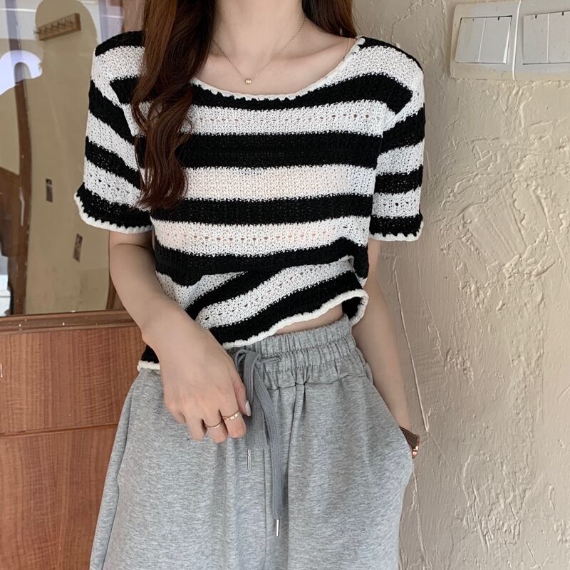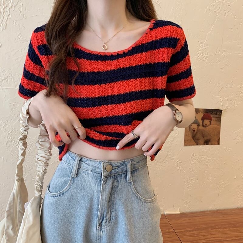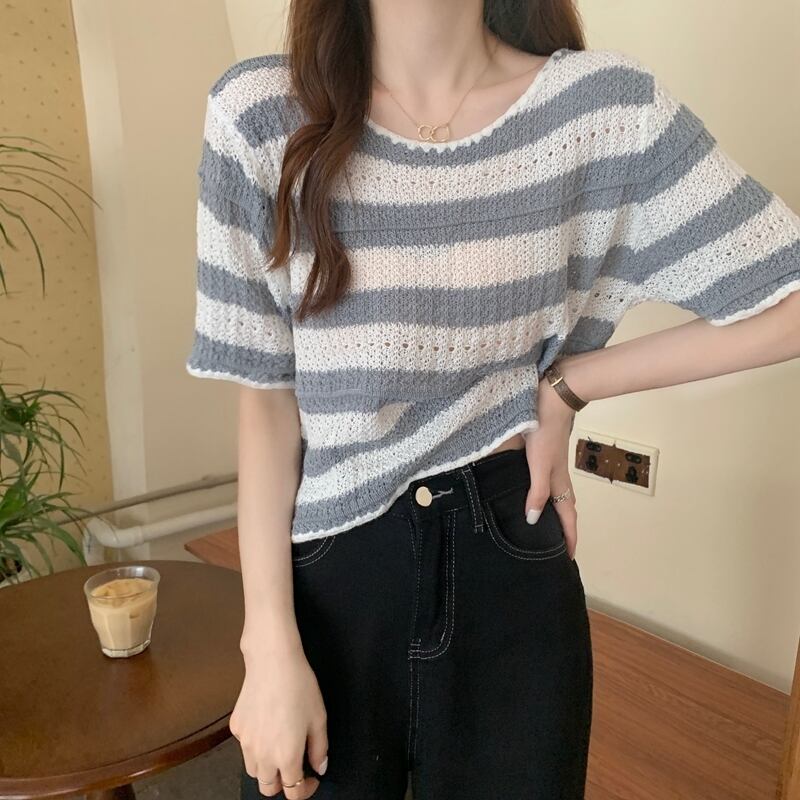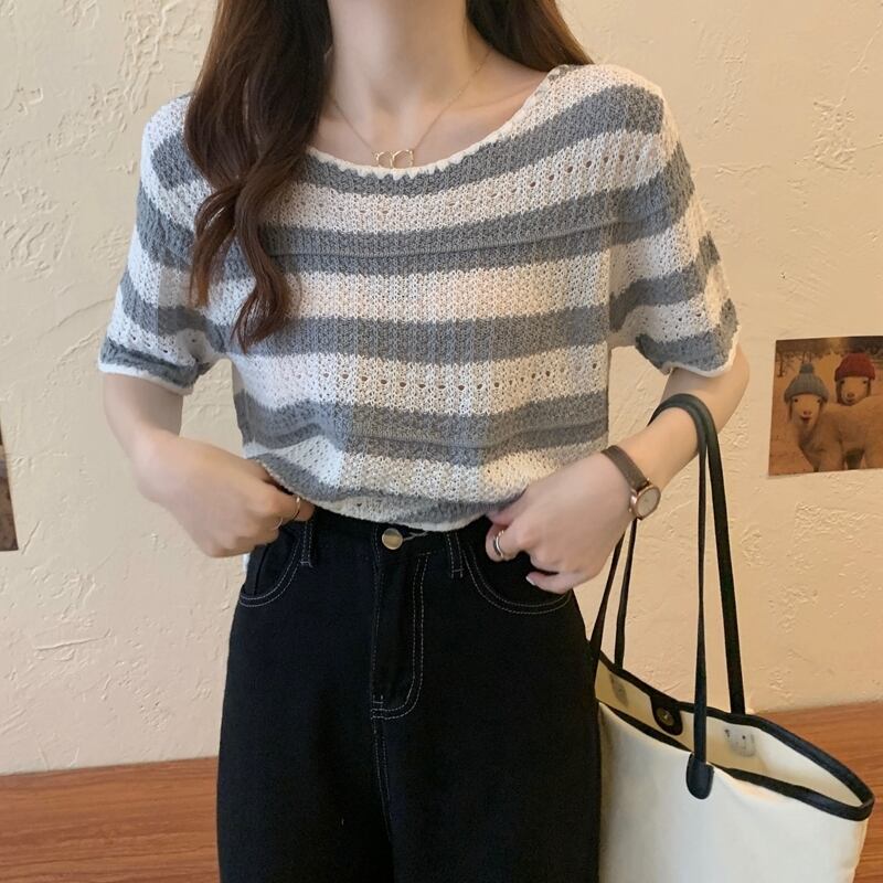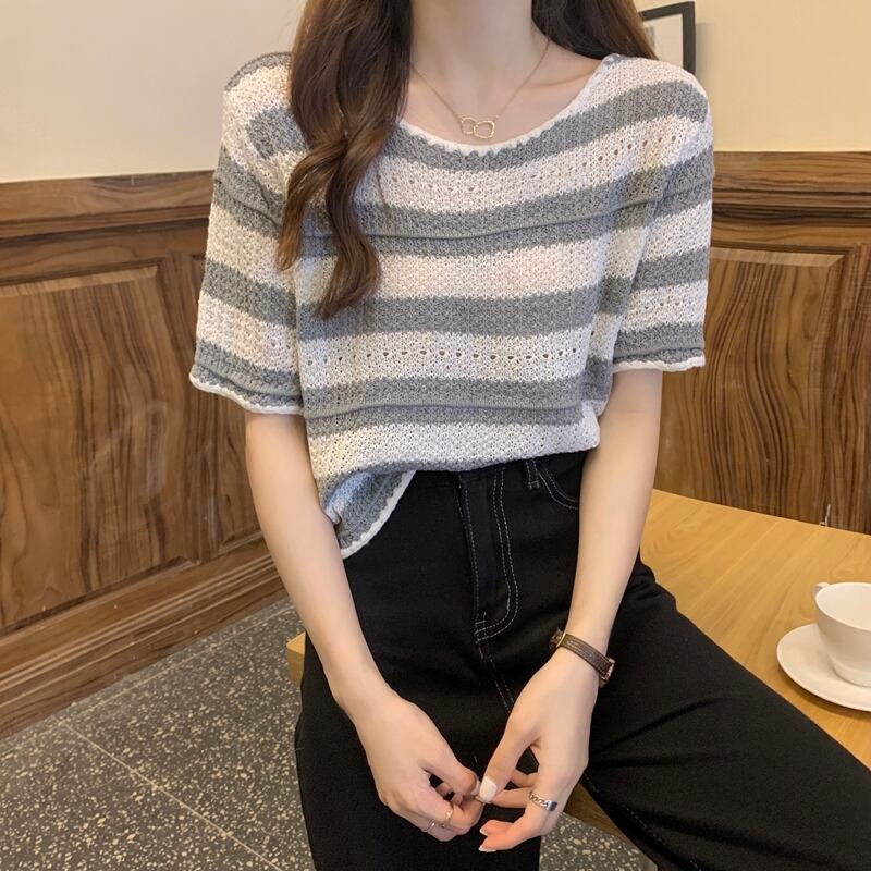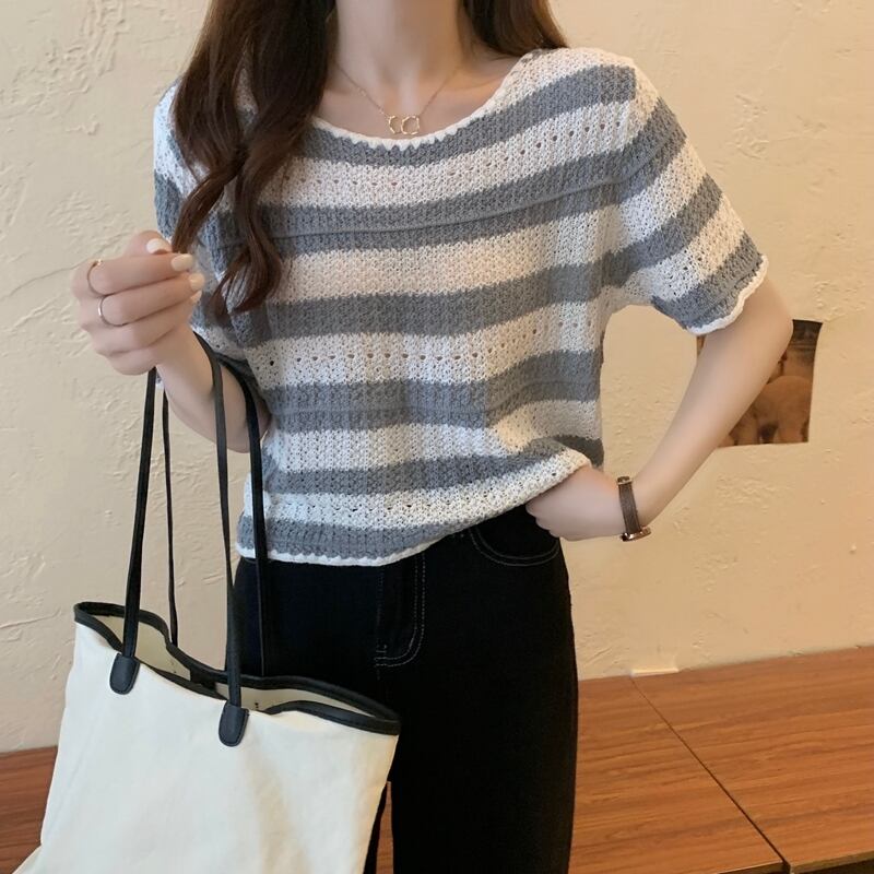 【tops】着回し最強肌触りいい ラウンドネックストライプ柄ニットトップス3色 M-1462