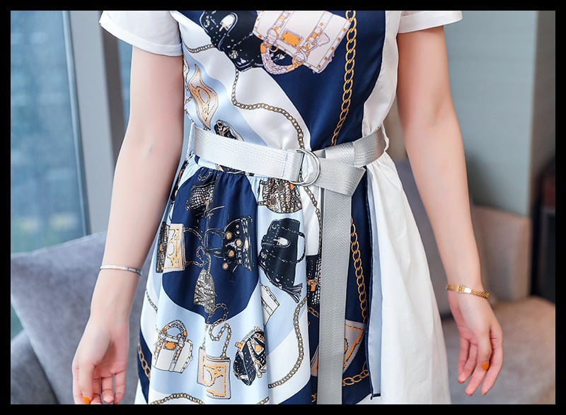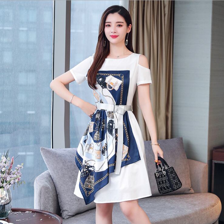 【dress】人気オフショルダープリント切り替えベルト付きデートワンピース2色 N-0309