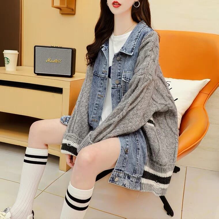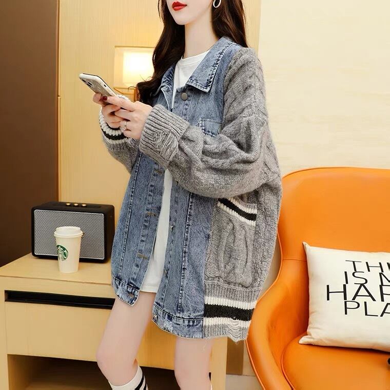 【outer】人気おしゃれ切り替え合わせやすいニットデニムジャケット2色 N-0587