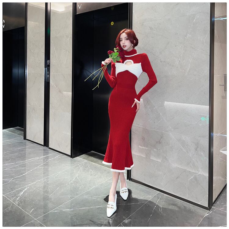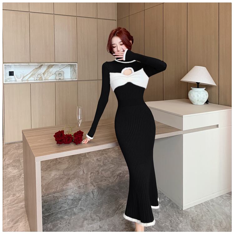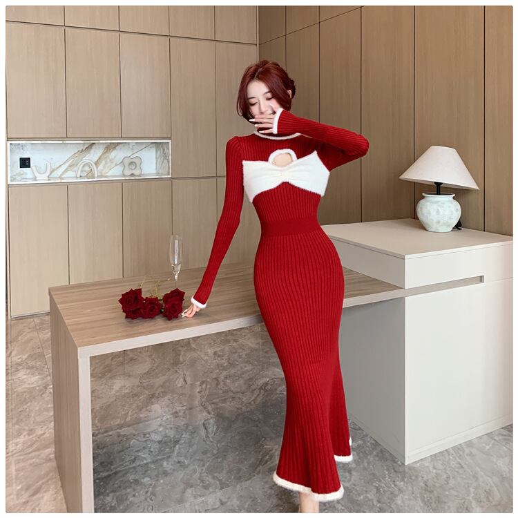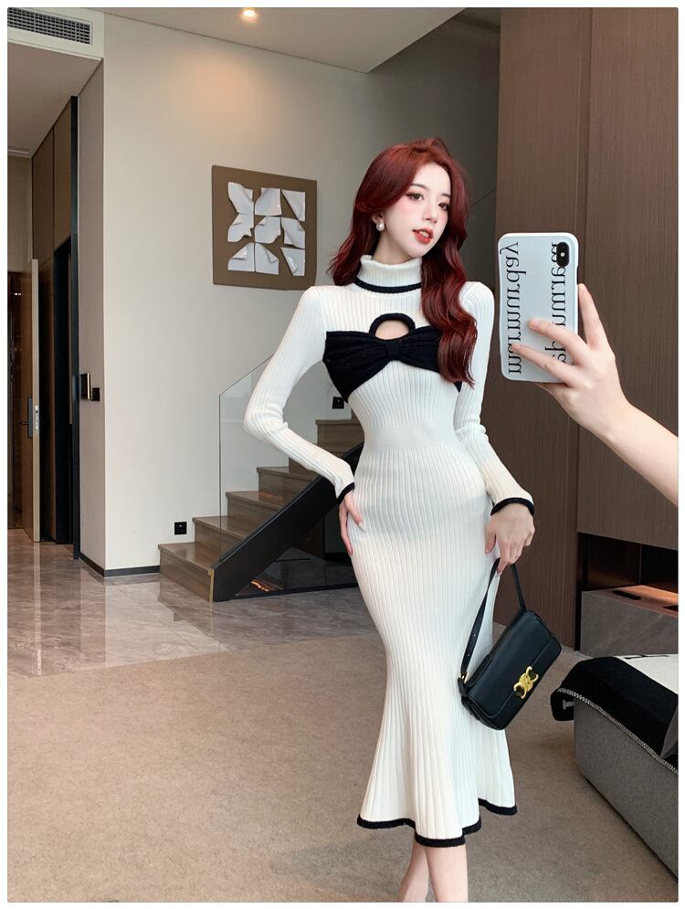 【dress】気質溢れる エレガントリボン付きハイネック3色ニットワンピース3色 M-11795