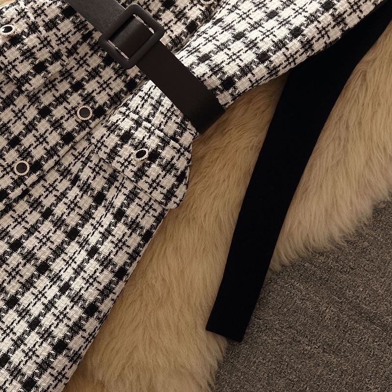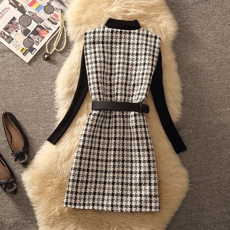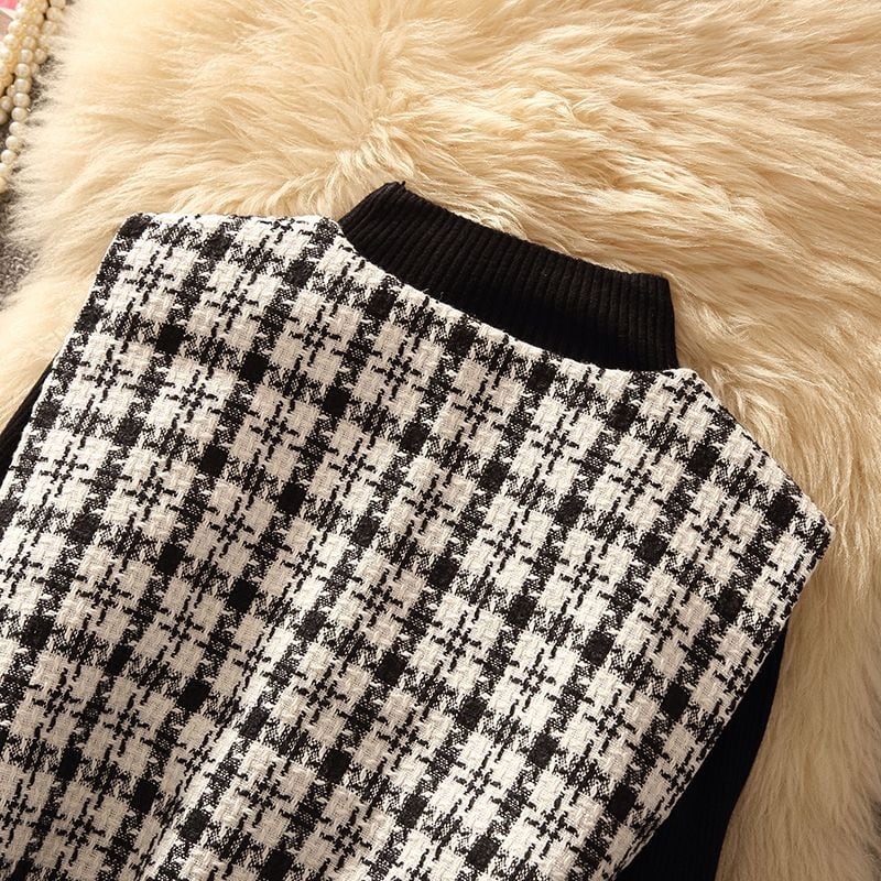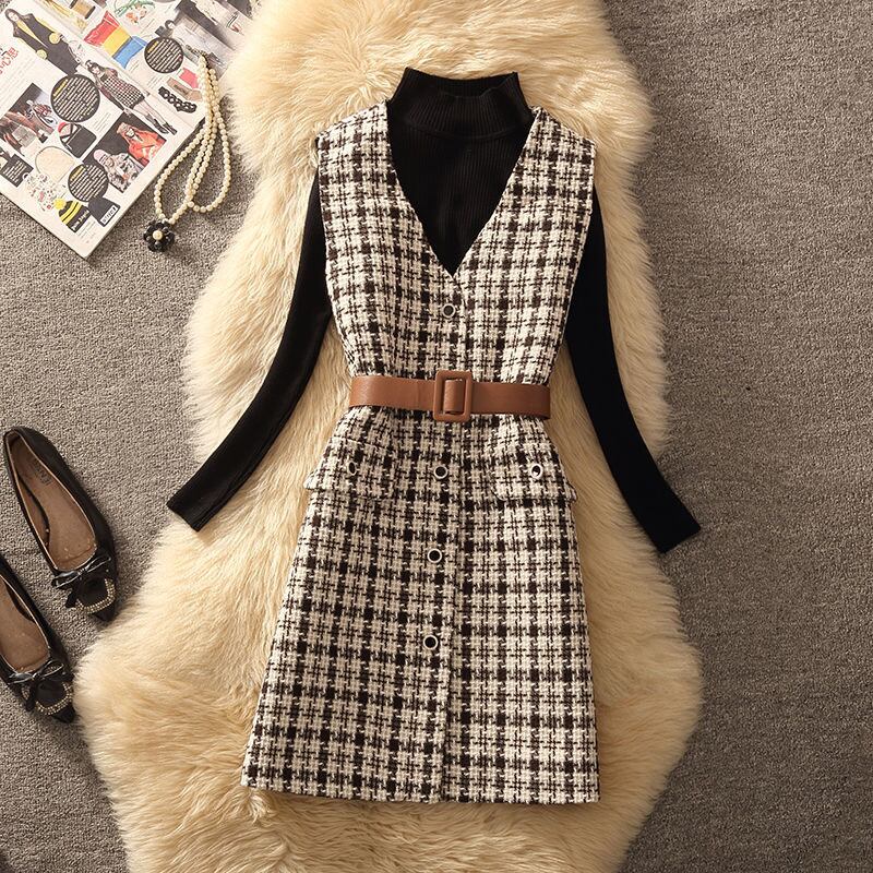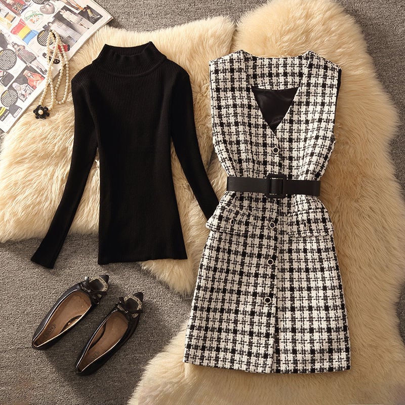 【set】ニットセーター×ツイードベストワンピースセット N2106