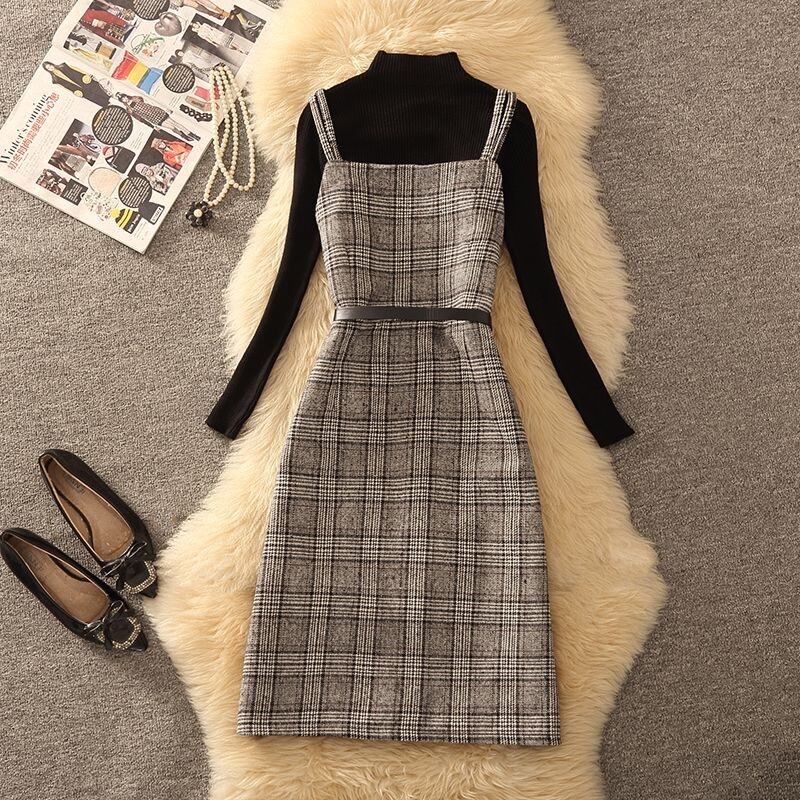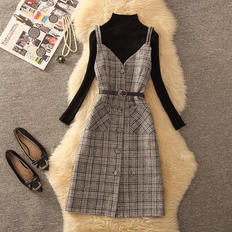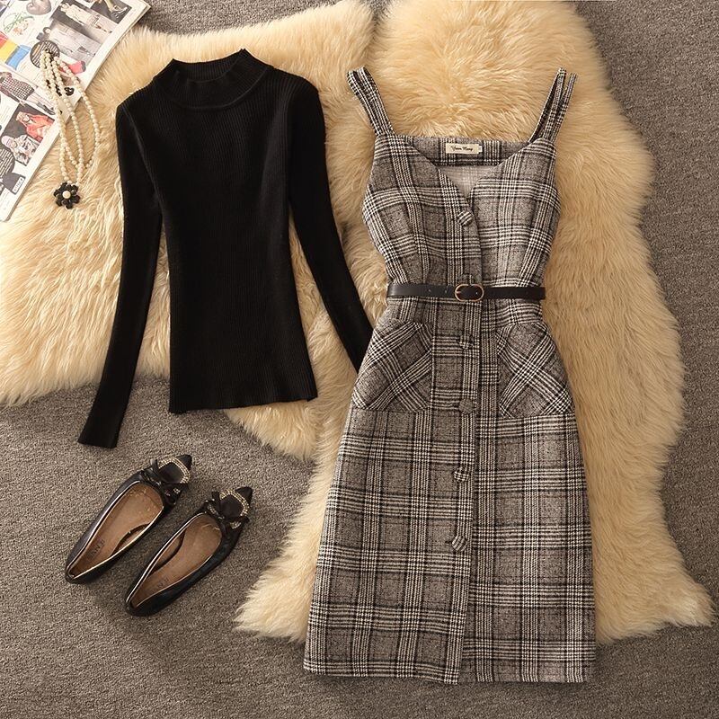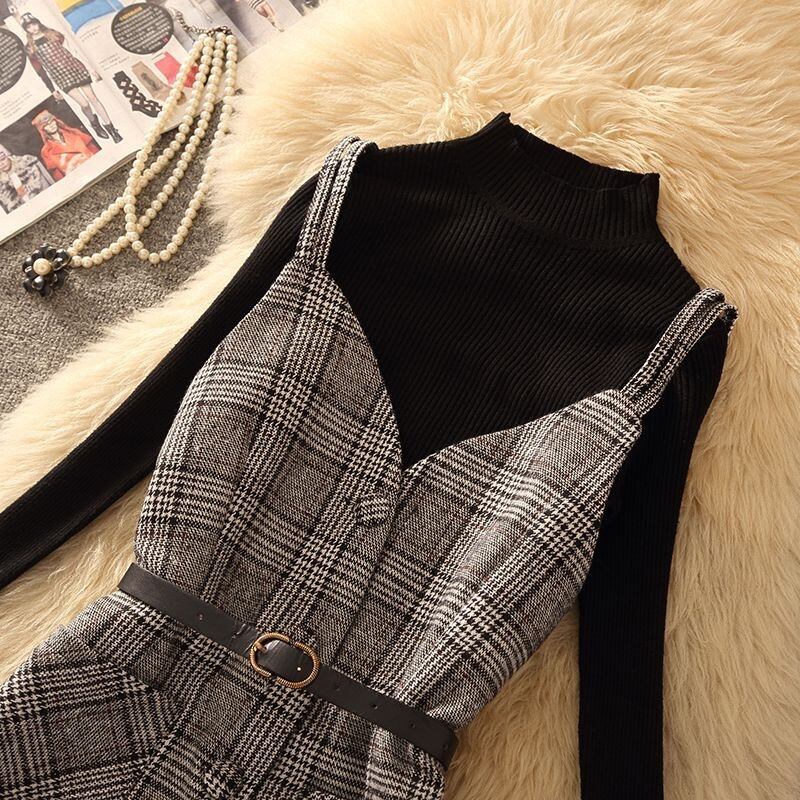 【set】ニットセーター×チェック柄キャミワンピースセット N2260