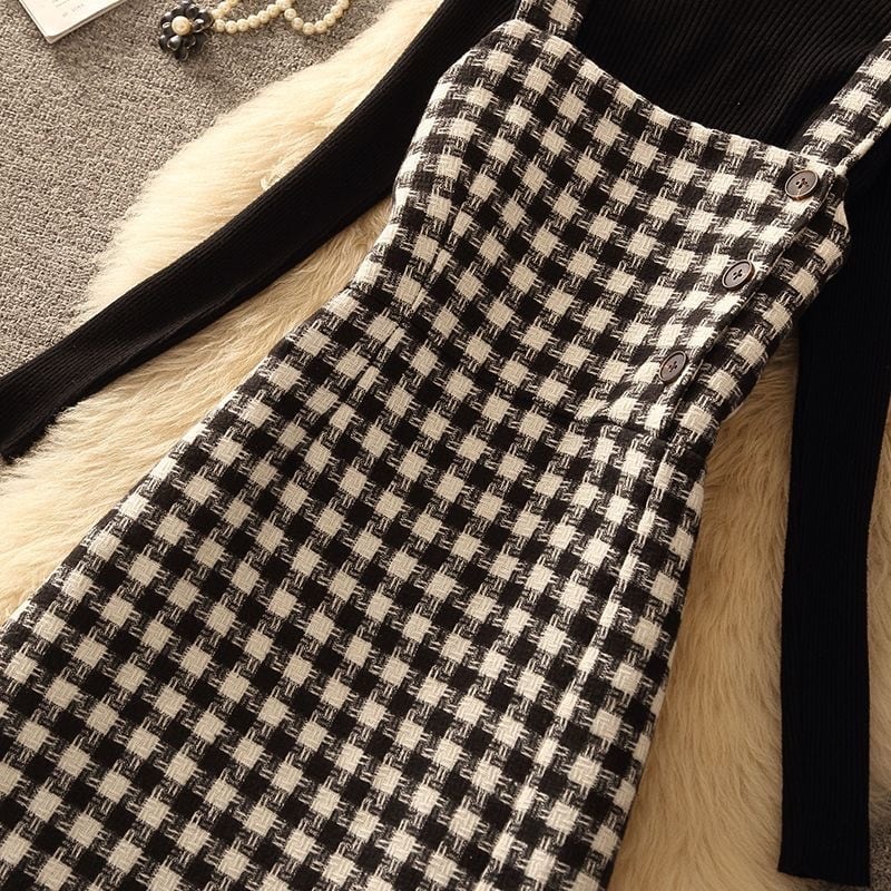 【set】ニットセーター×スリットチェック柄ツイードワンピースセット N2263