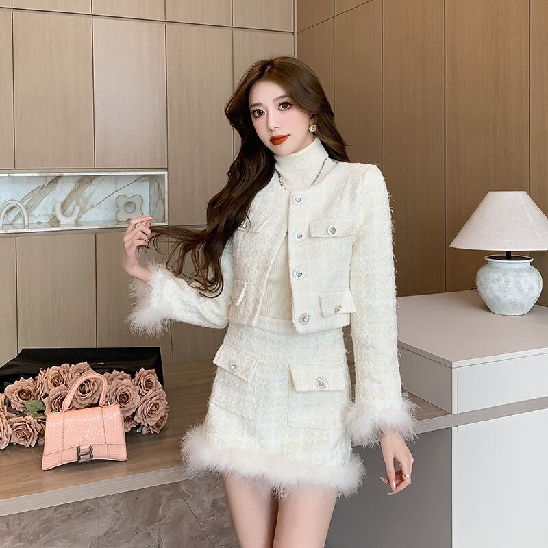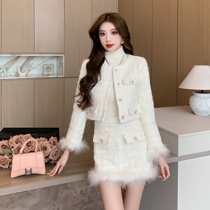 【set】ファー付きショートジャケット×スカートセット M19356