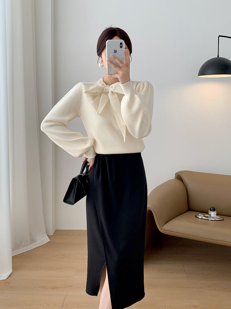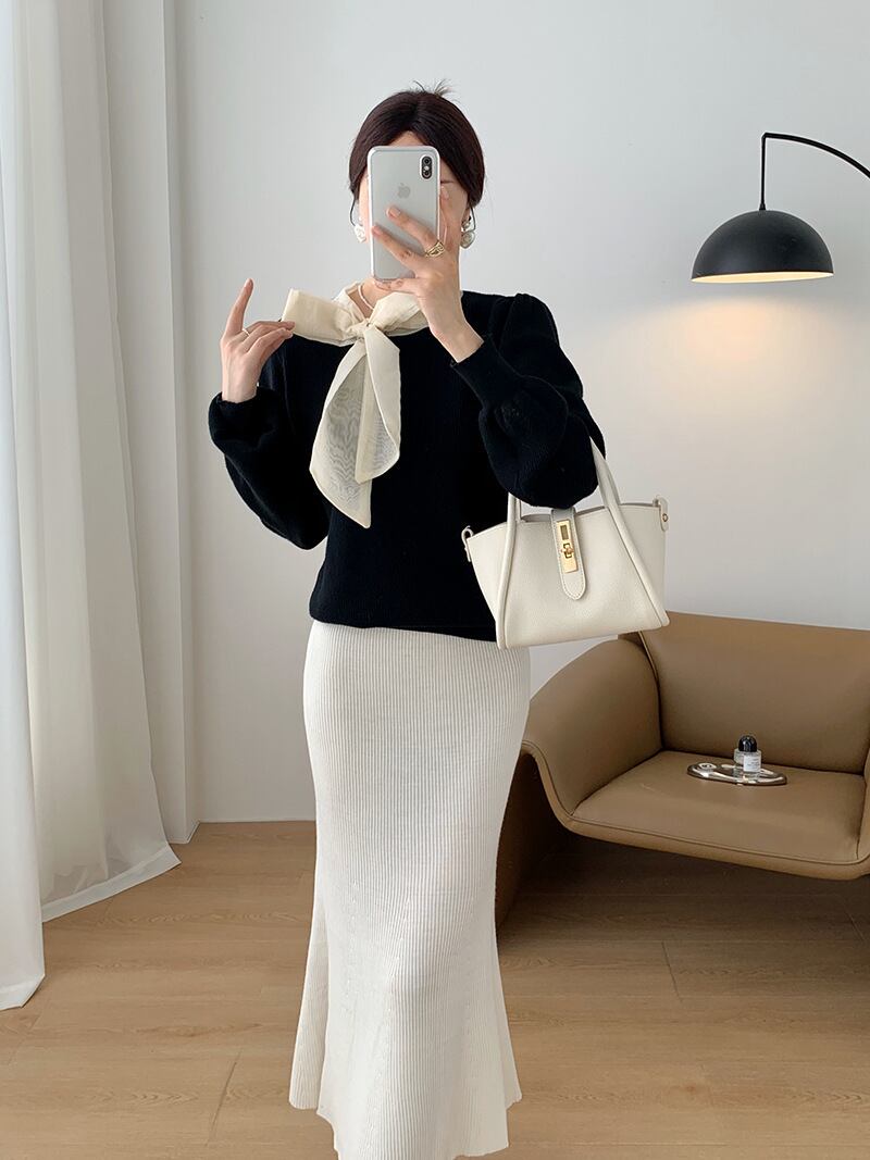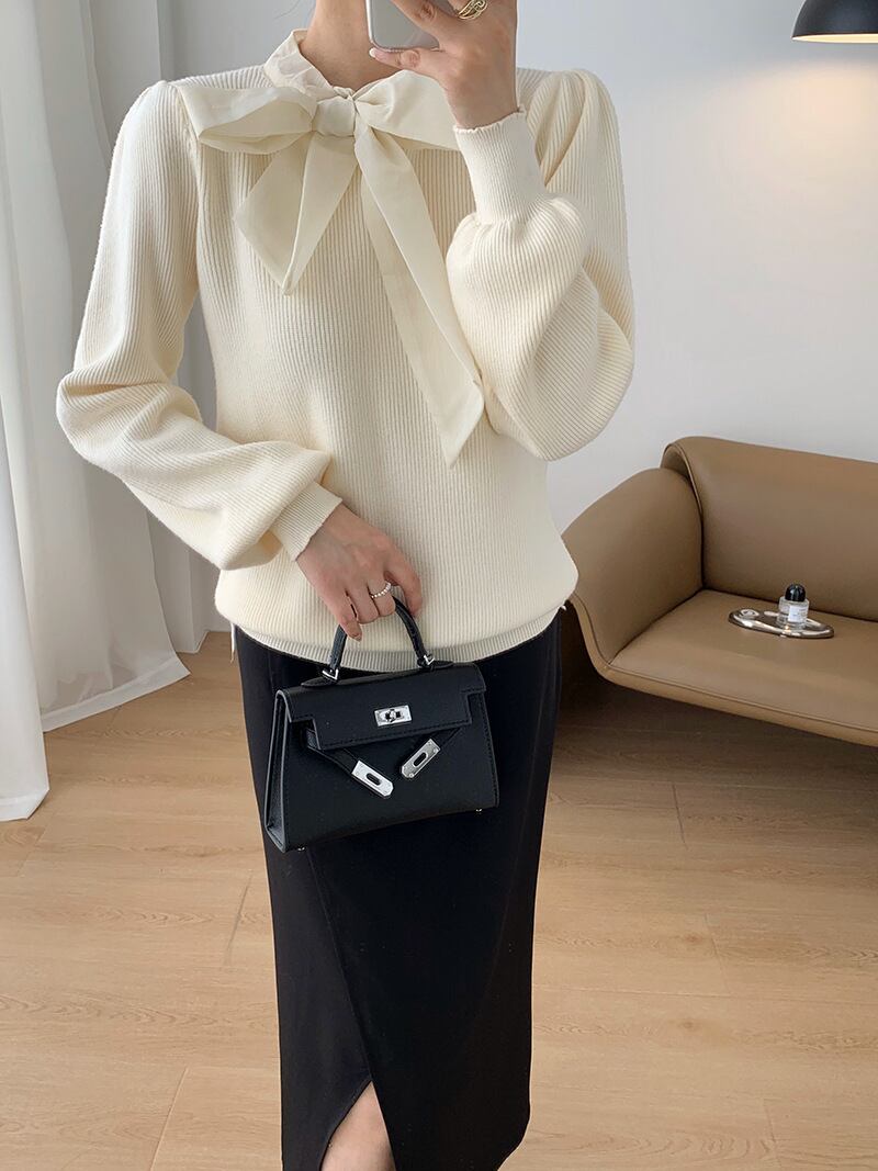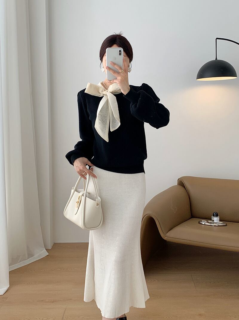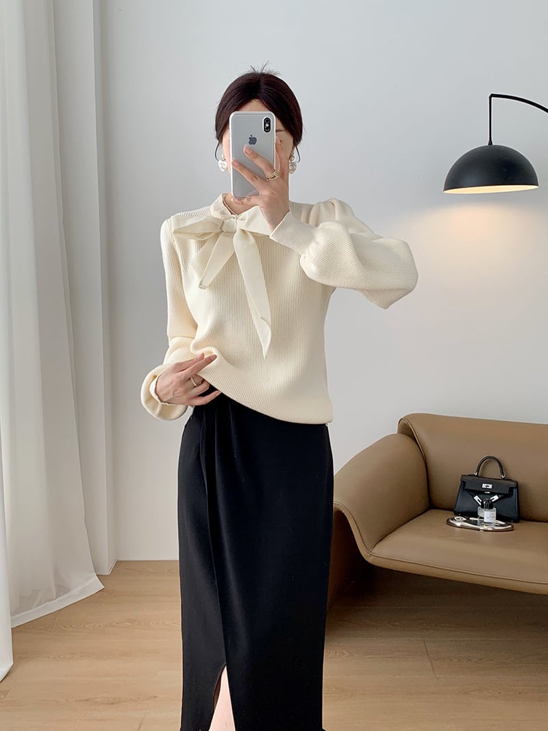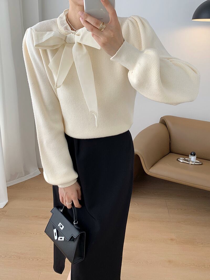 【tops】リボン付きニットプルオーバー M19636