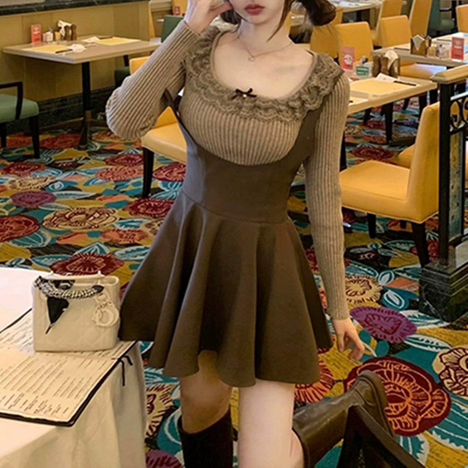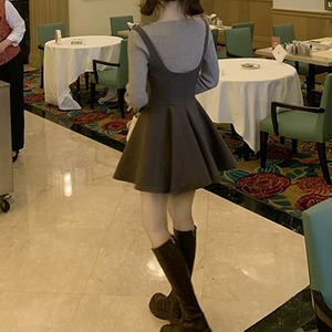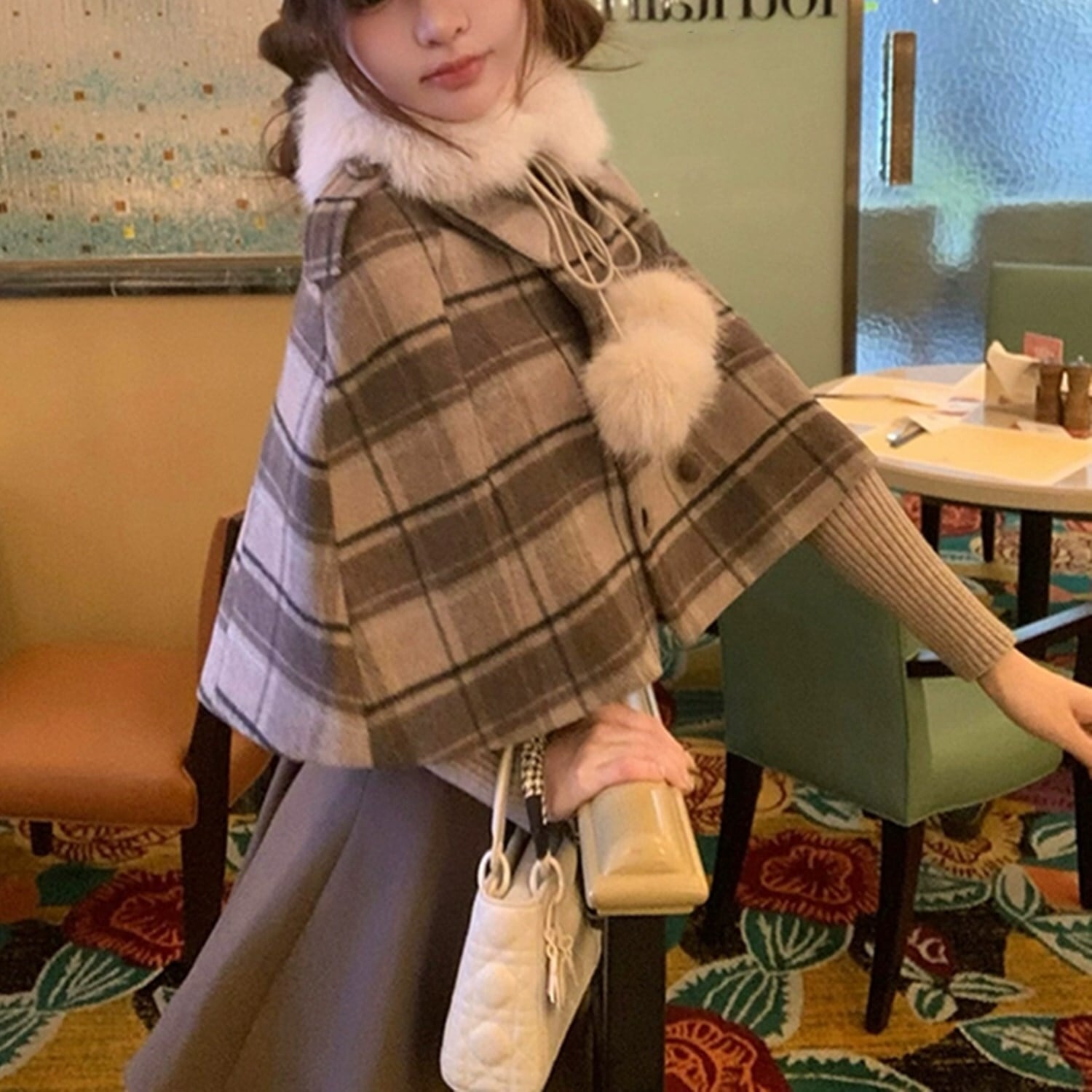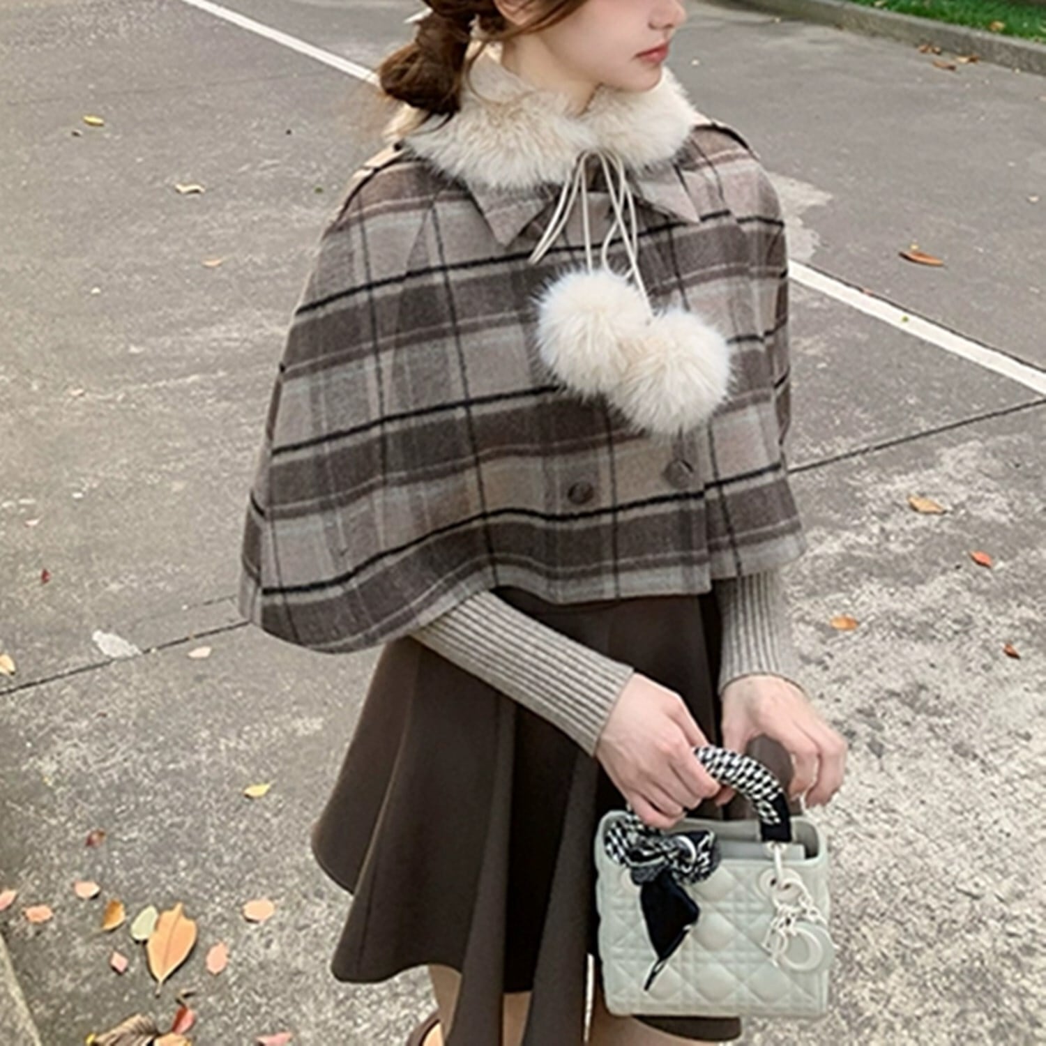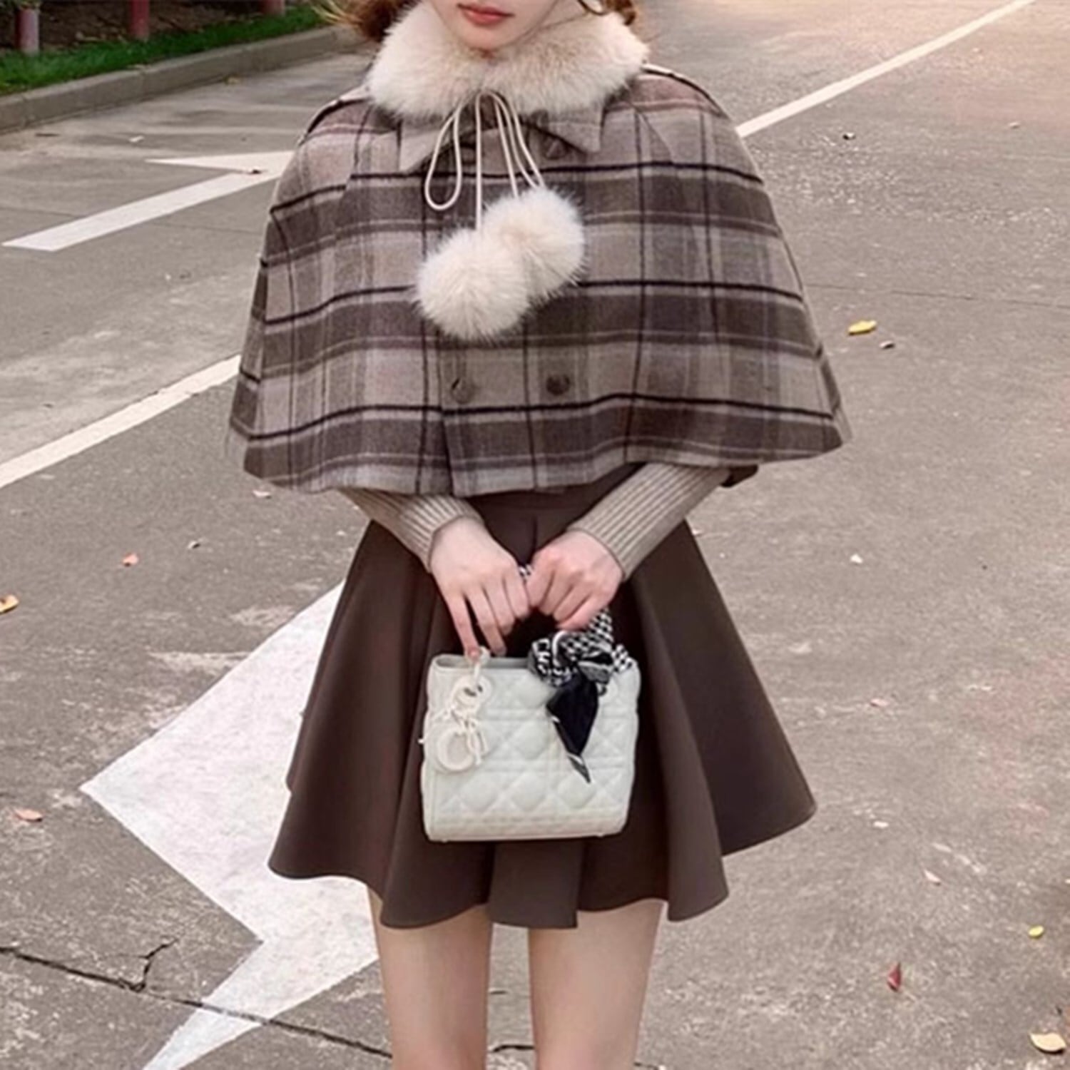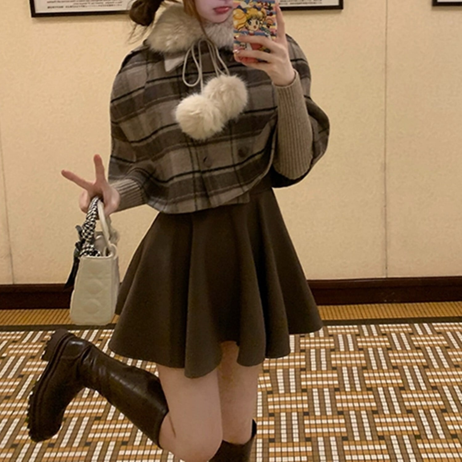 【set】ファー付きチェック柄ケープ×サロペットスカートセット N2349