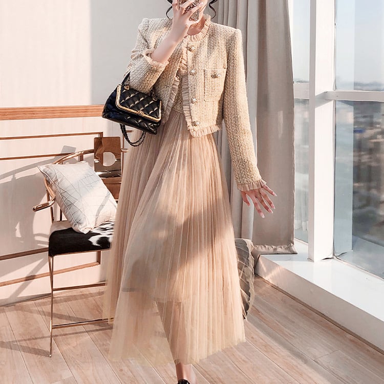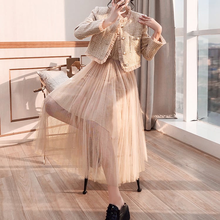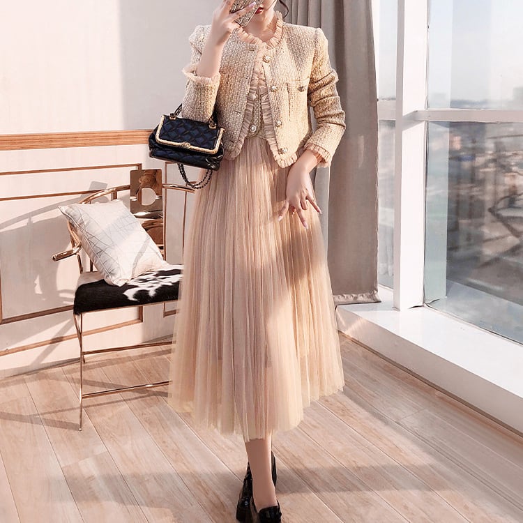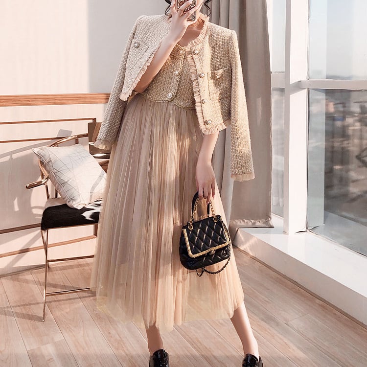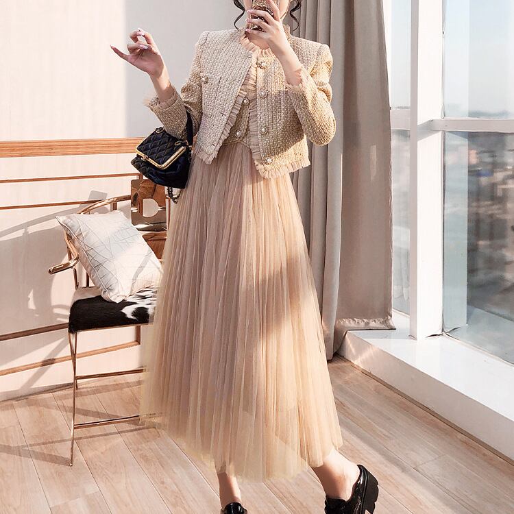 【set】ツイードジャケット×チュール切り替えキャミワンピースセット N2354